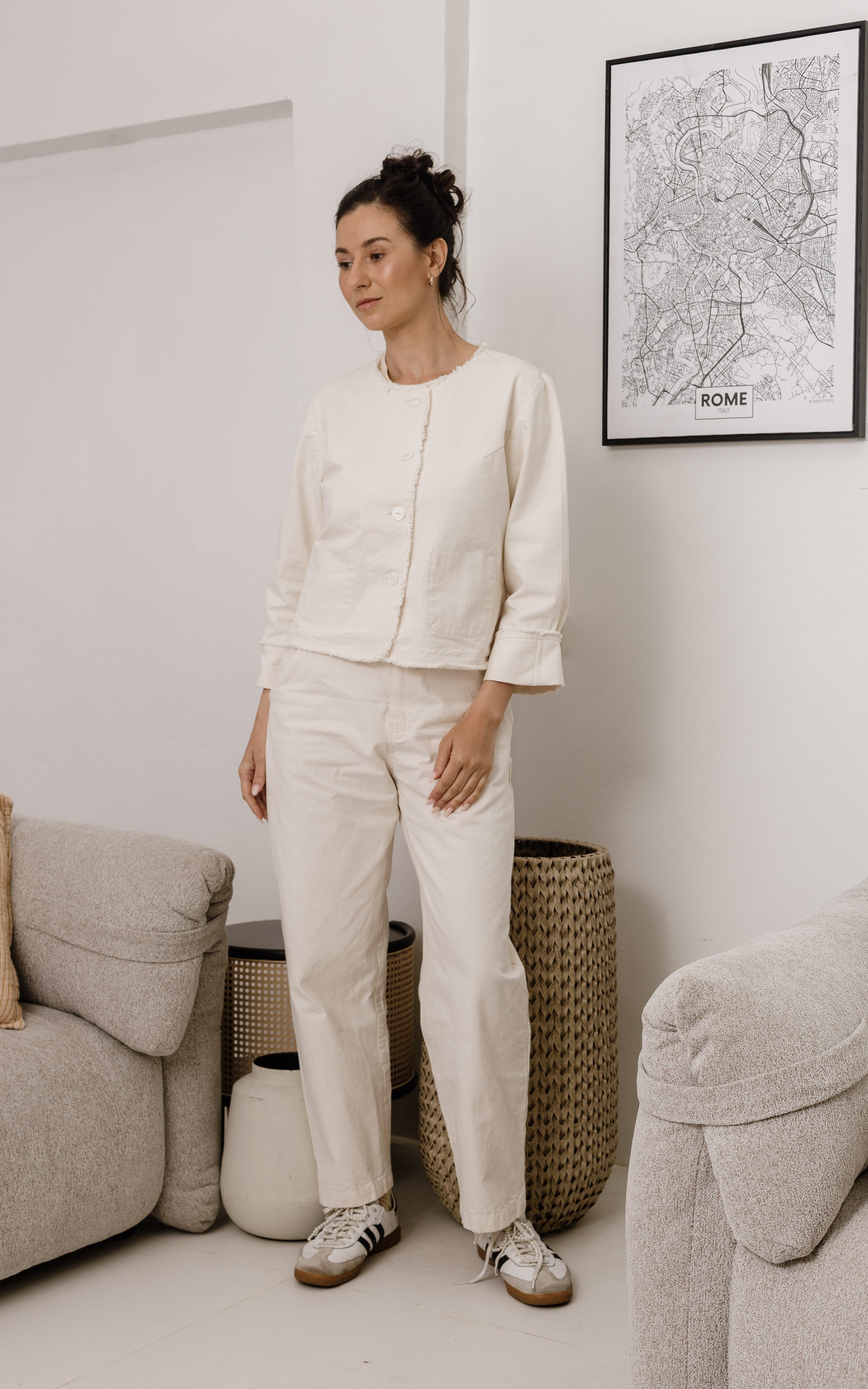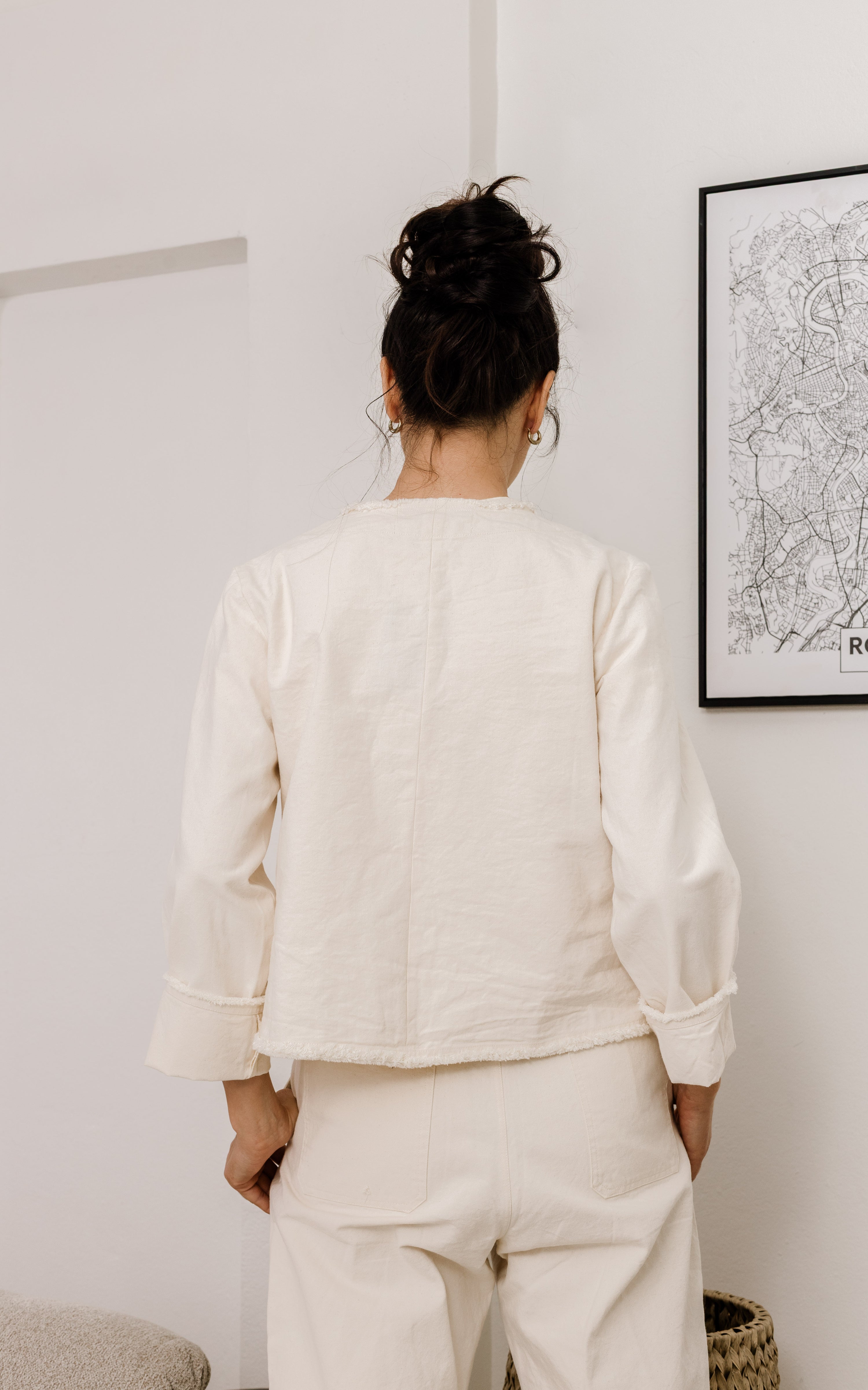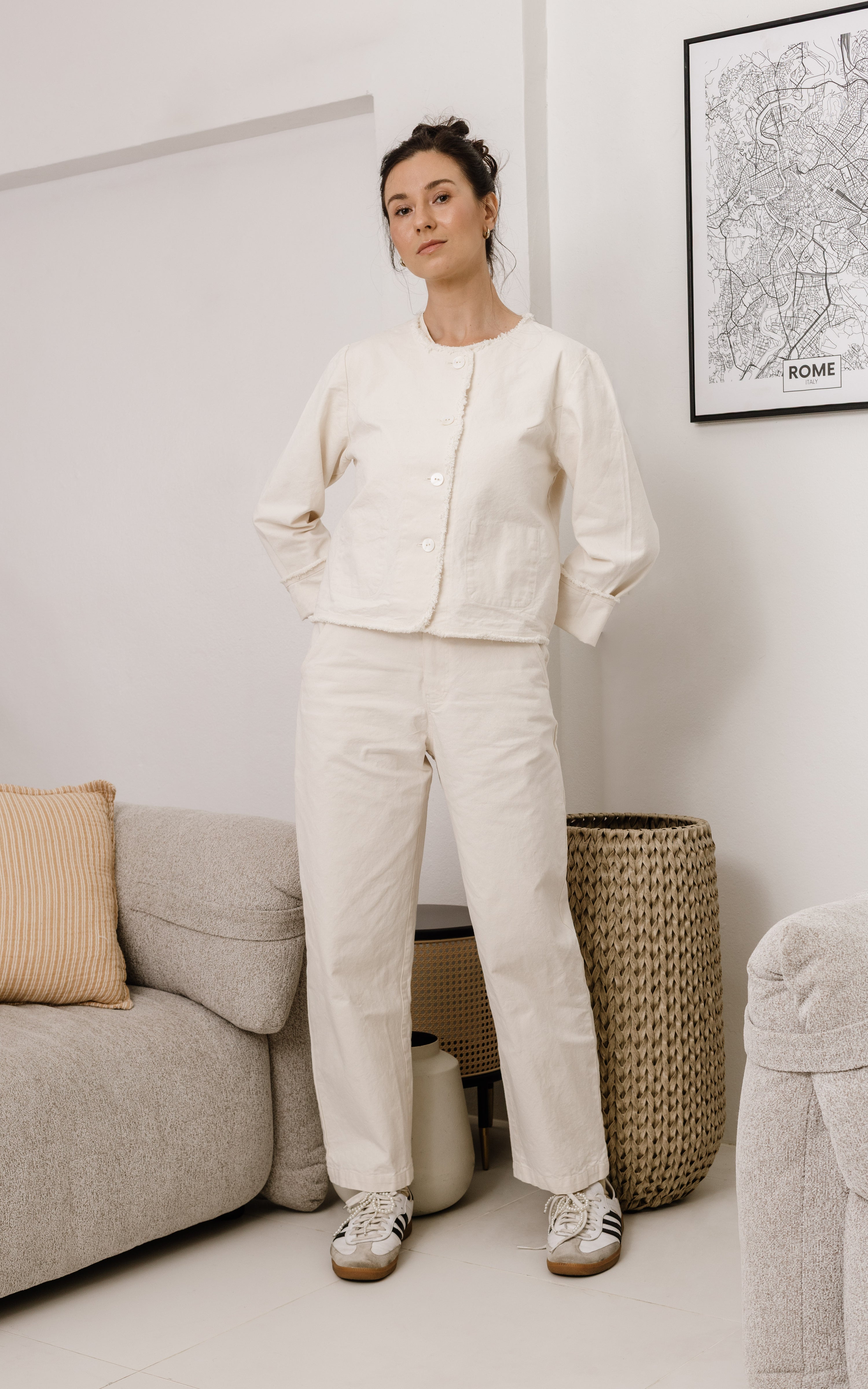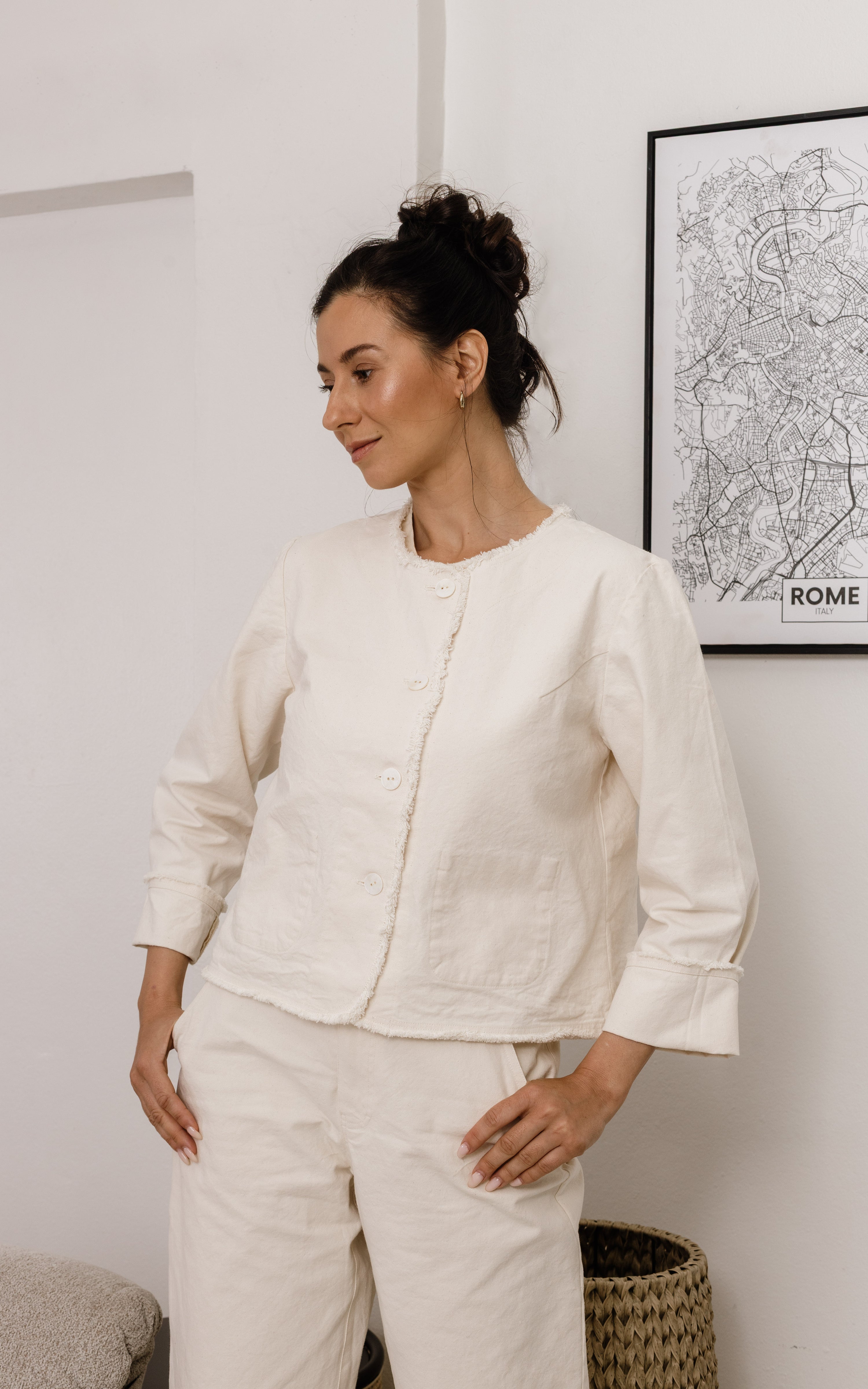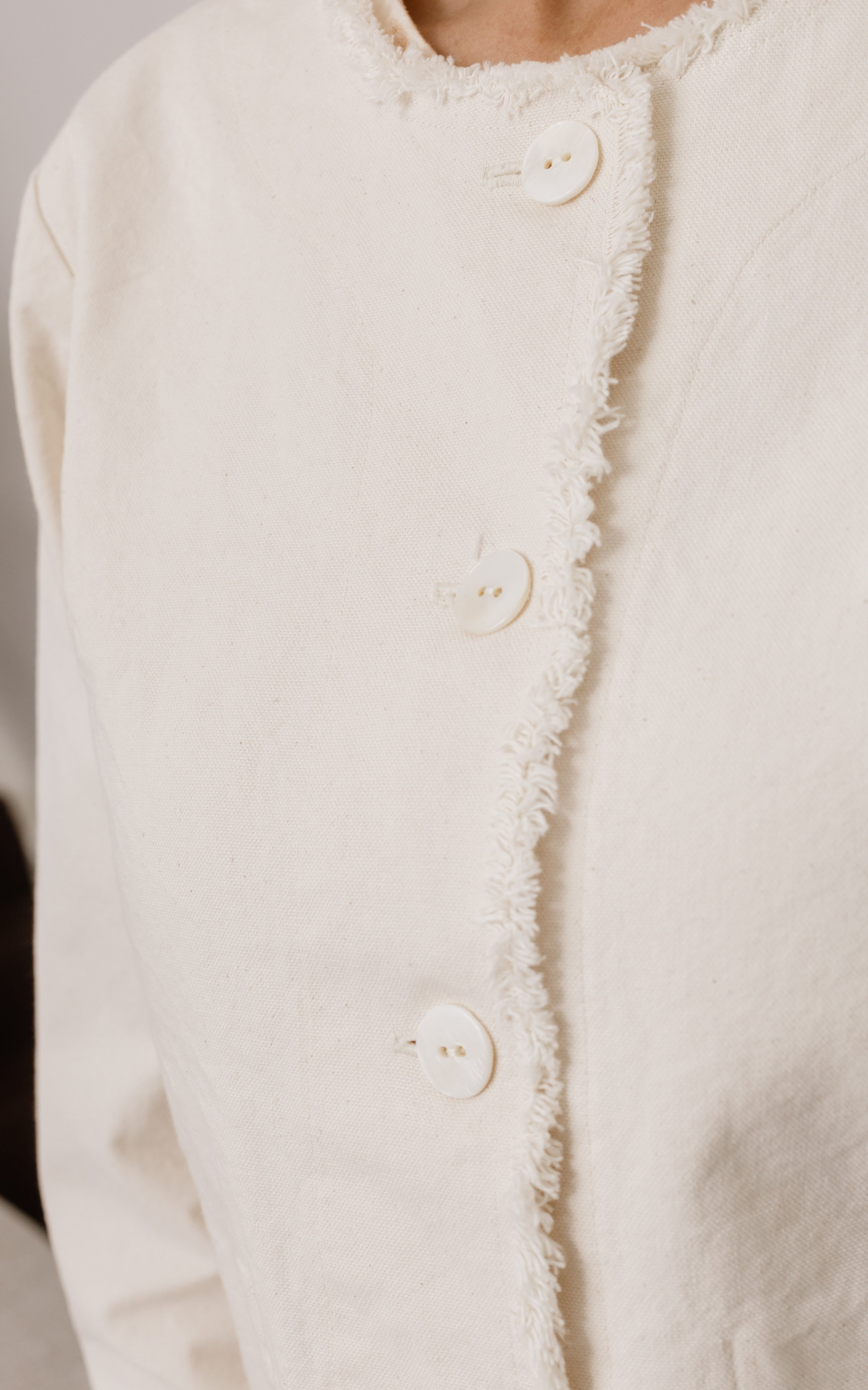 עשויי בד קנבס, עם אלמנט של קצוות פרומים בקצותיו.