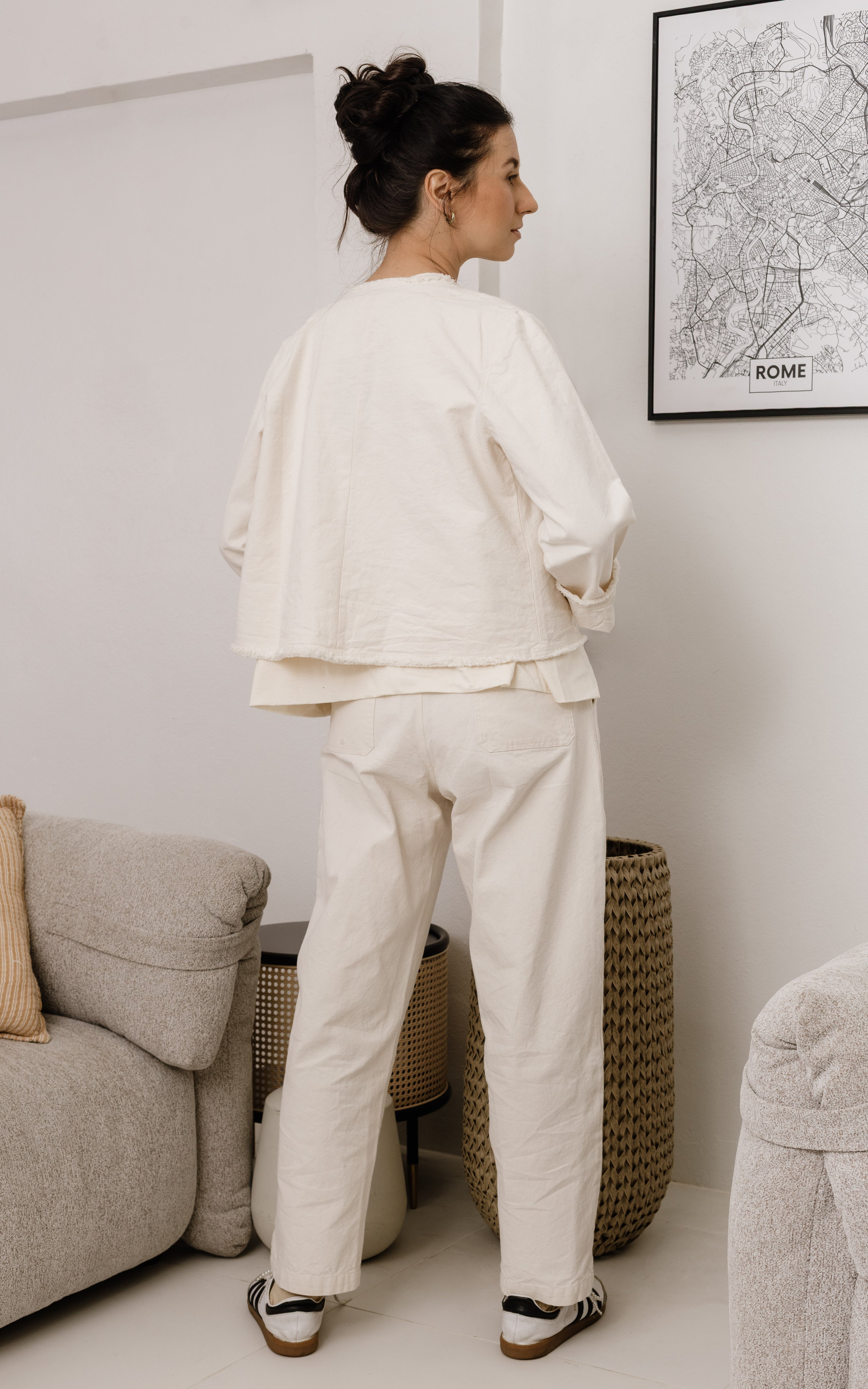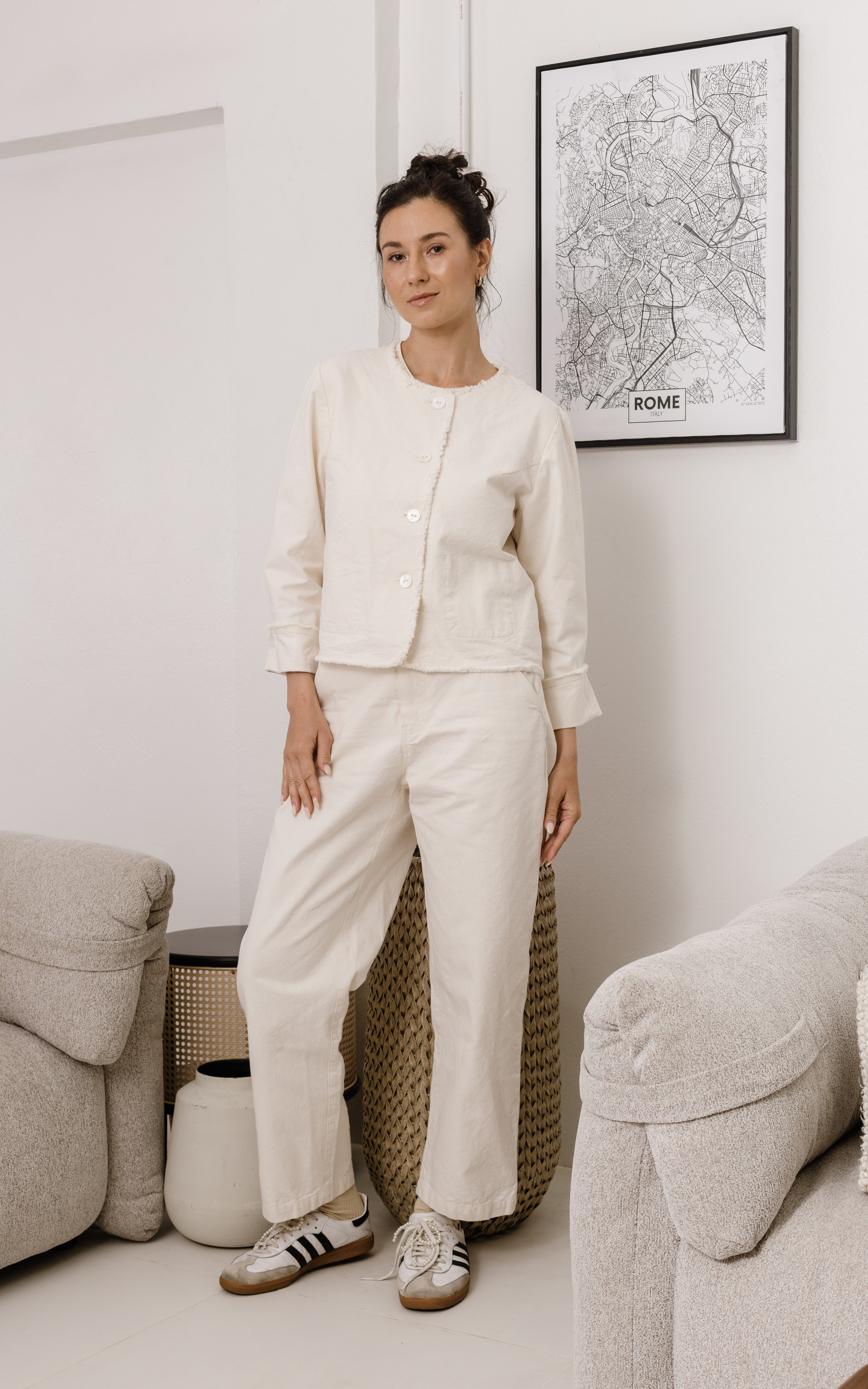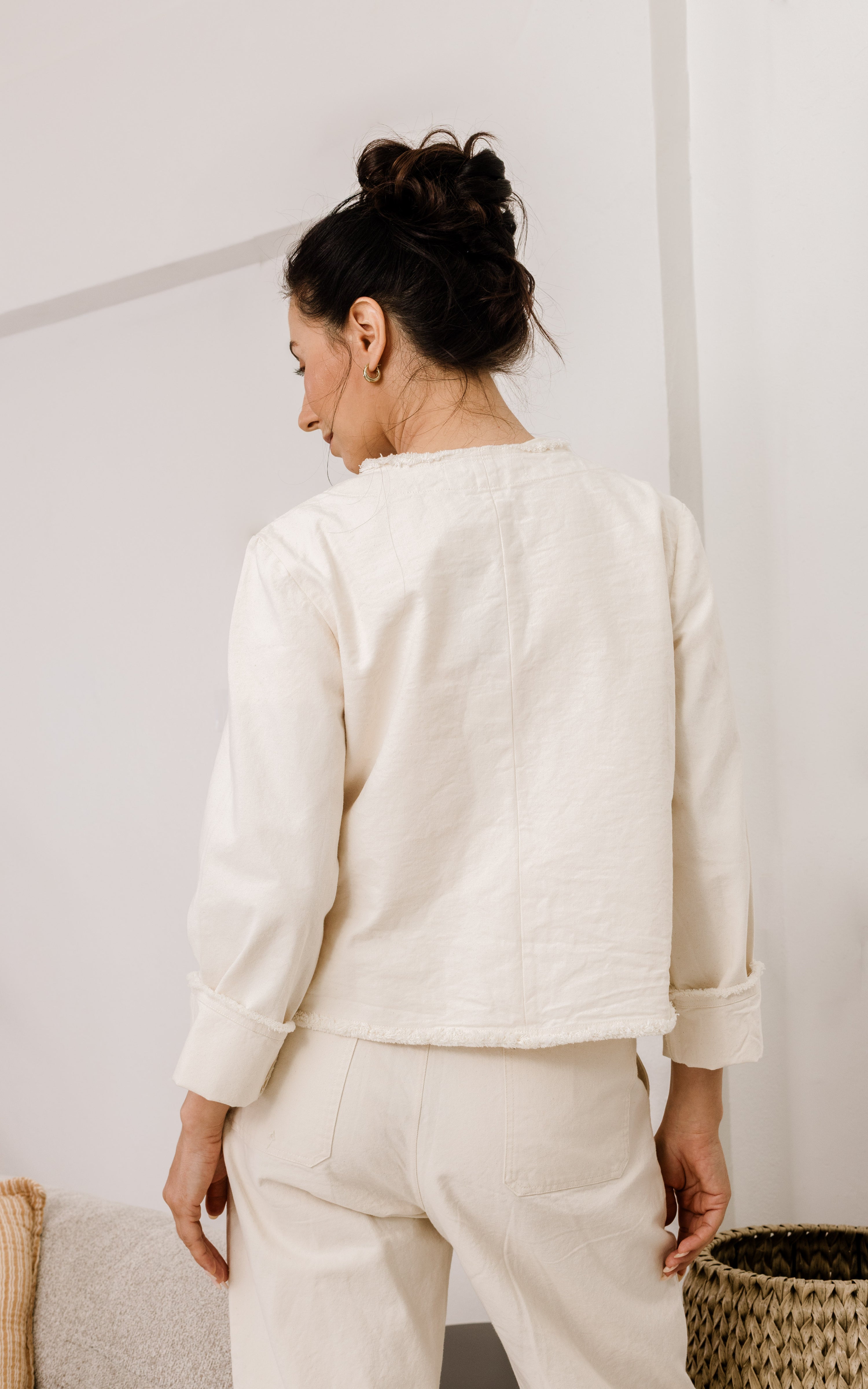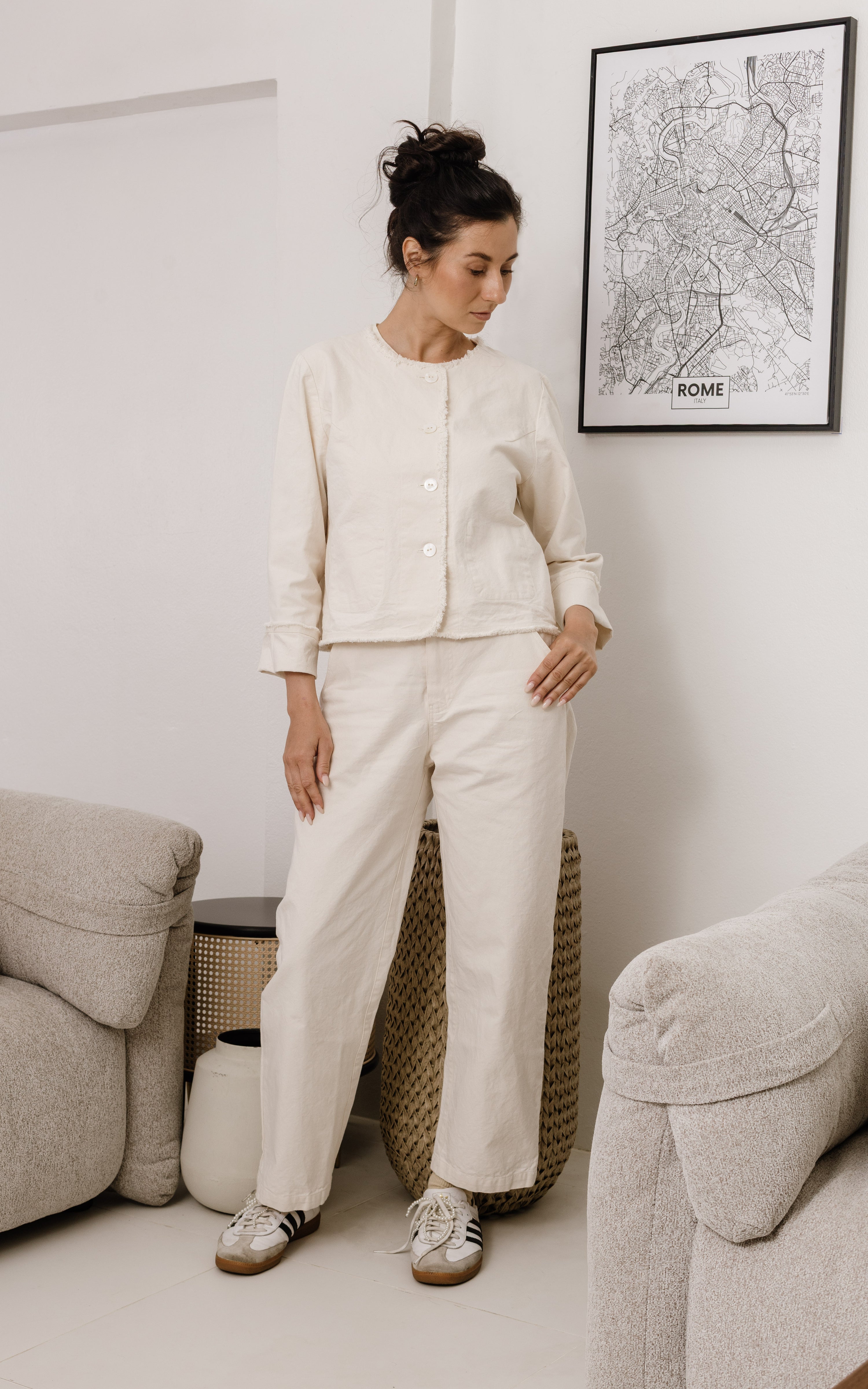 עשויי בד קנבס, עם אלמנט של קצוות פרומים בקצותיו.