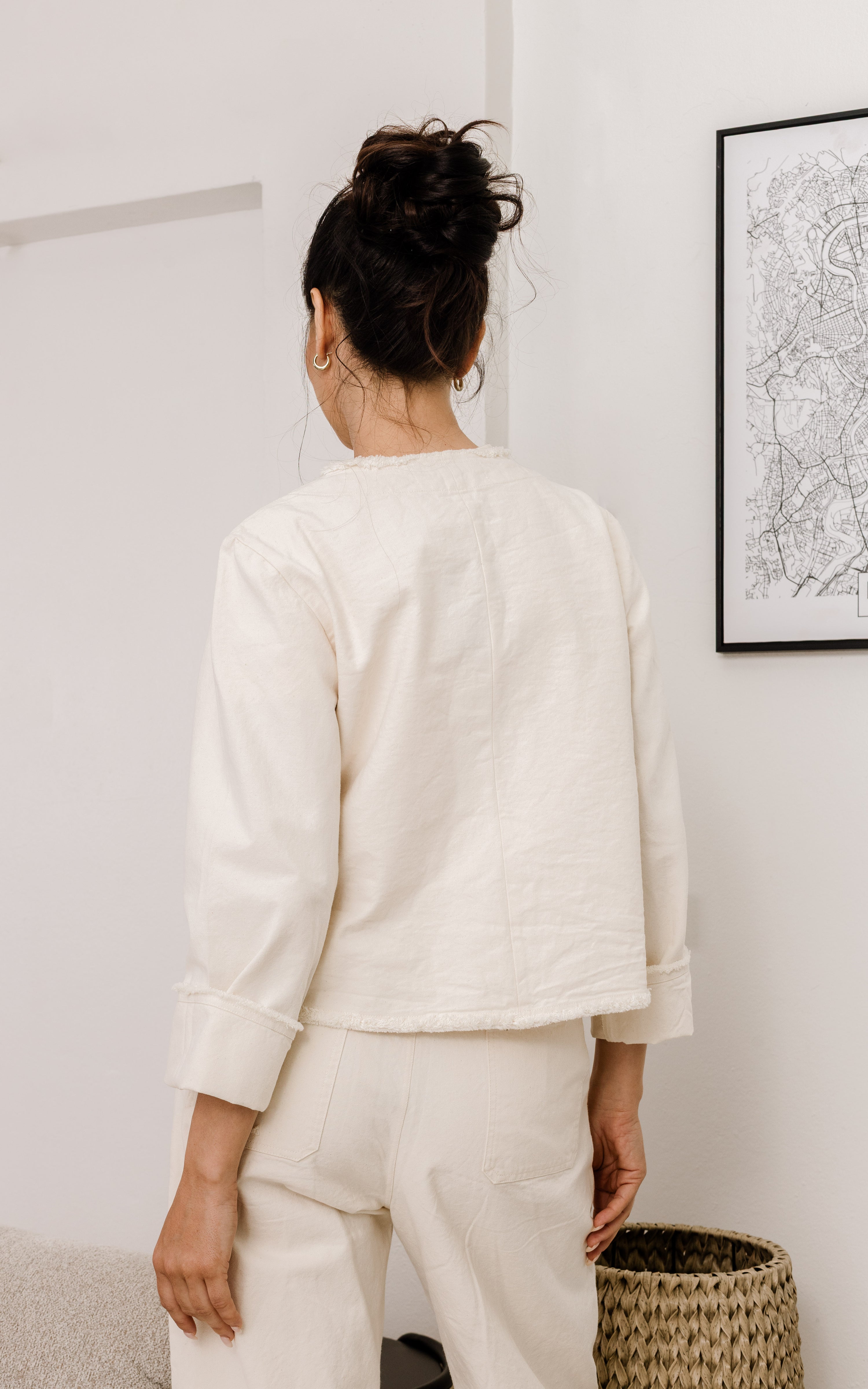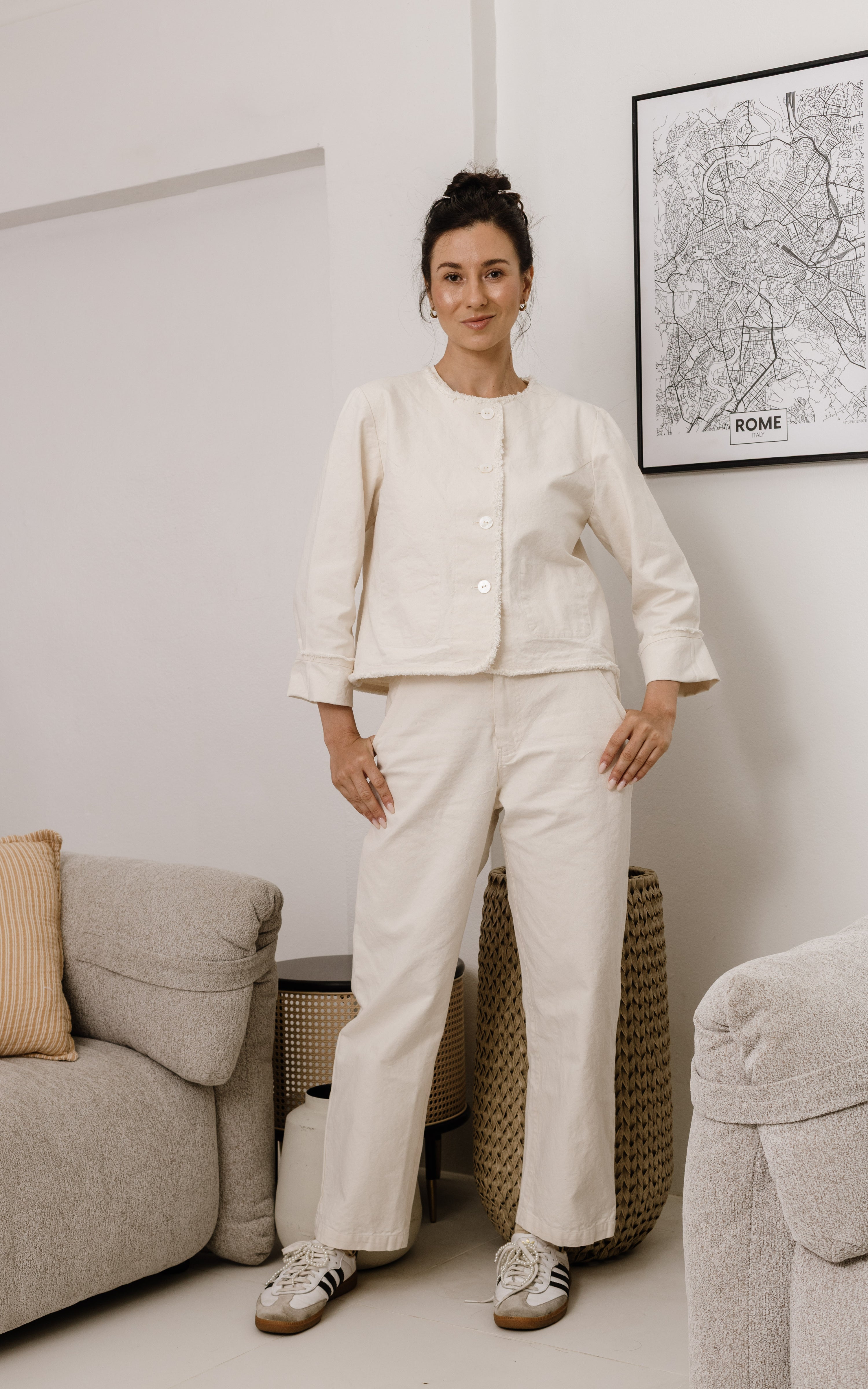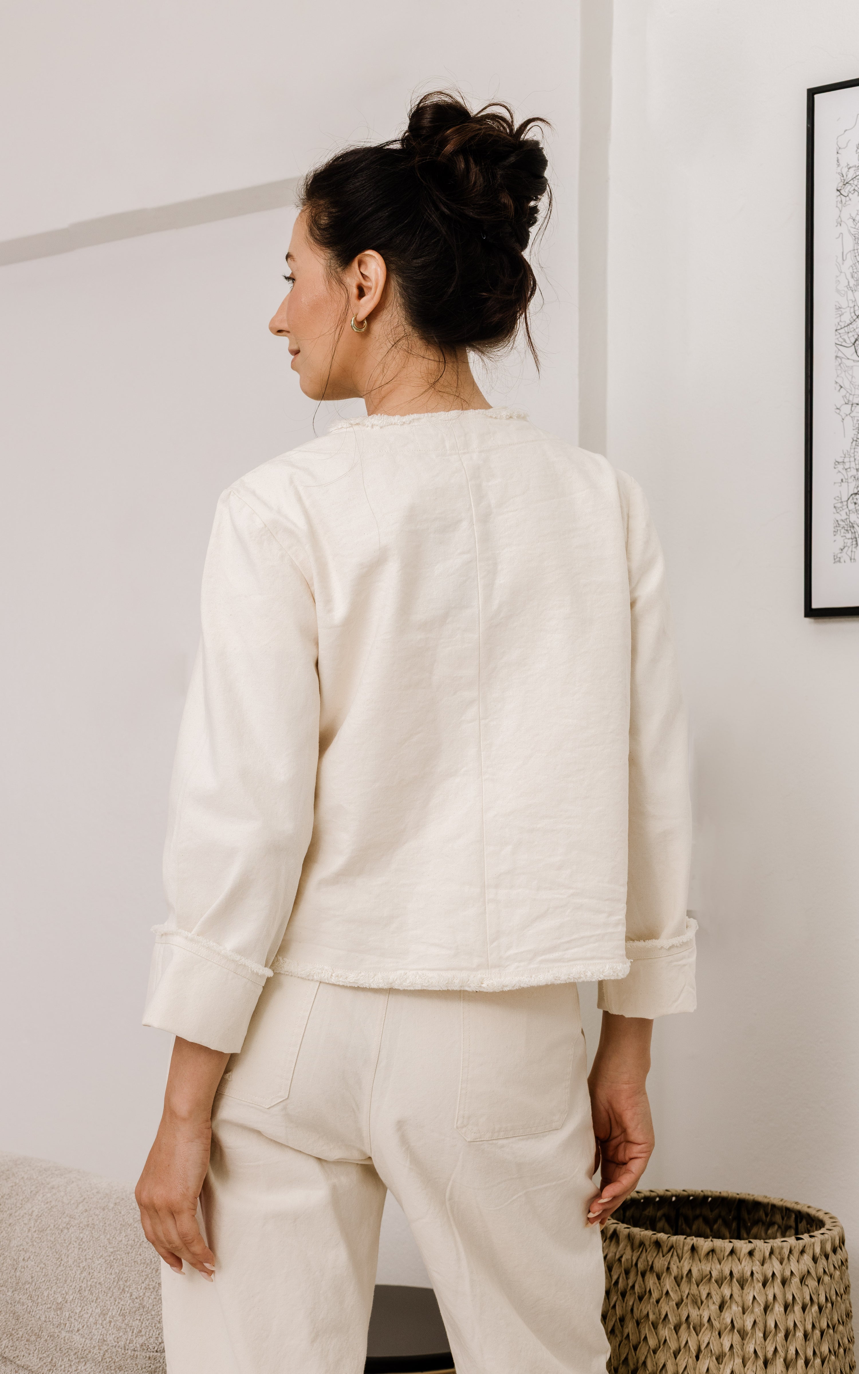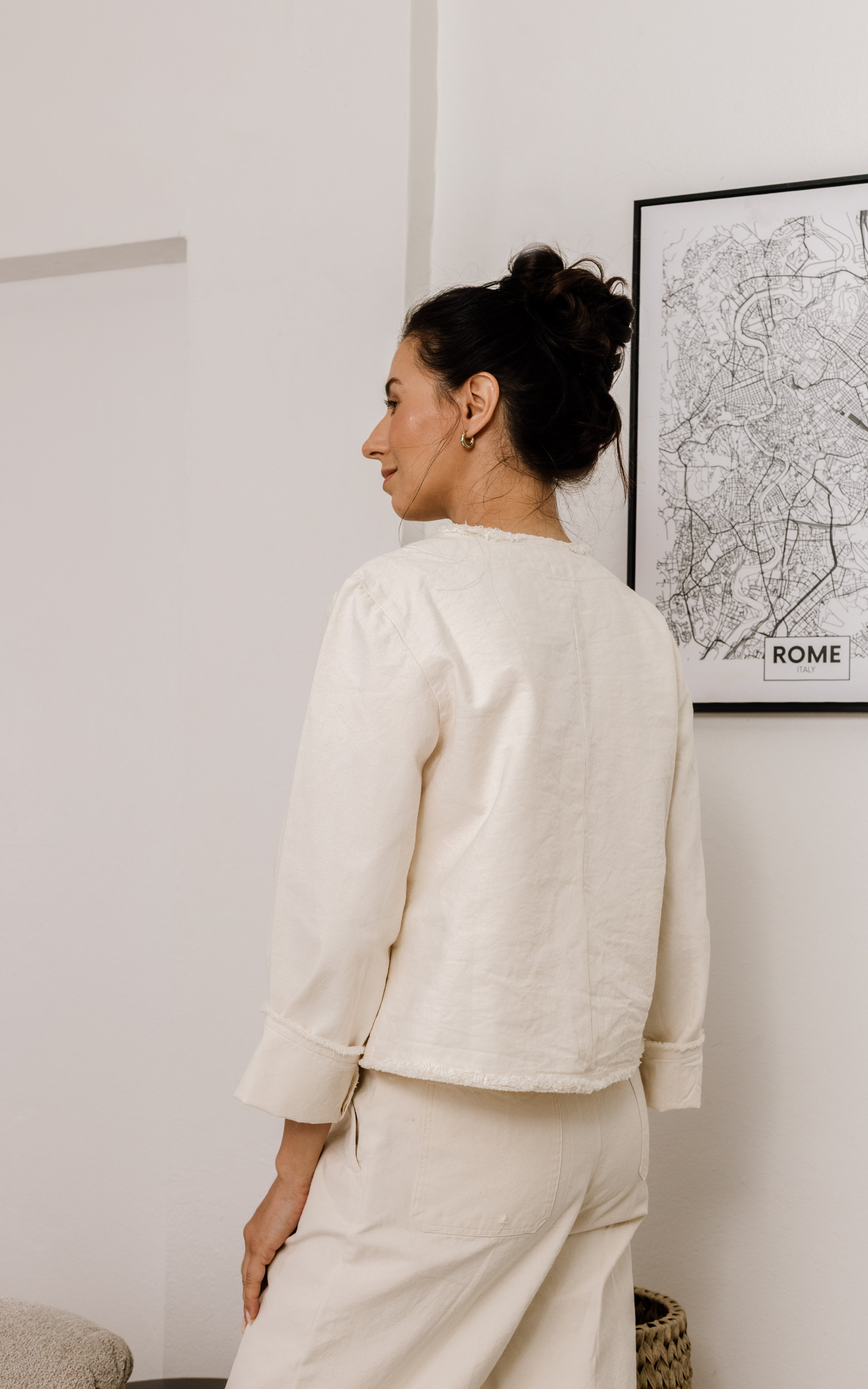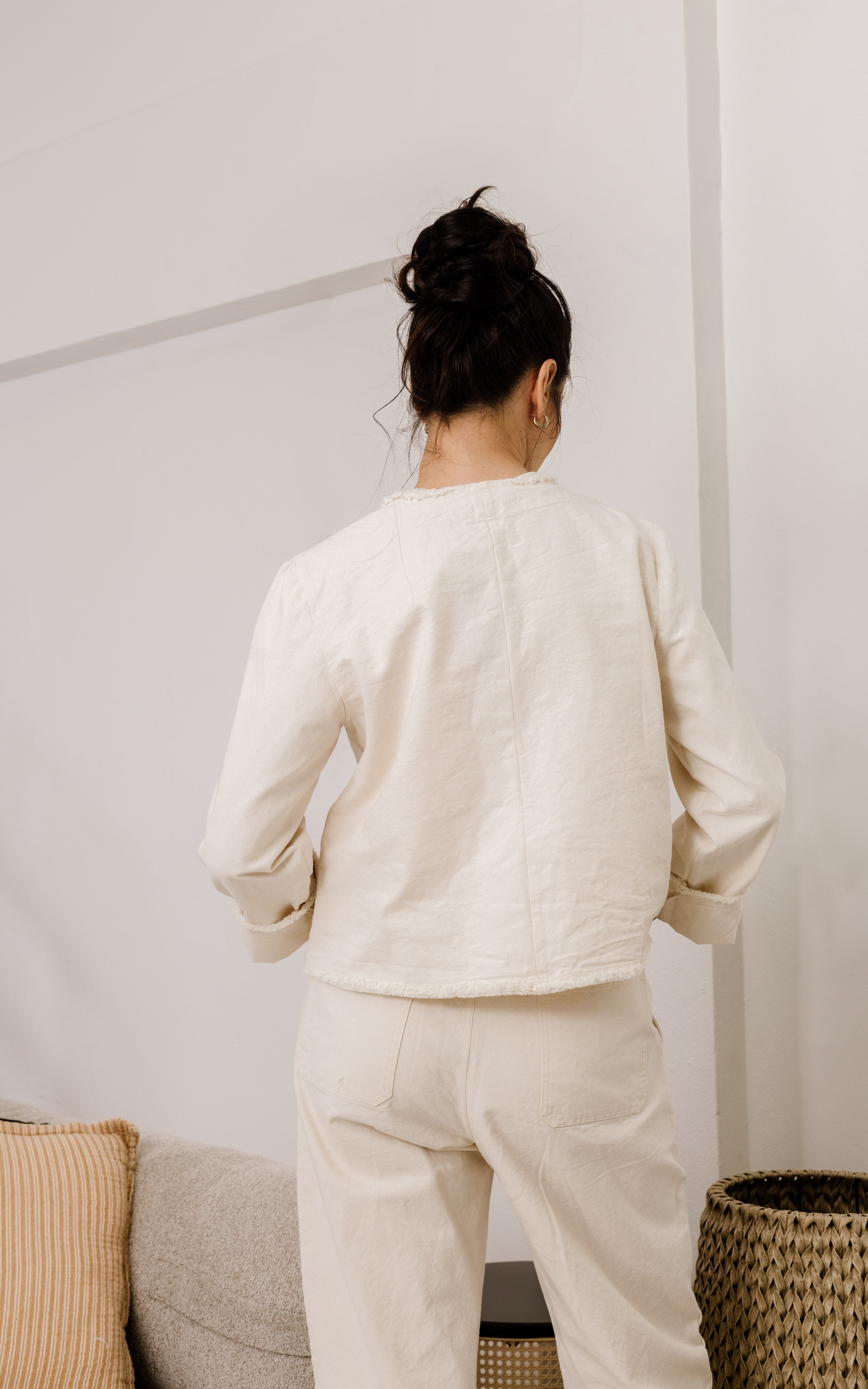 עשויי בד קנבס, עם אלמנט של קצוות פרומים בקצותיו.