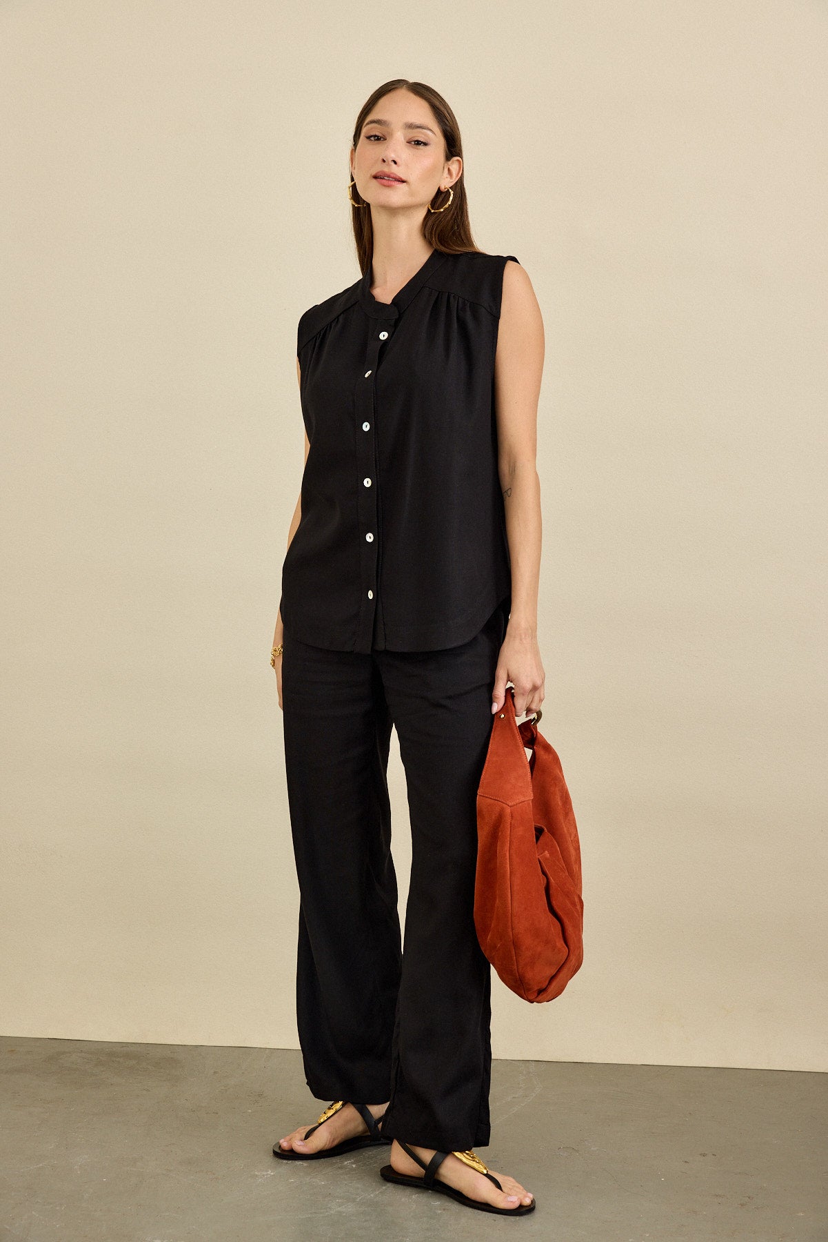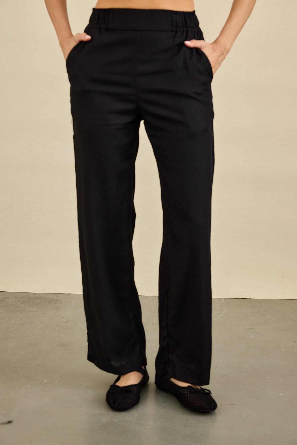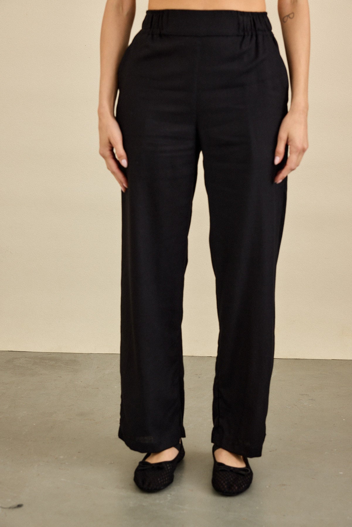 מכנסיים נוחות, בגזרה משוחררת, עם מותן גבוהה .