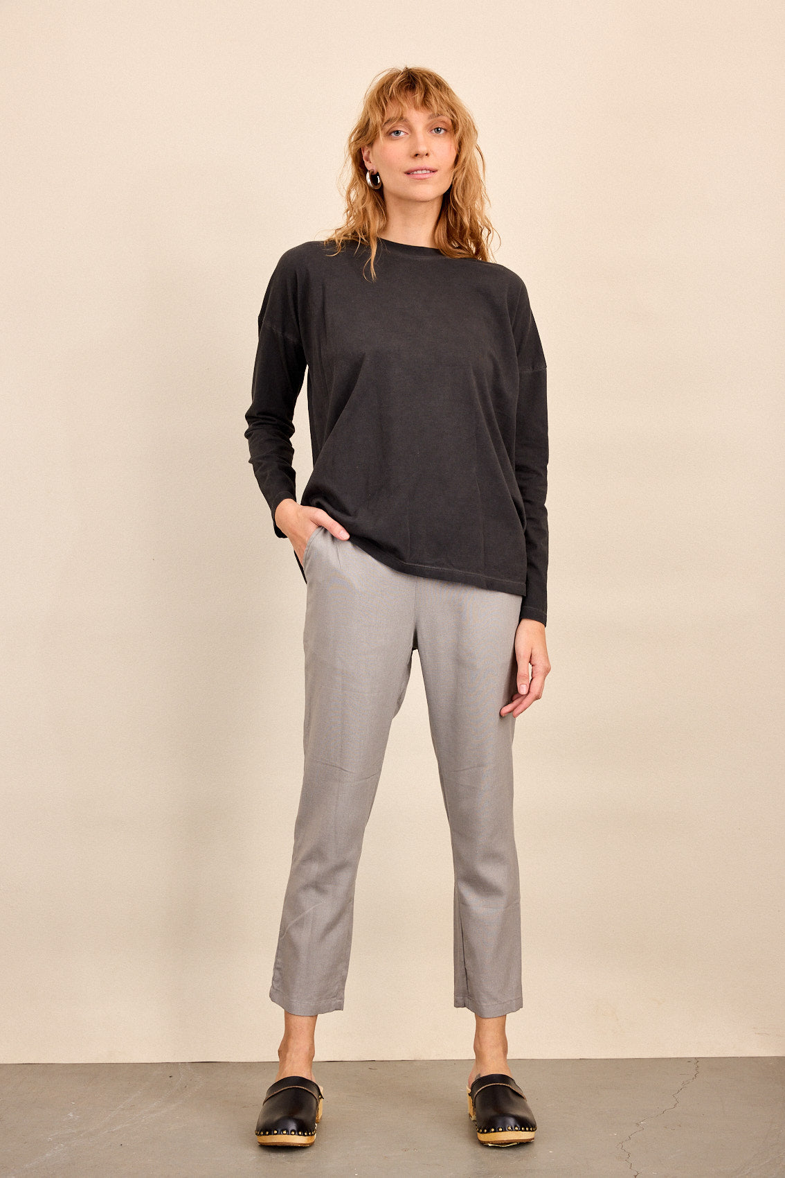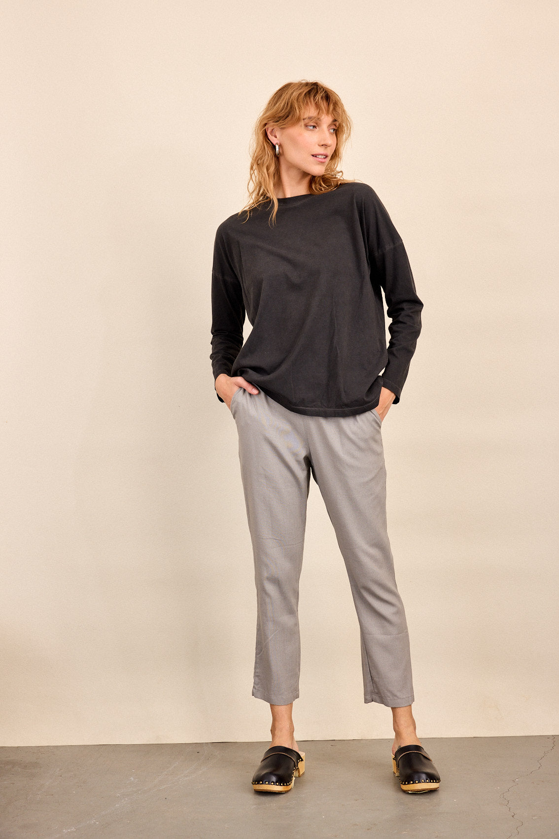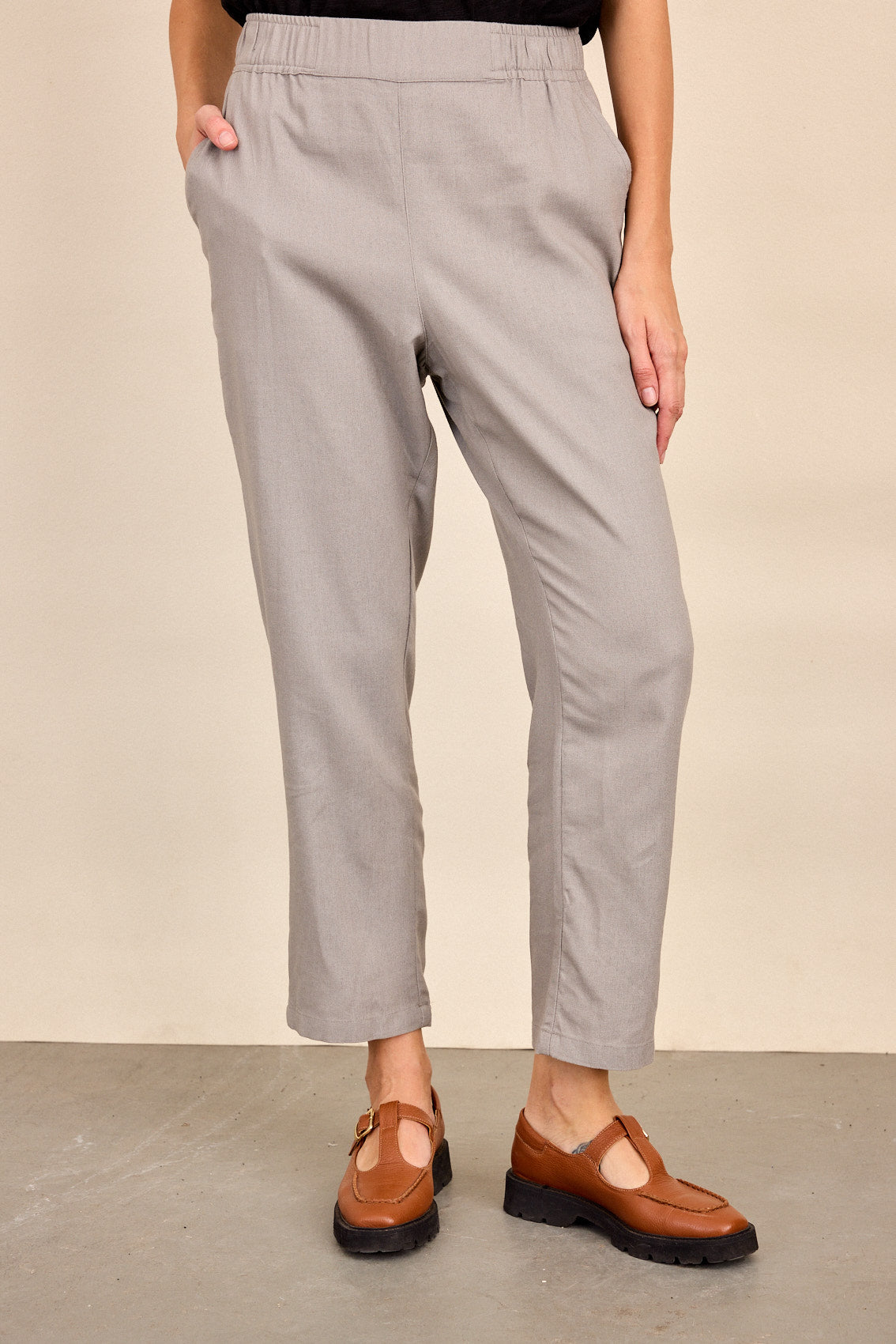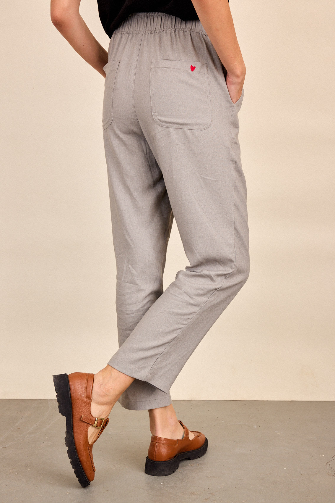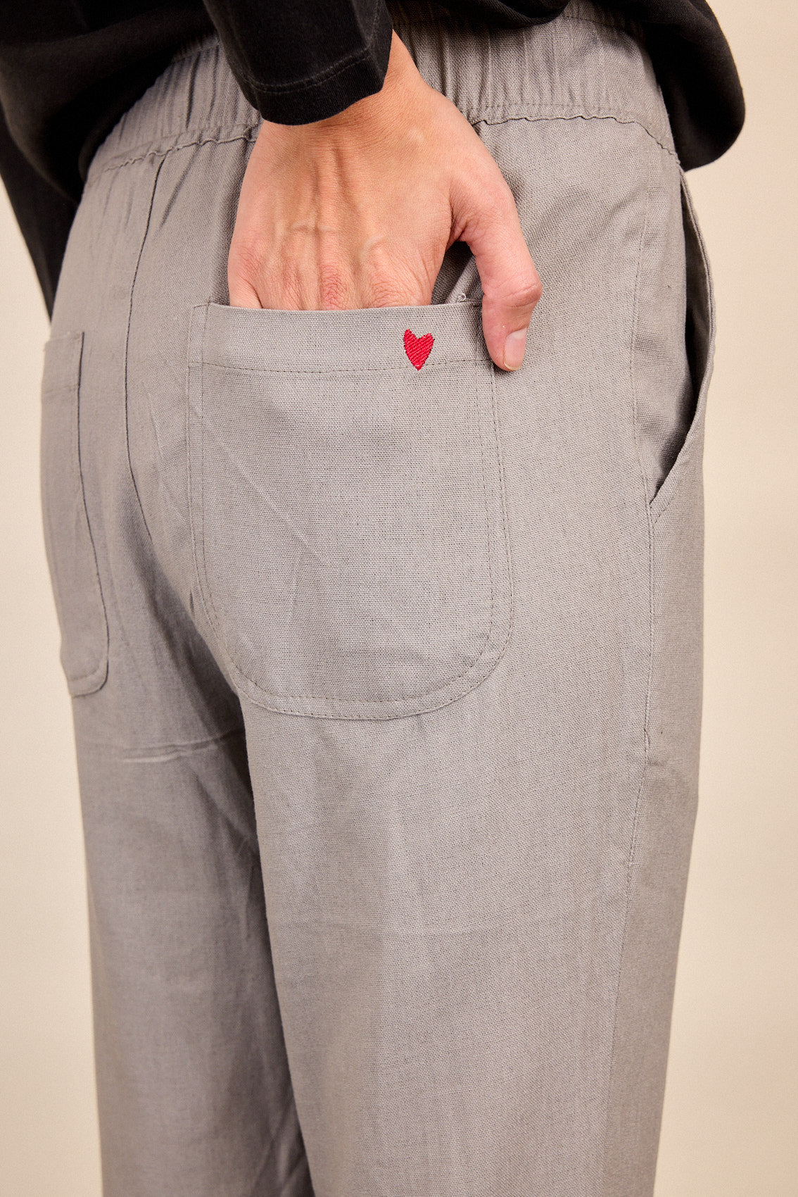 מכנס בגזרה מחמיאה, מותן גבוהה, עם גומי. למכנס כיסי צד, וכיסים בגב, בהם מופיעה רקמת לב. אורך המכנס 7/8.