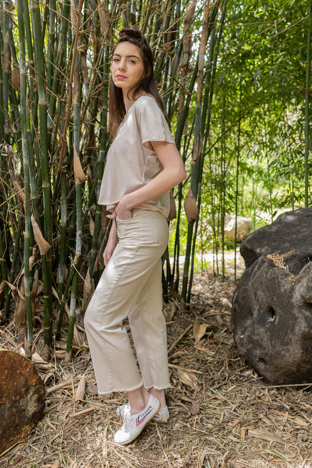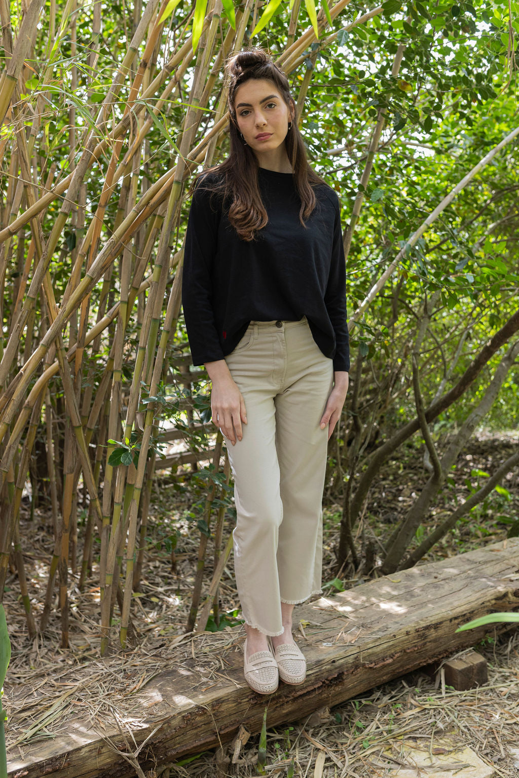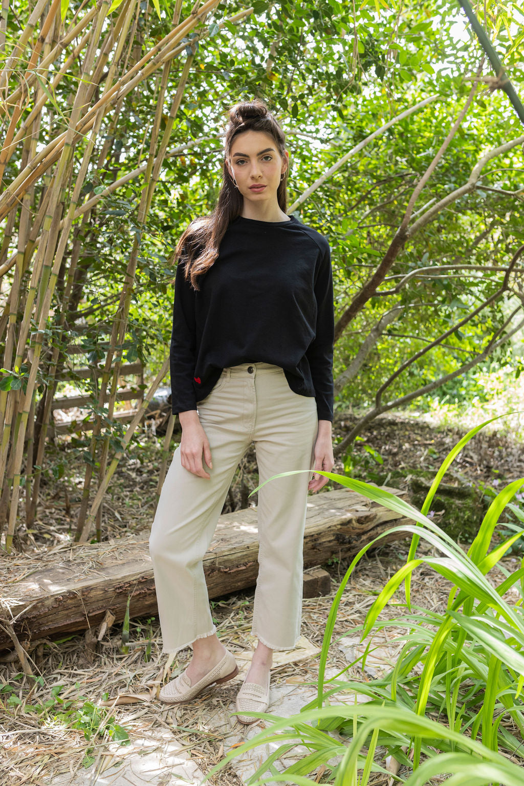 מכנס 5 כיסים, קלאסי, עם רגל ישרה ומותן גבוהה.