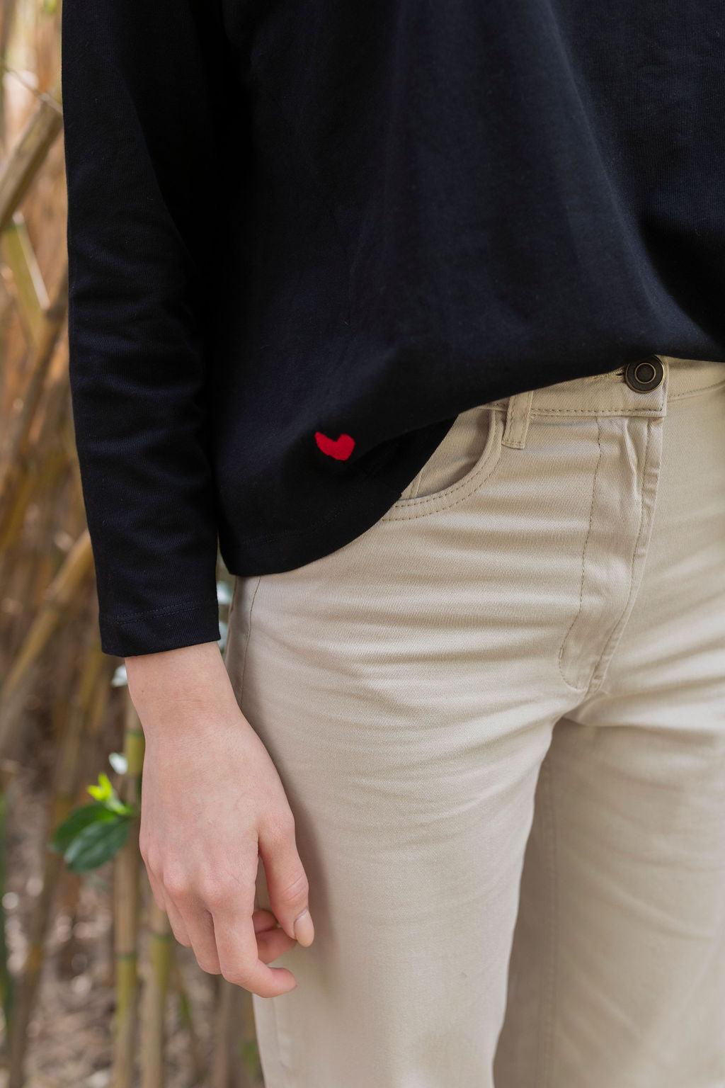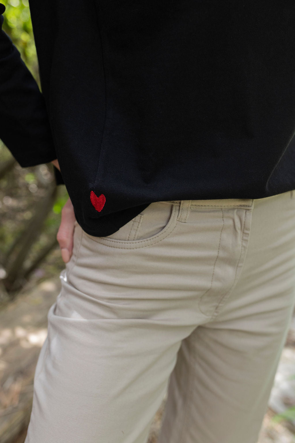 בקצה הרגל הבד פרום, ובכיס הגב רקמת לב.