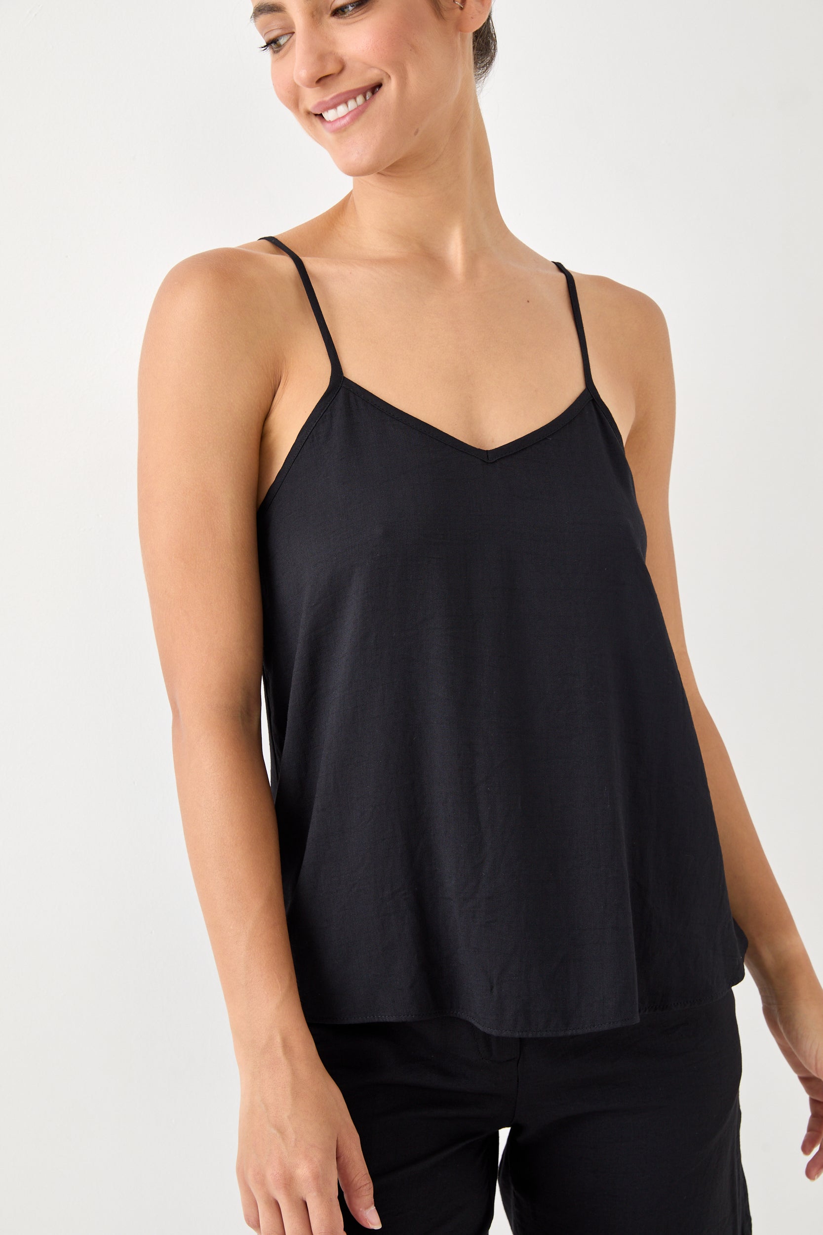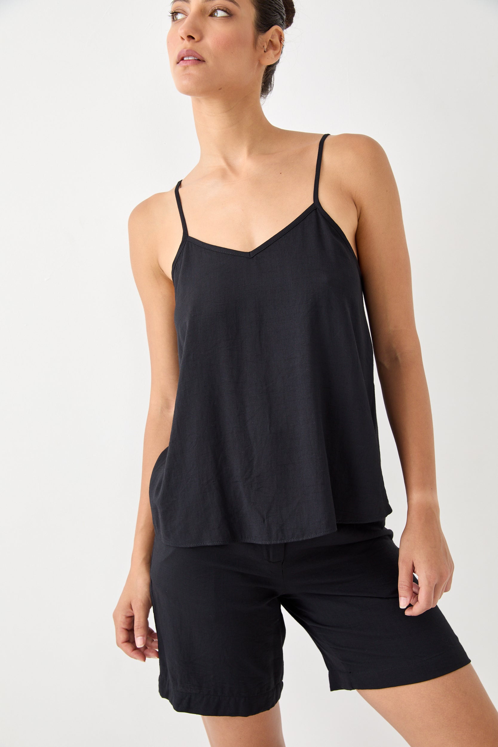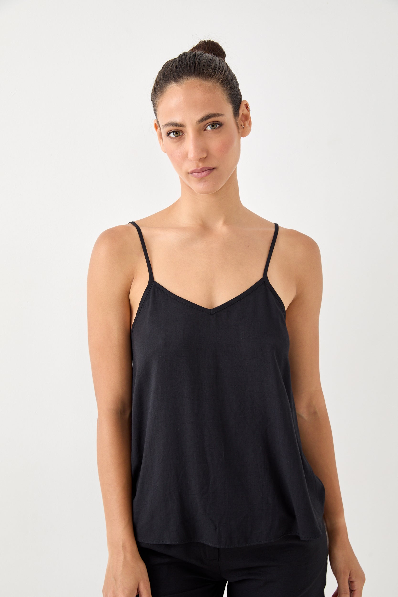גופייה עם מפתח וי, כתפיות דקות מתכווננות, בגזרה רחוקה מעט מהגוף. הרכב בד: 100% ויסקוזה