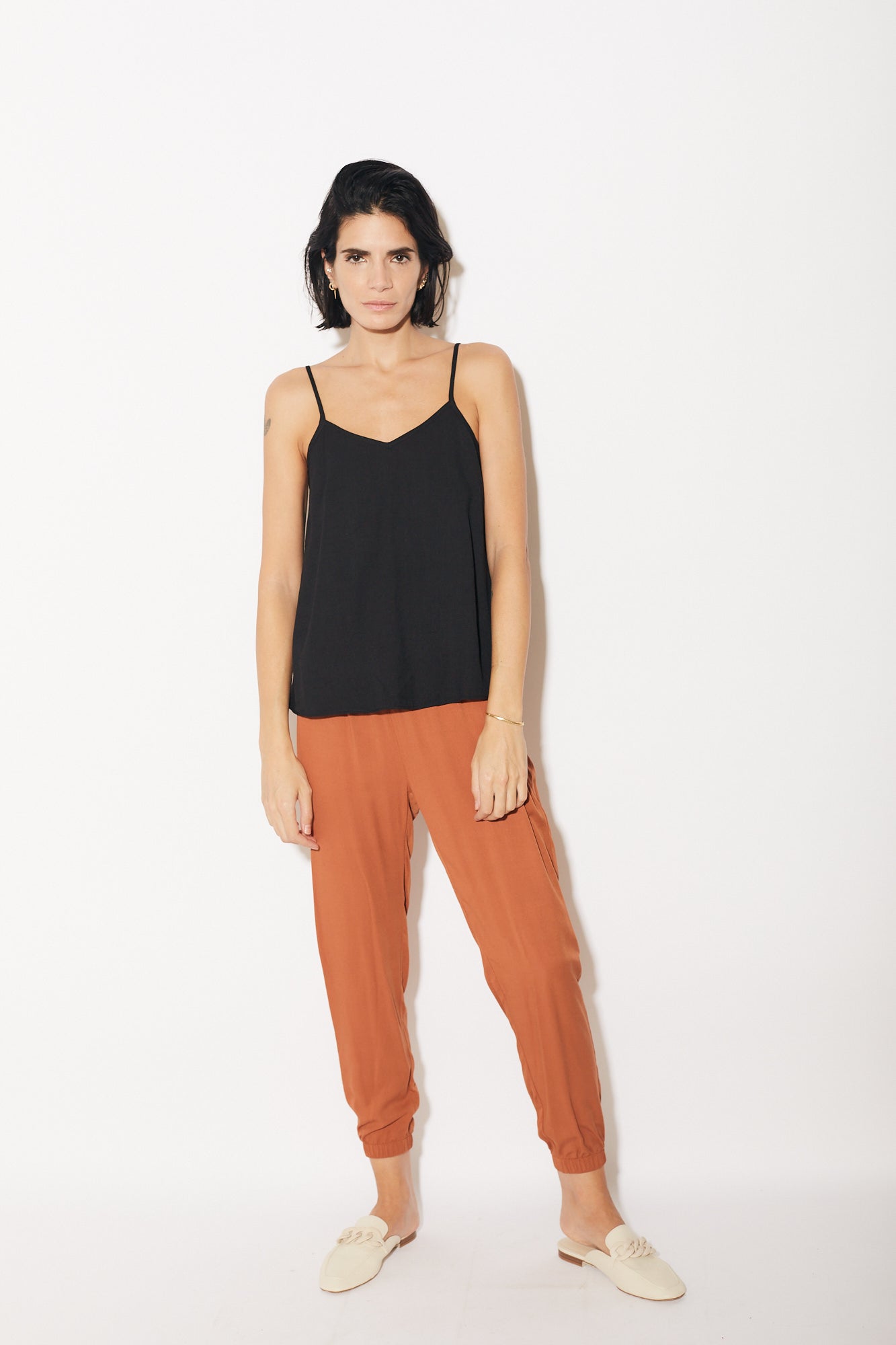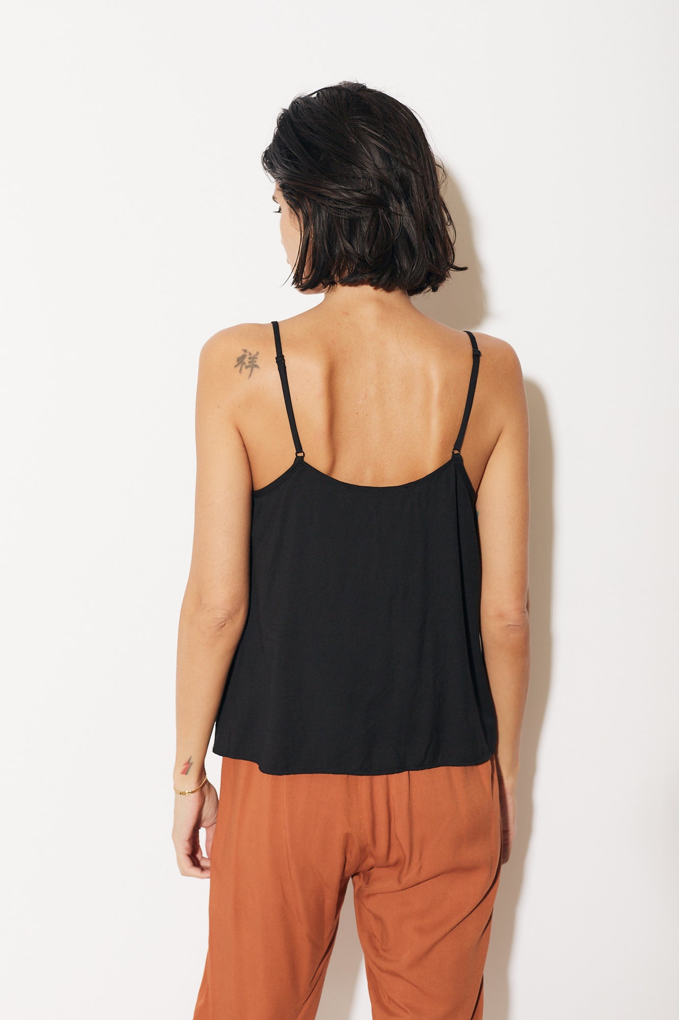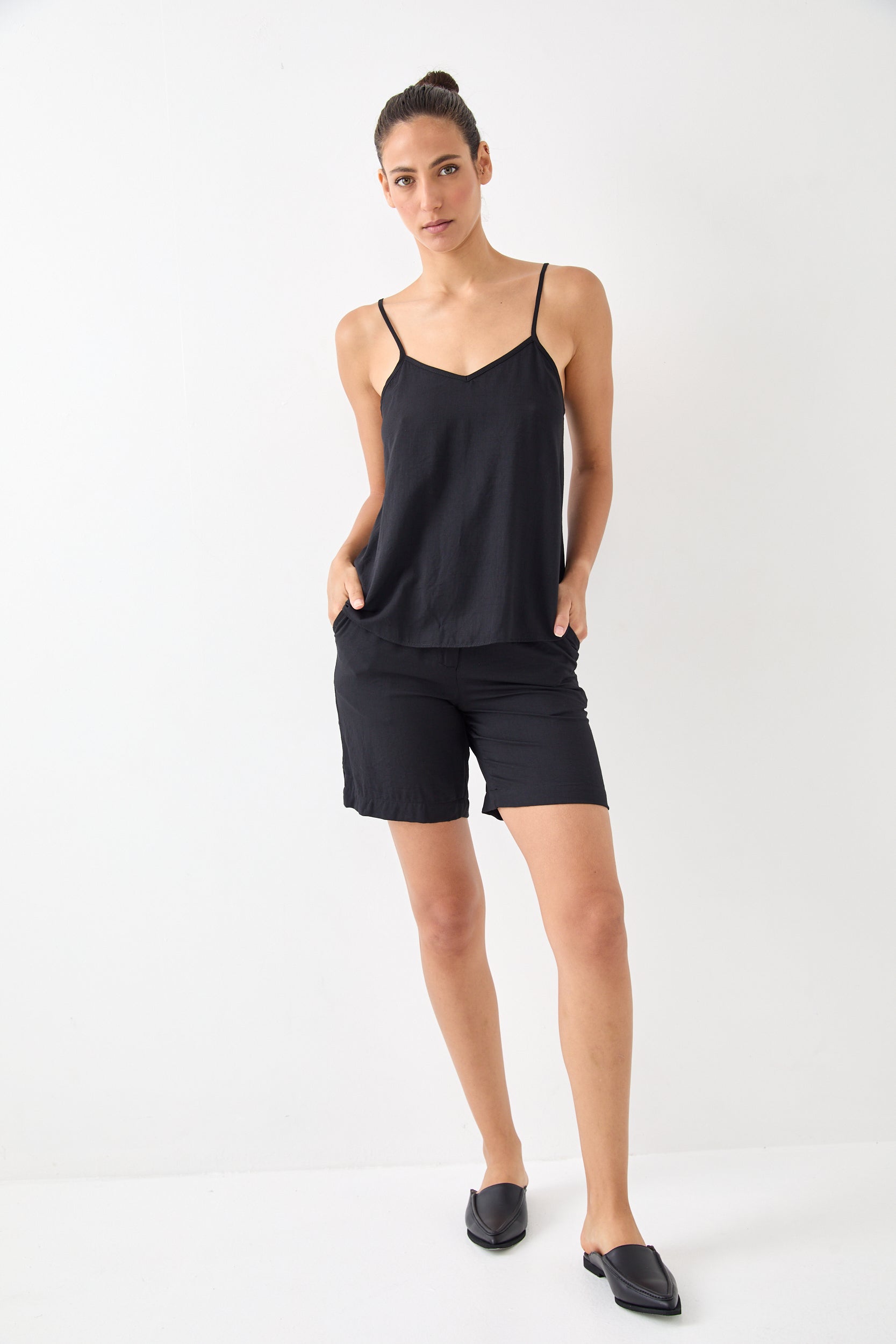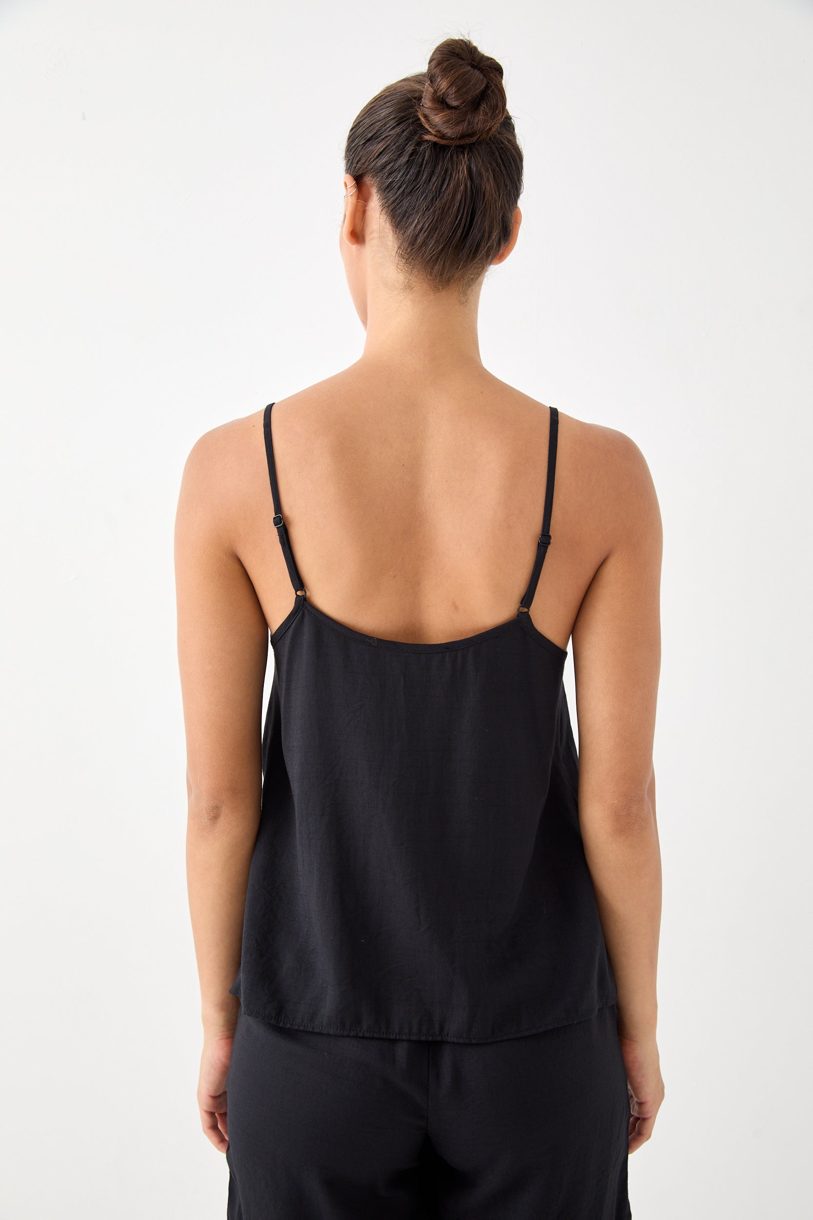 גופייה עם מפתח וי, כתפיות דקות מתכווננות, בגזרה רחוקה מעט מהגוף. הרכב בד: 100% ויסקוזה