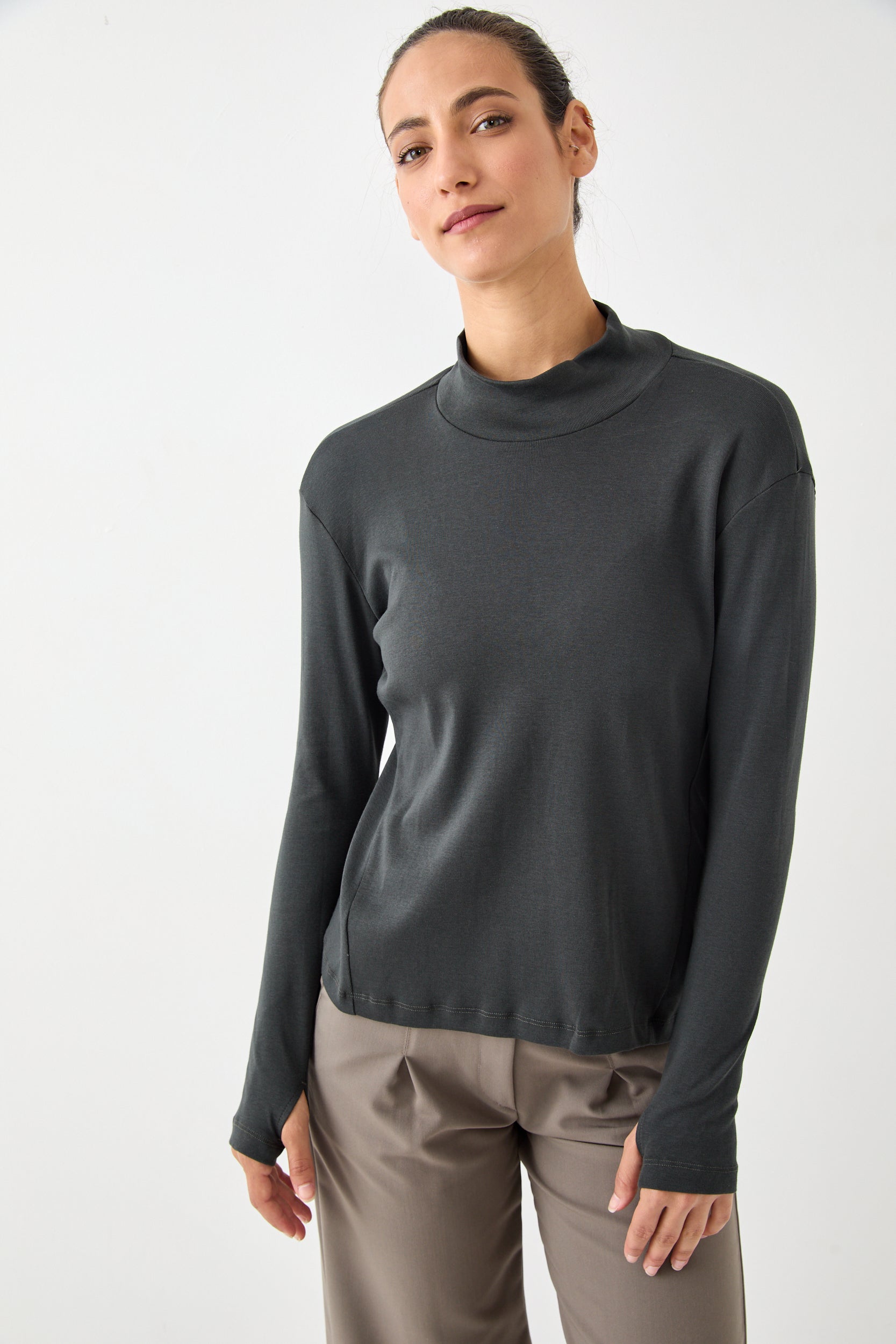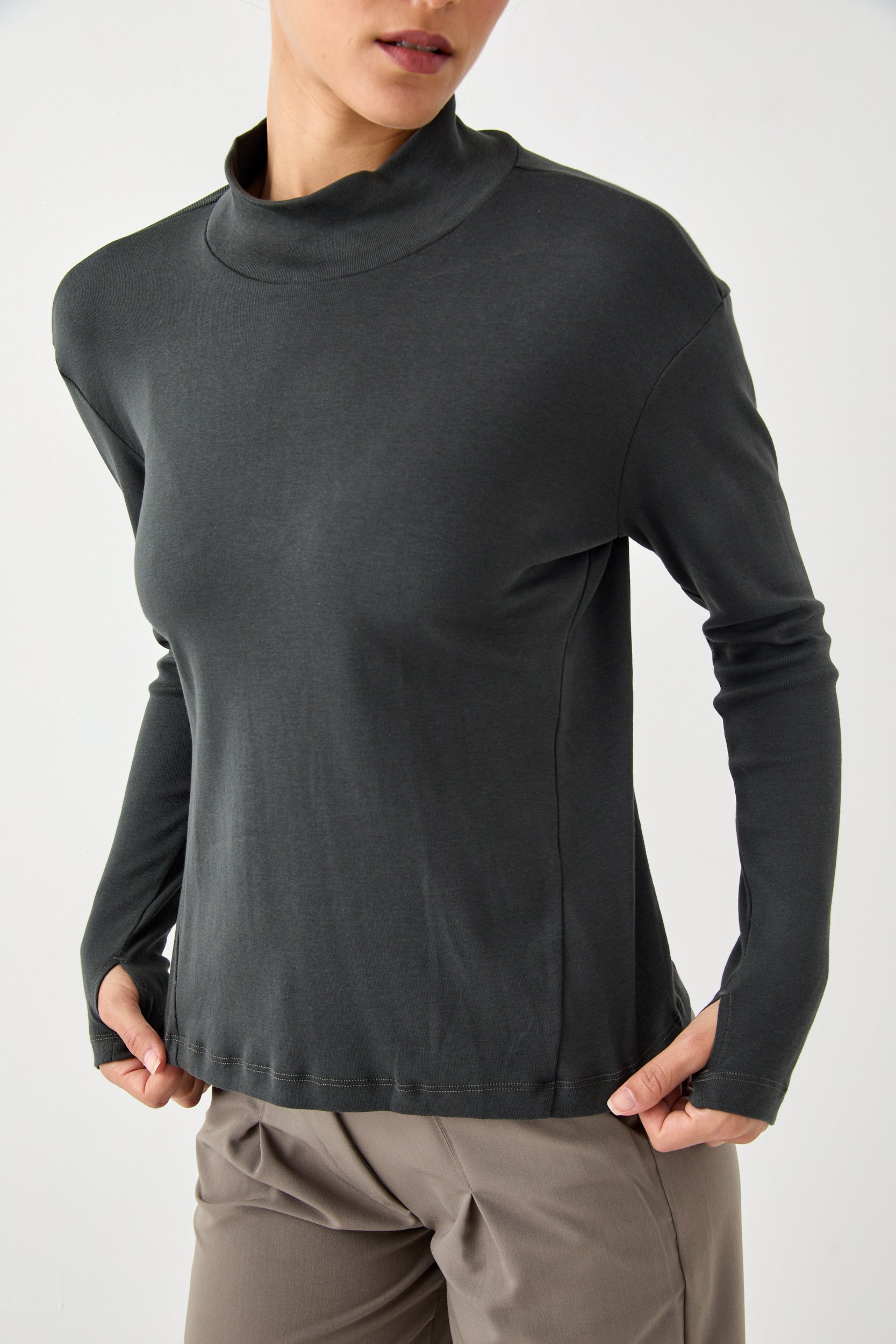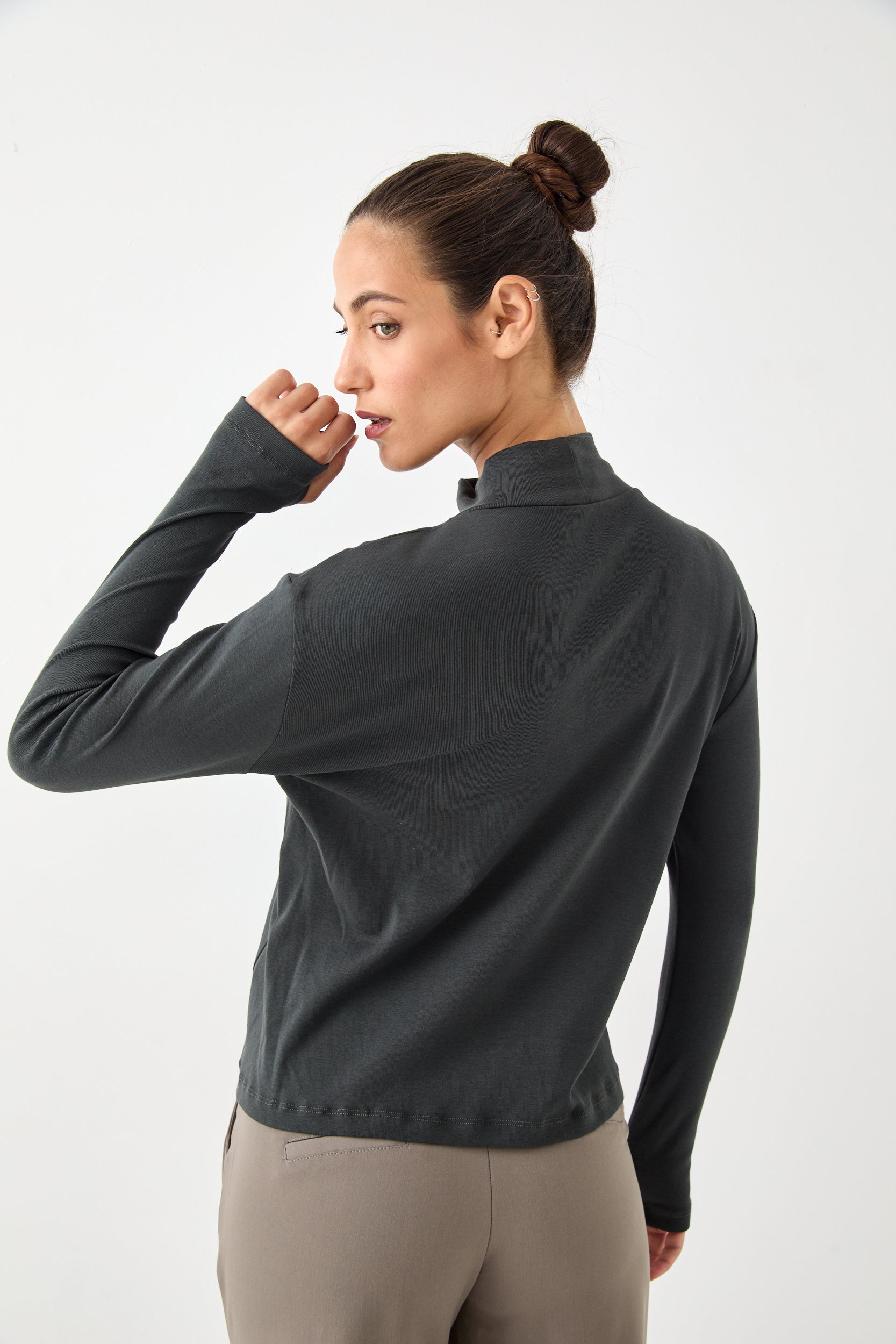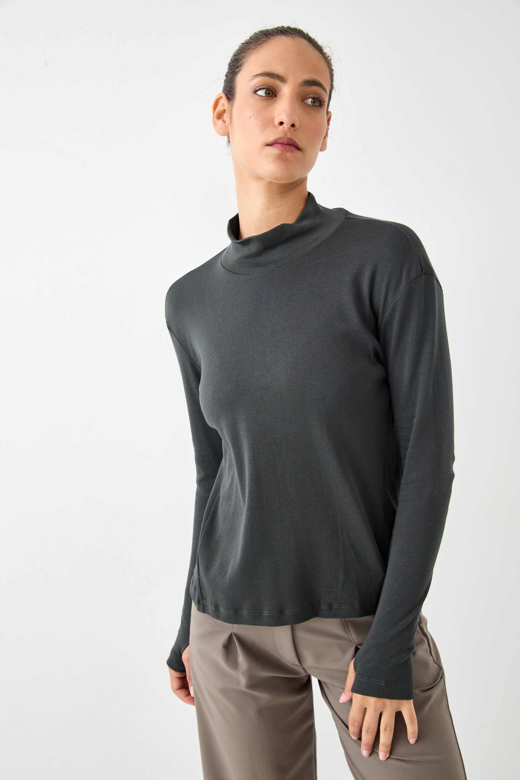 חולצת ריב עם צווארון גולף, חתכי צד מחמיאים, בעלת שרוול ארוך המכסה חצי כף יד.