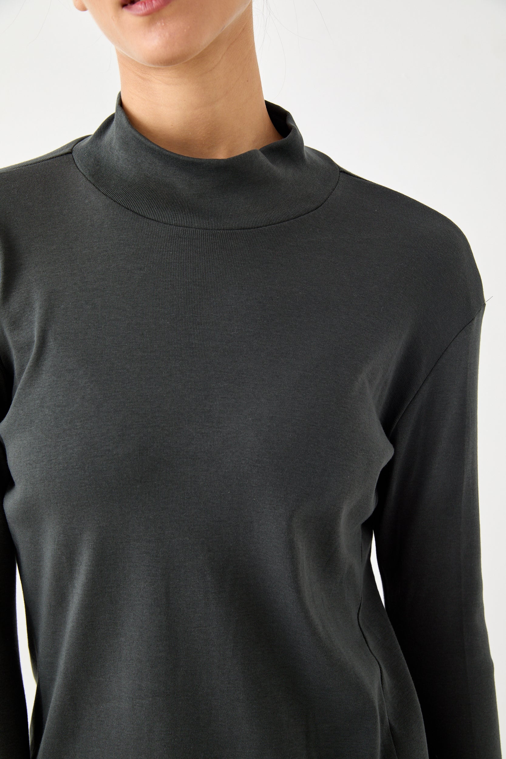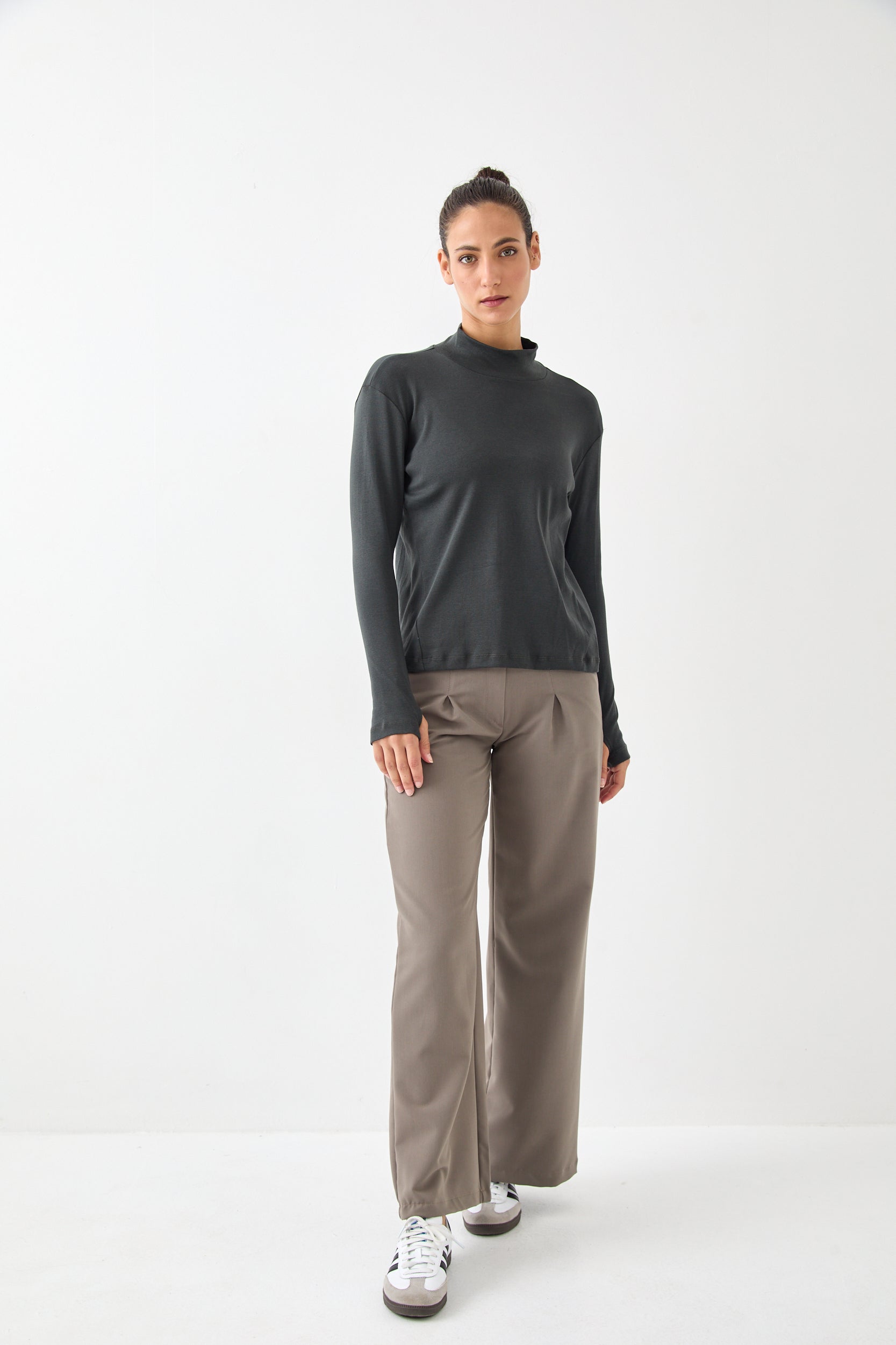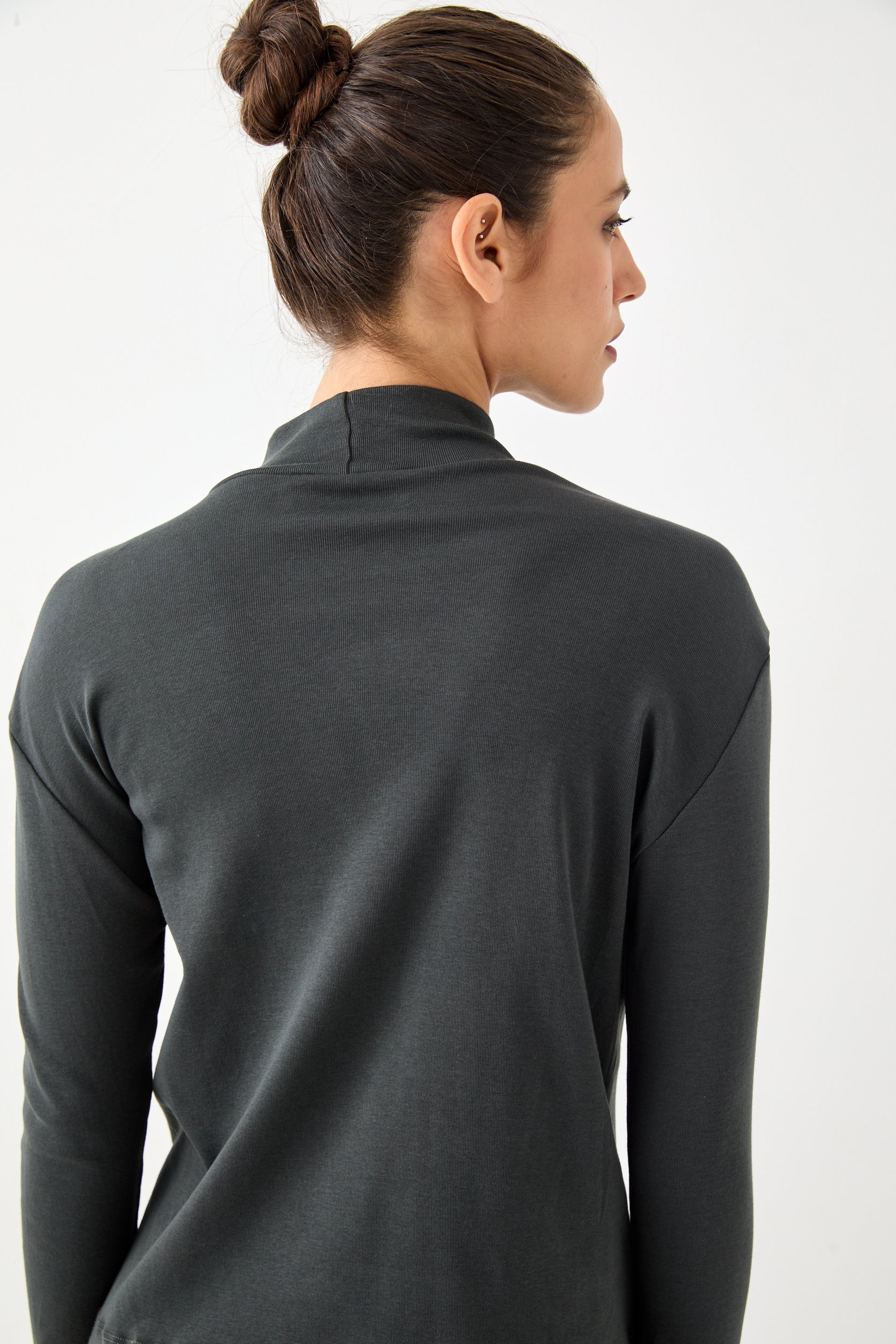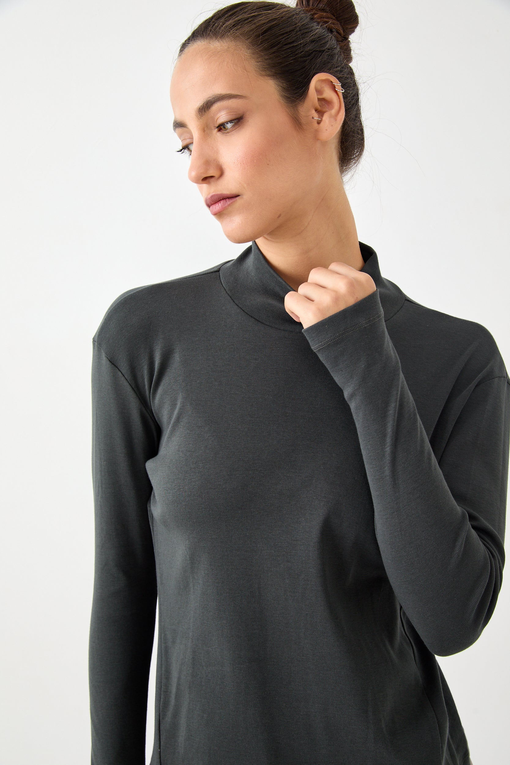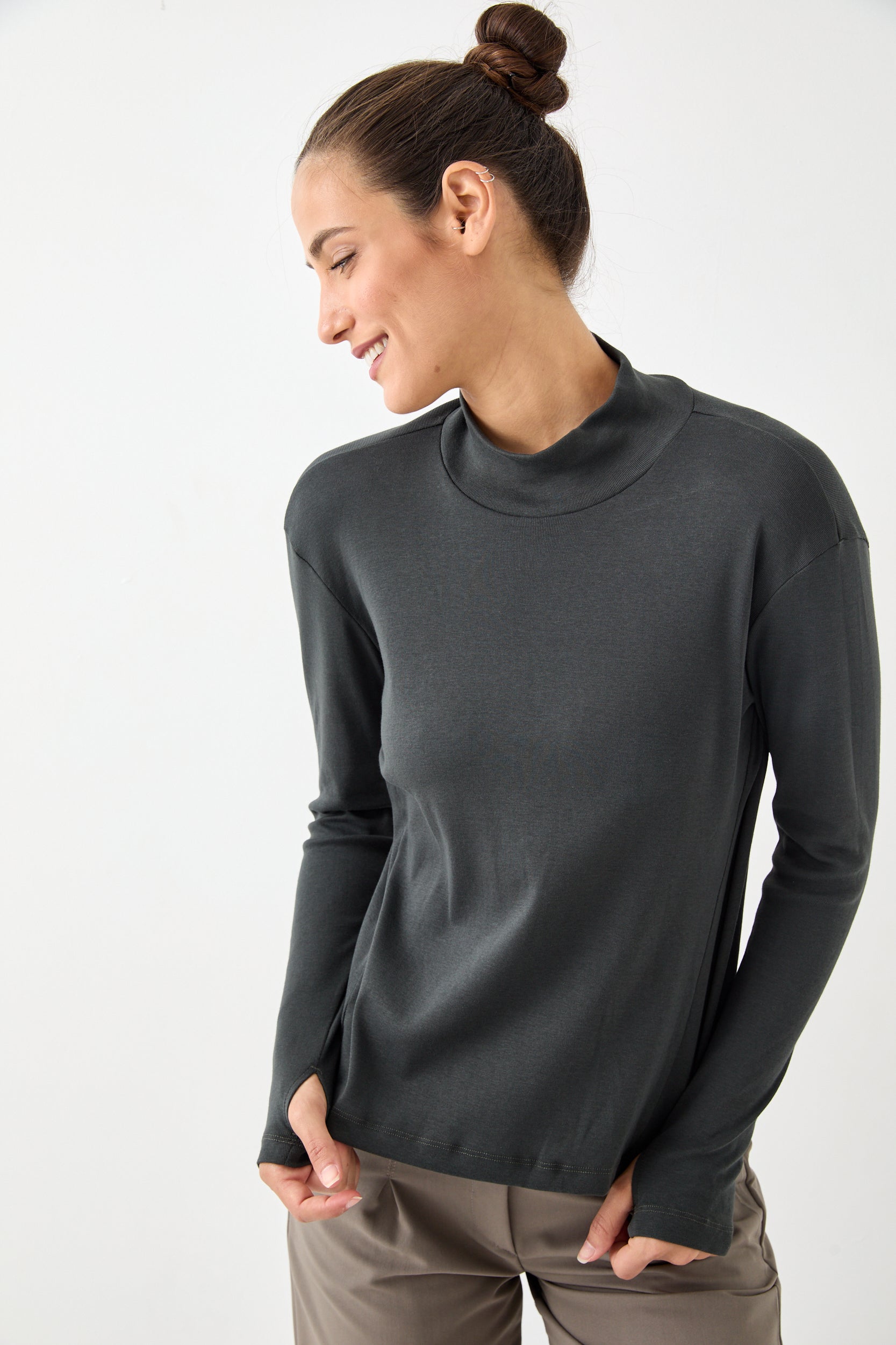 חולצת ריב עם צווארון גולף, חתכי צד מחמיאים, בעלת שרוול ארוך המכסה חצי כף יד.