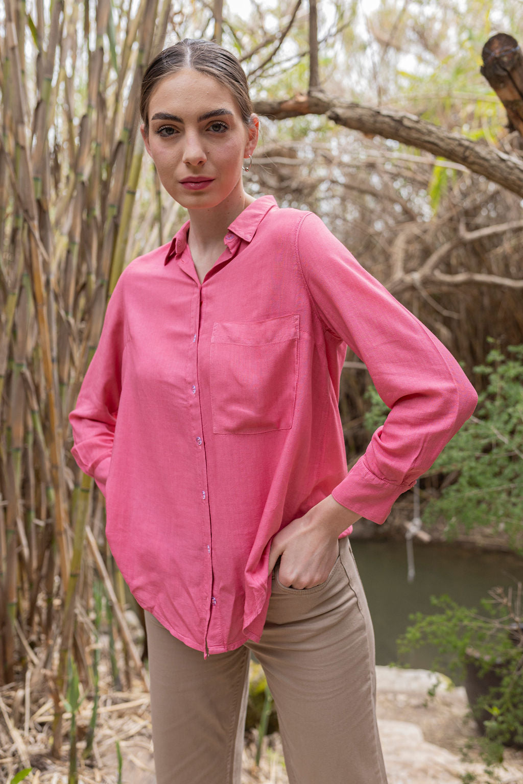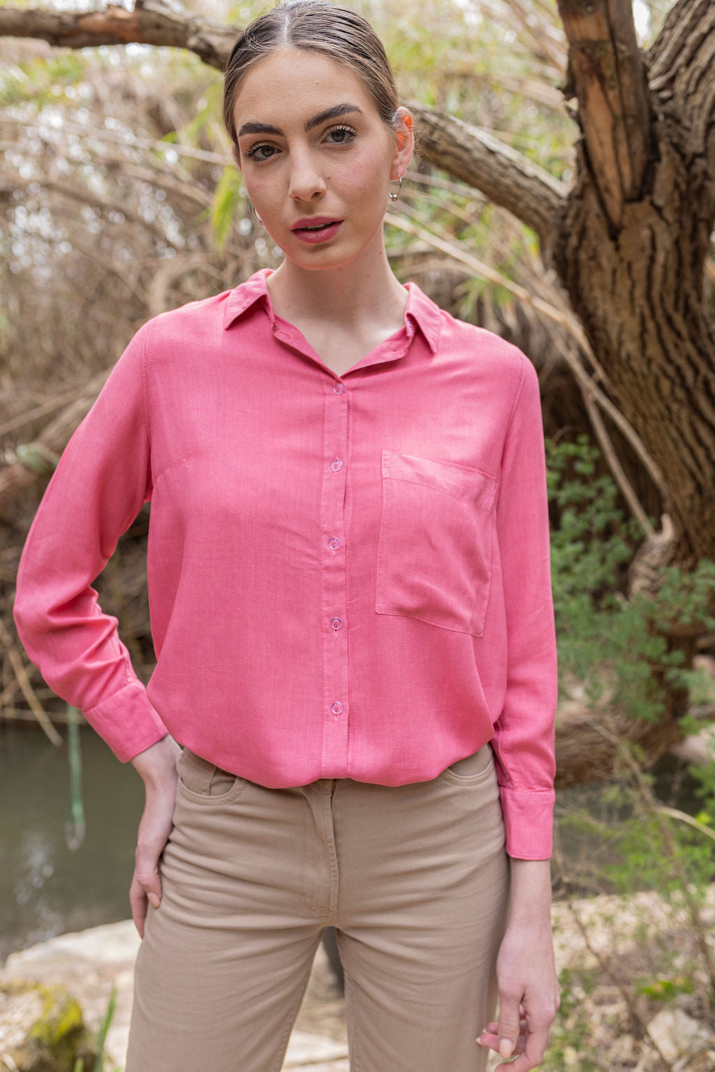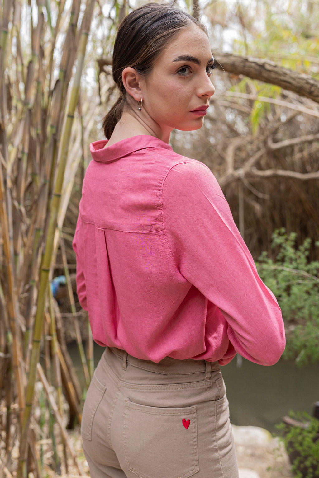 חולצה בגזרה נינוחה, מכופתרת , נהדרת ללבישה סגורה כחולצה, או פתוחה כעליונית. החולצה עשויה בד נעים ורך, עם רקמת לב בפנים הכפתרה