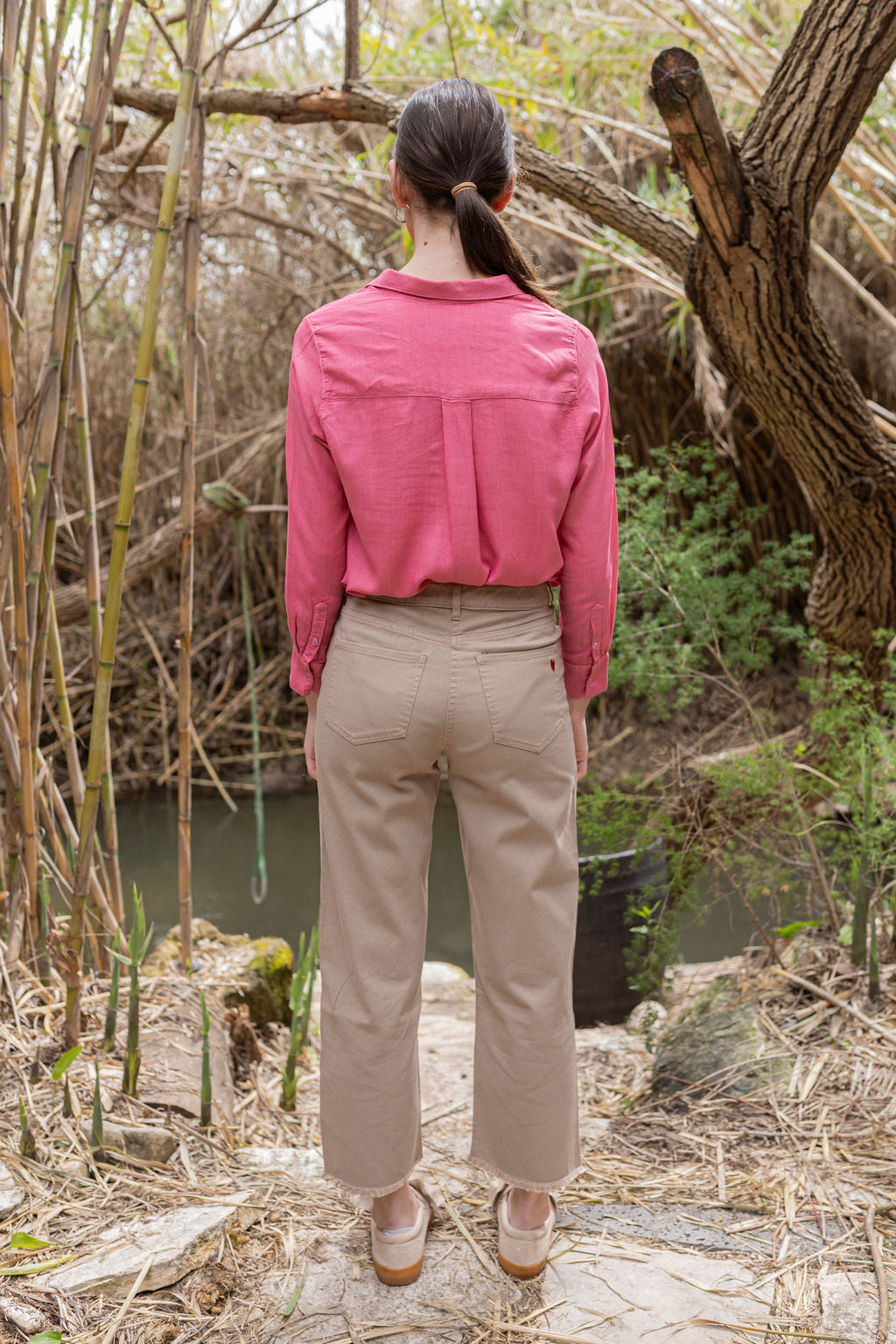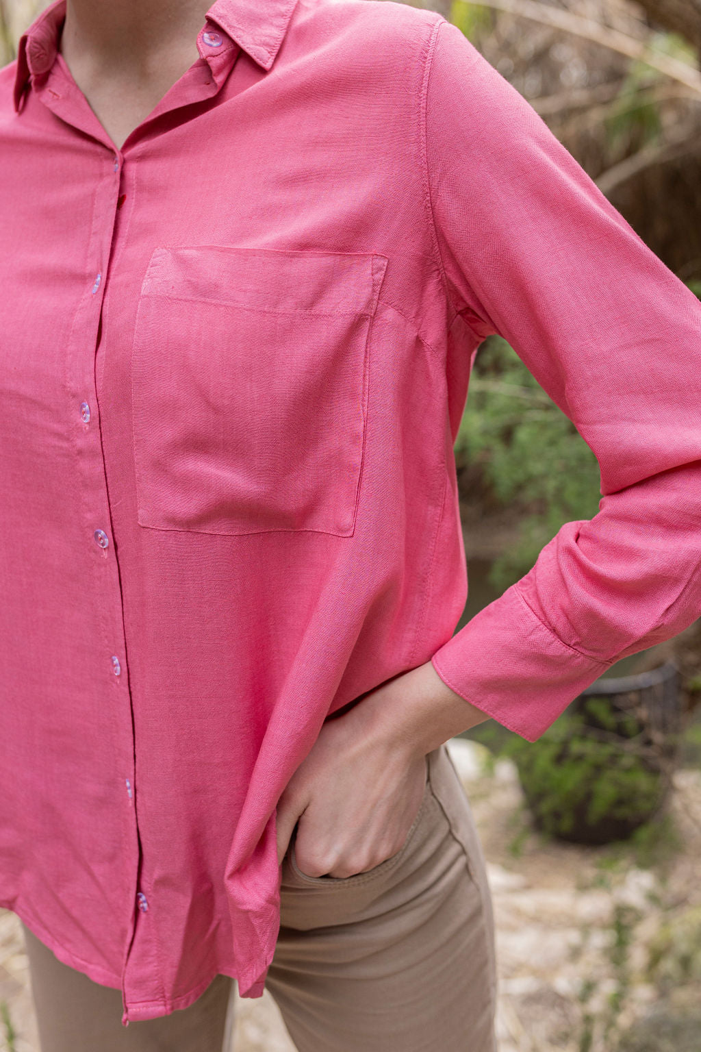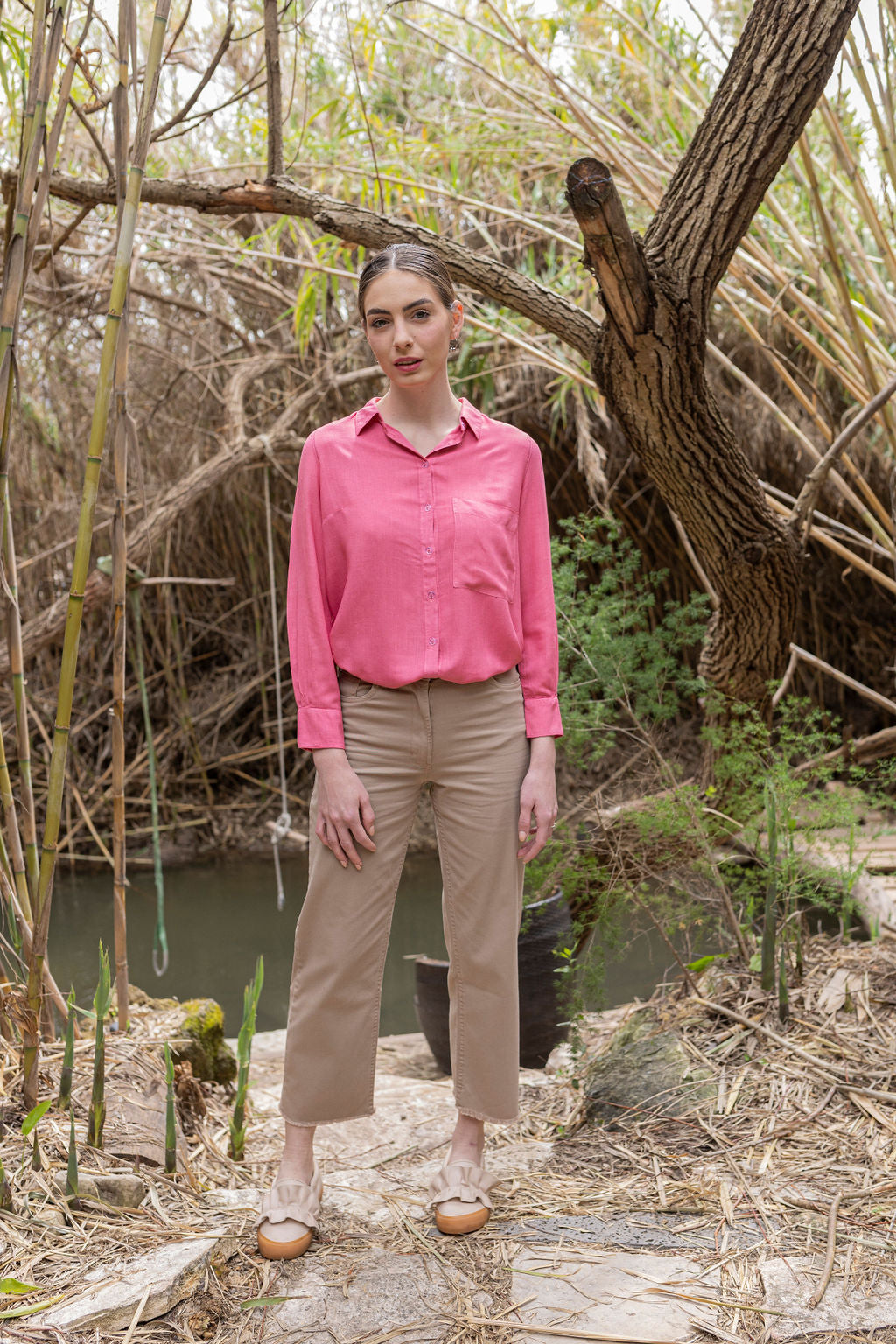 חולצה בגזרה נינוחה, מכופתרת , נהדרת ללבישה סגורה כחולצה, או פתוחה כעליונית. החולצה עשויה בד נעים ורך, עם רקמת לב בפנים הכפתרה