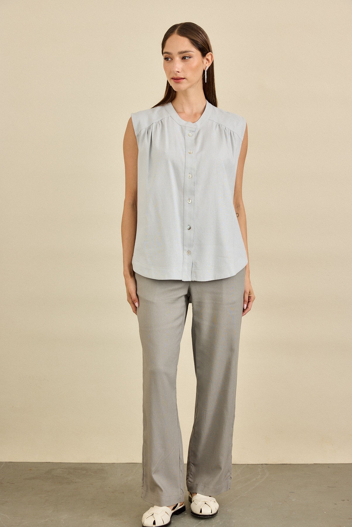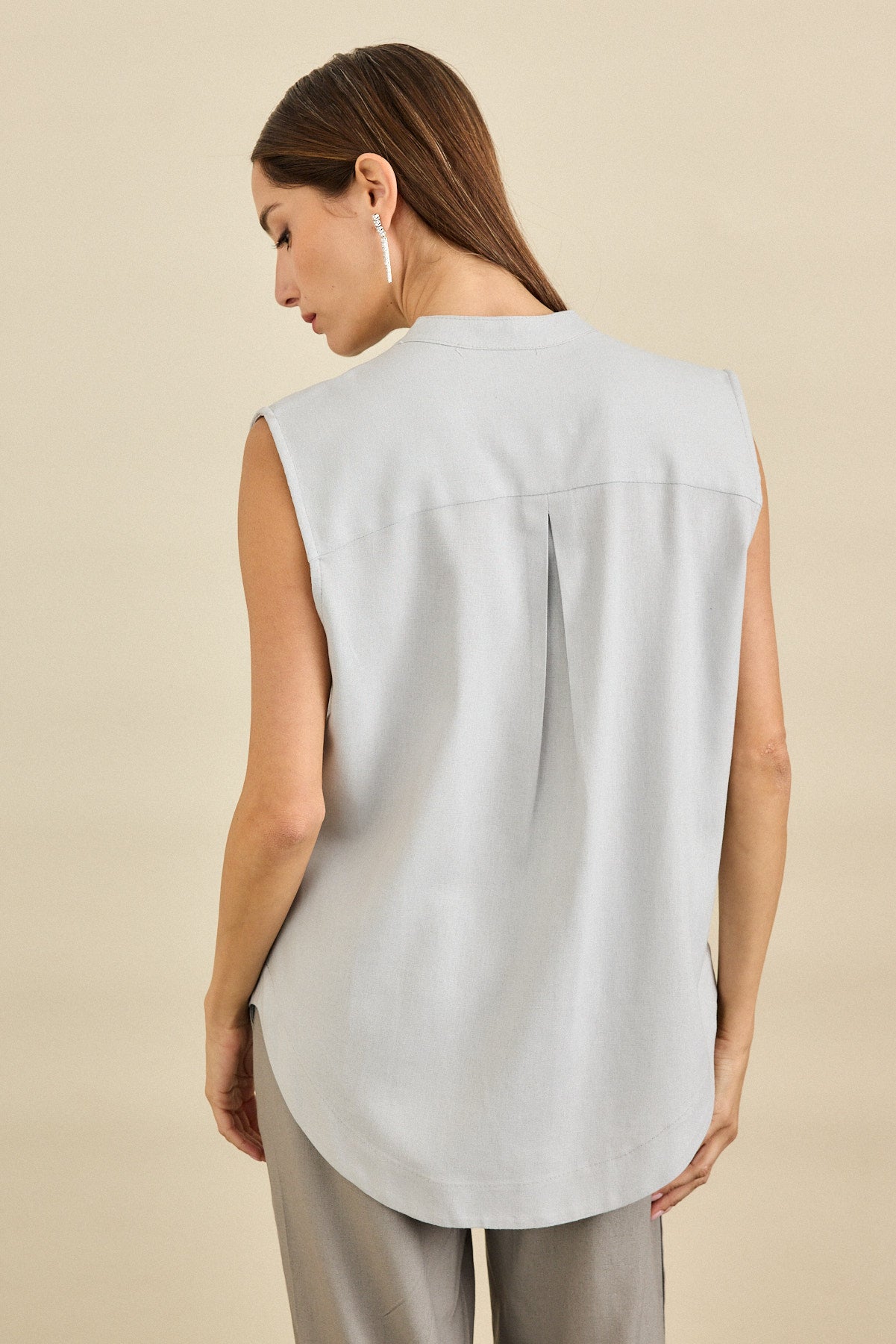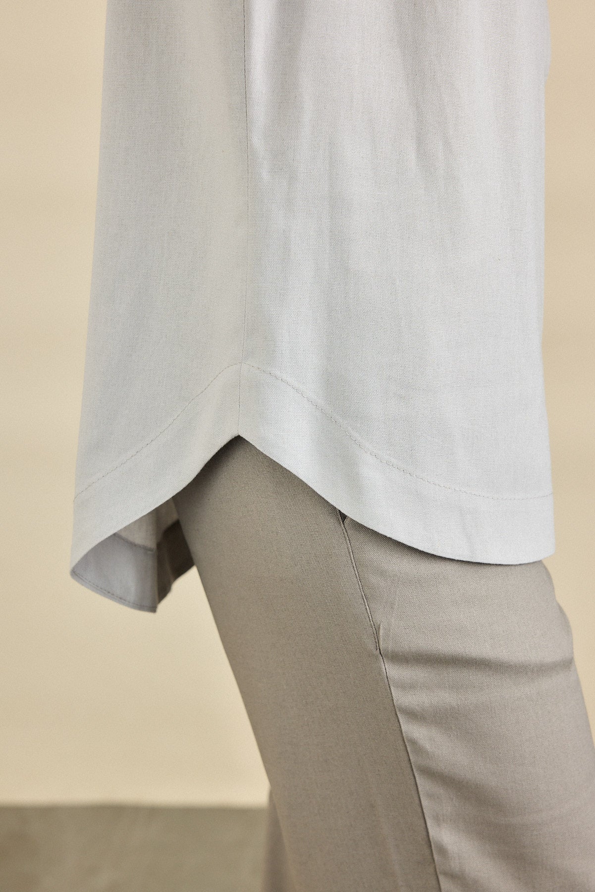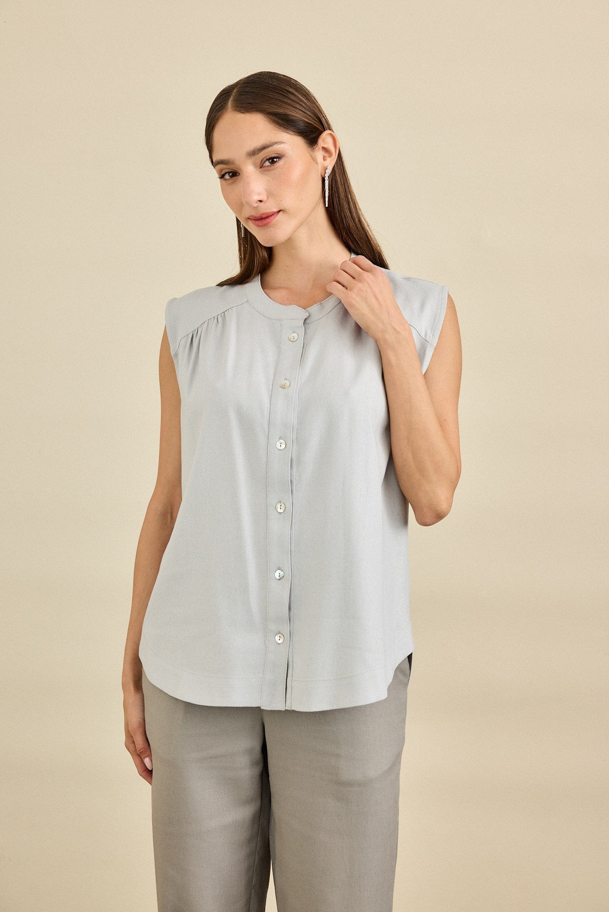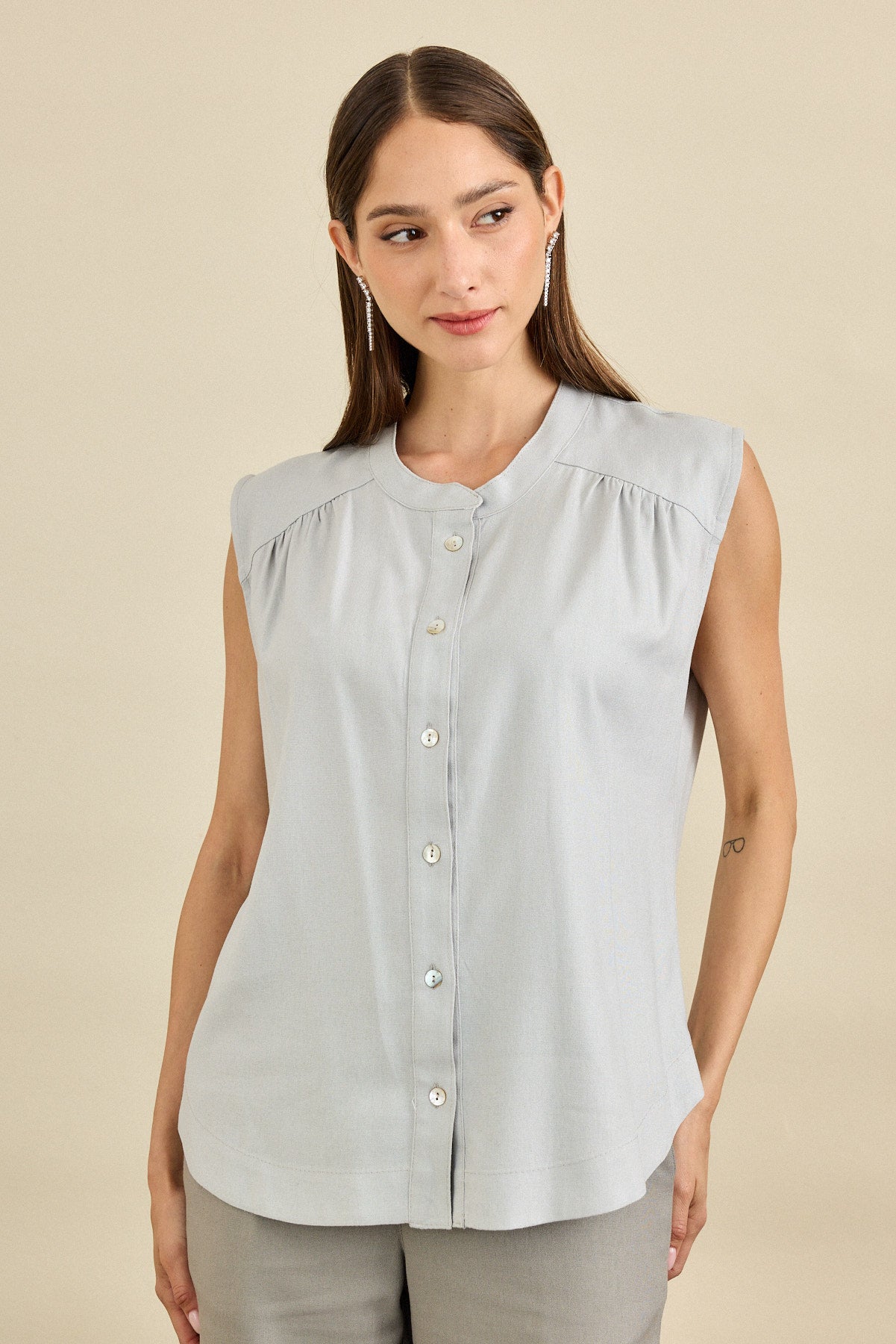 לחולצה כפתרה, צווארון סיני ואלמנט של כיווץ מתחת לכתף.