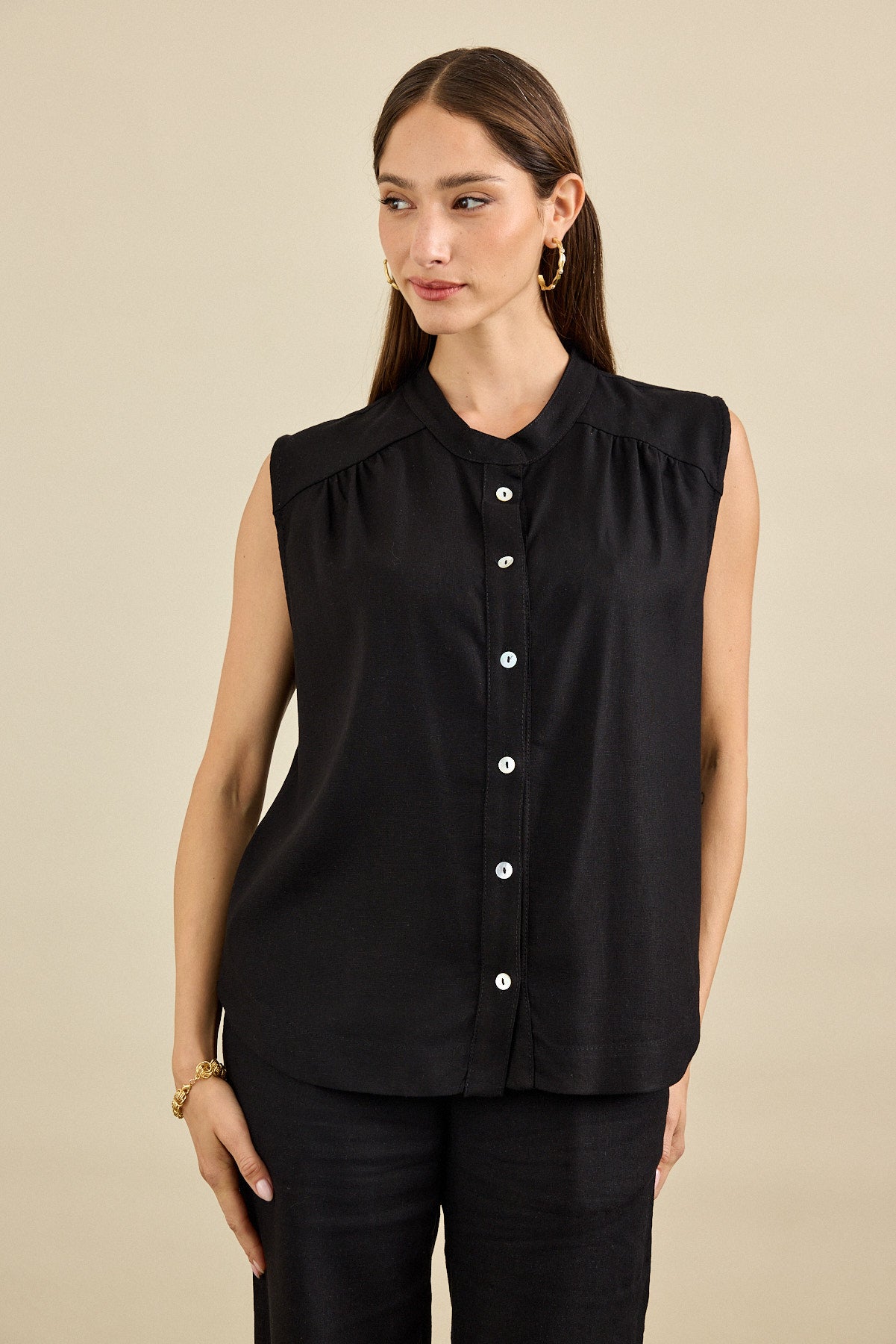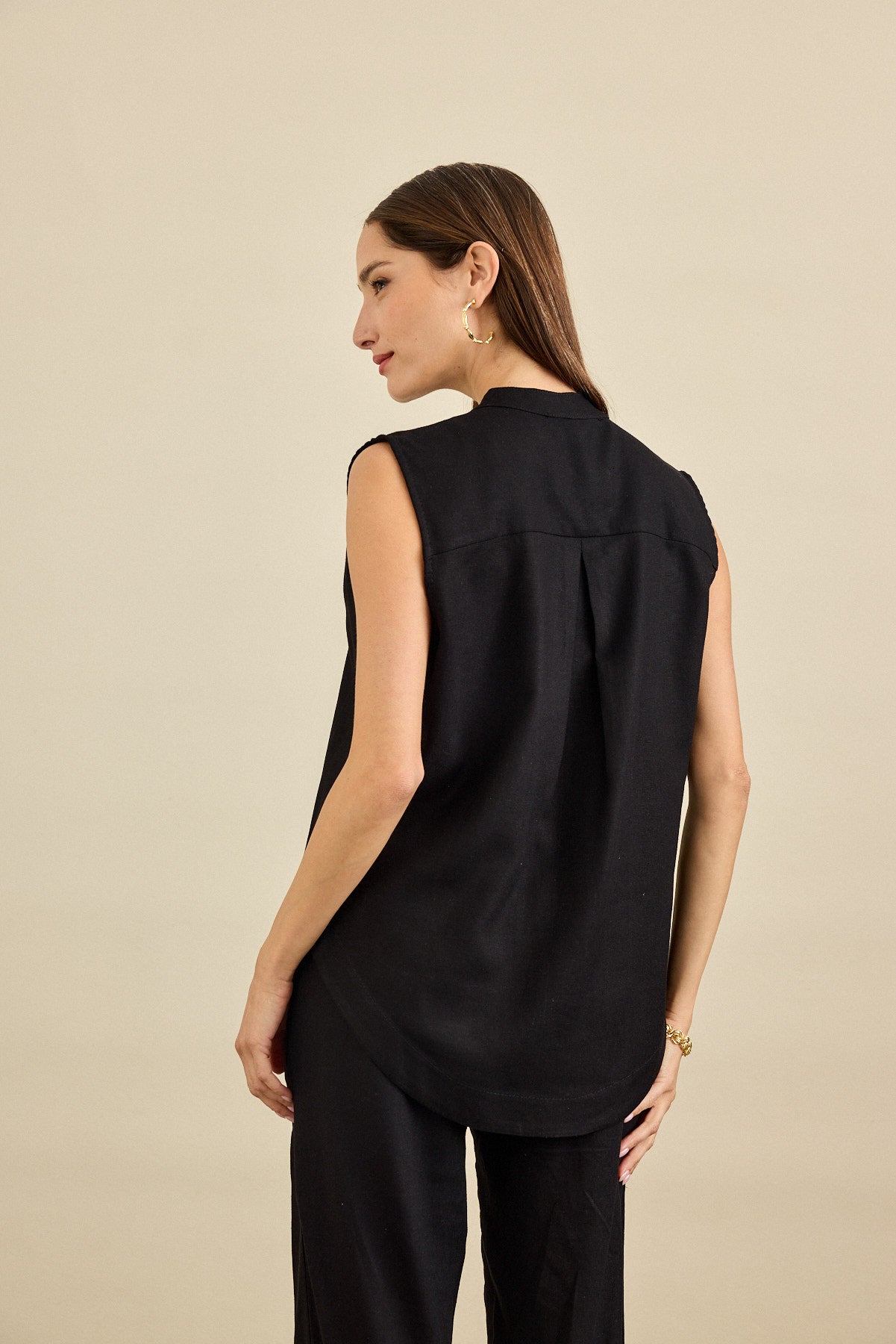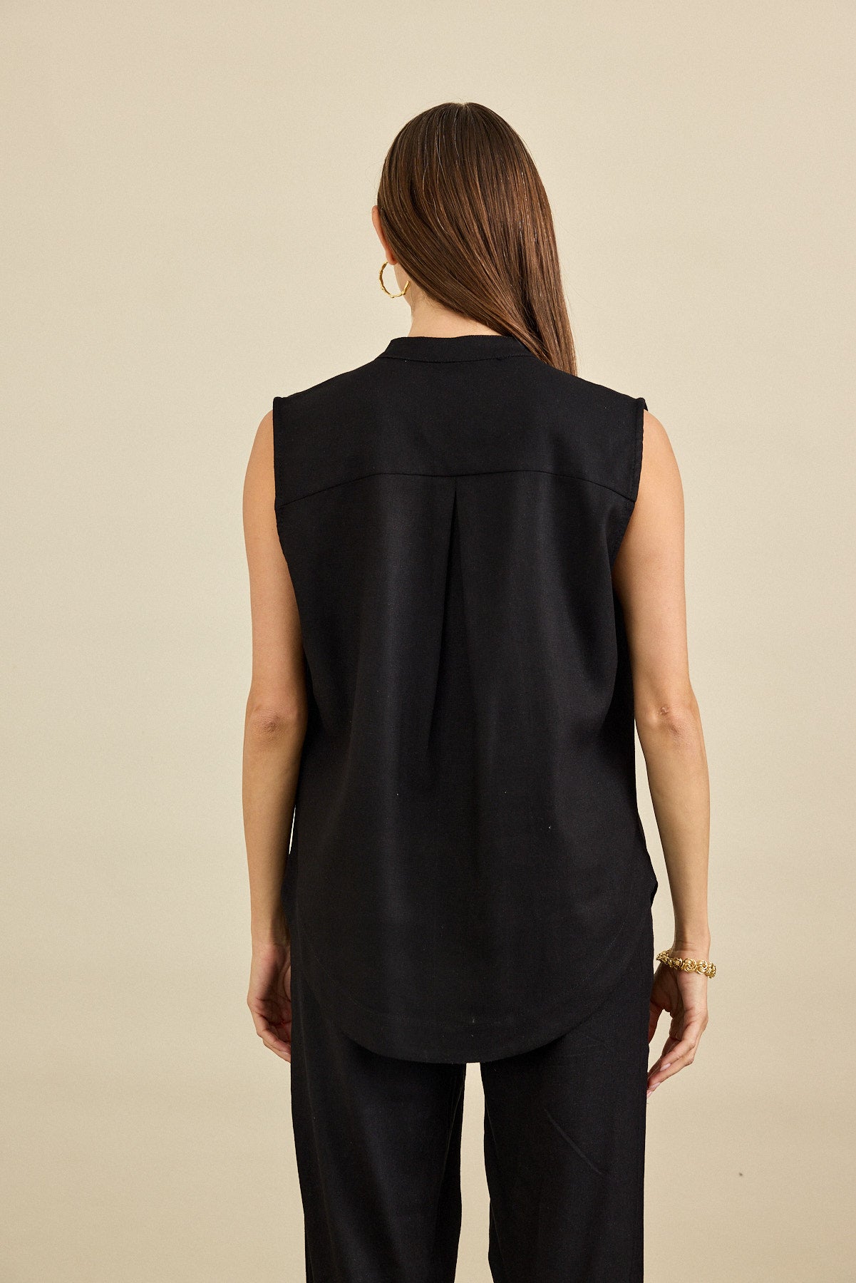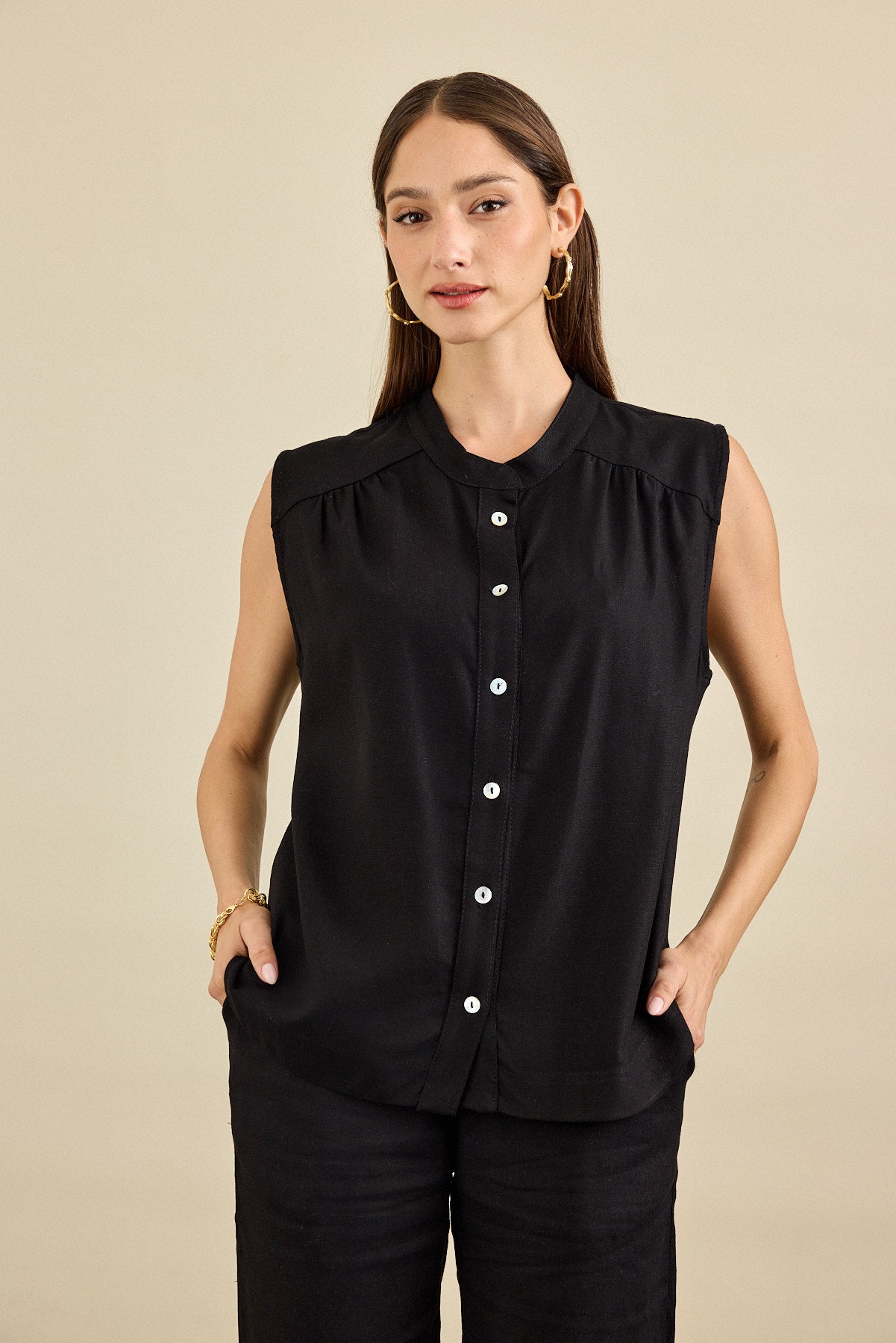 לחולצה צווארון סיני והיא ללא שרוולים.