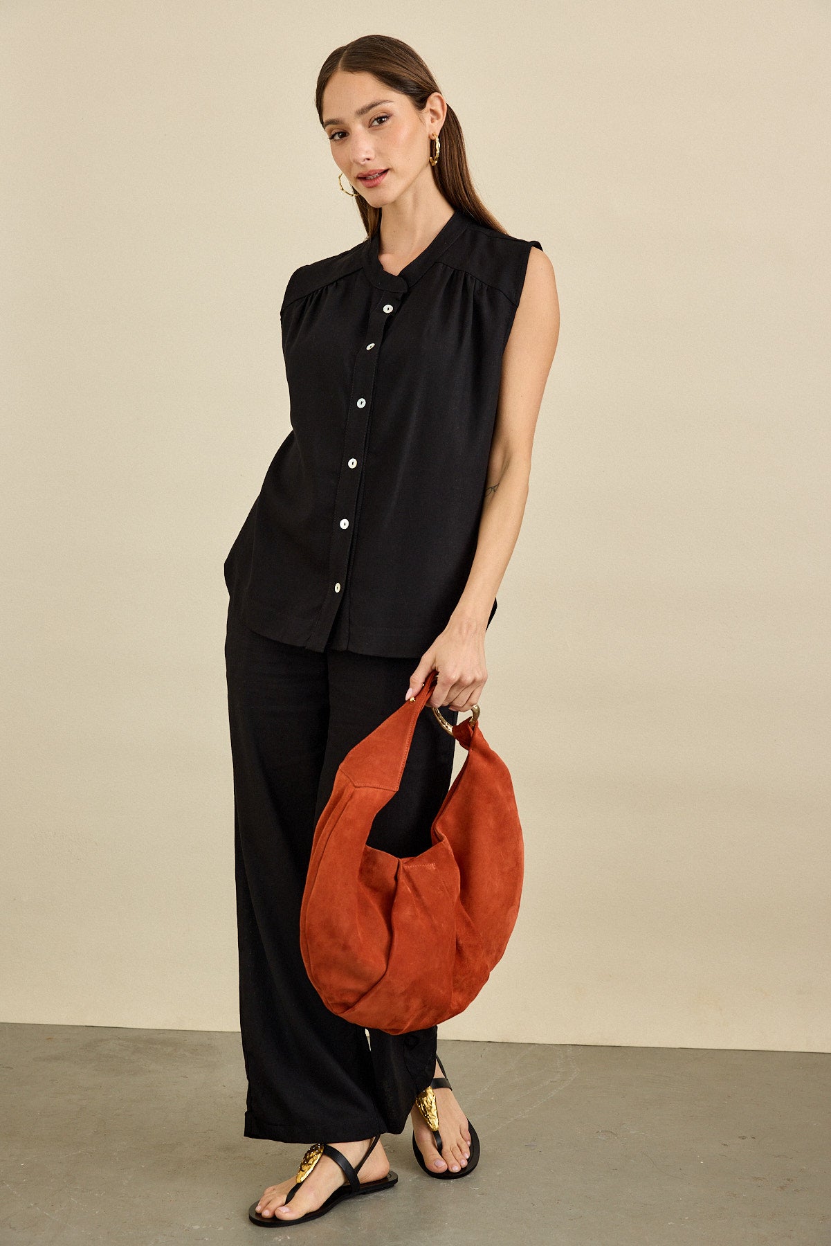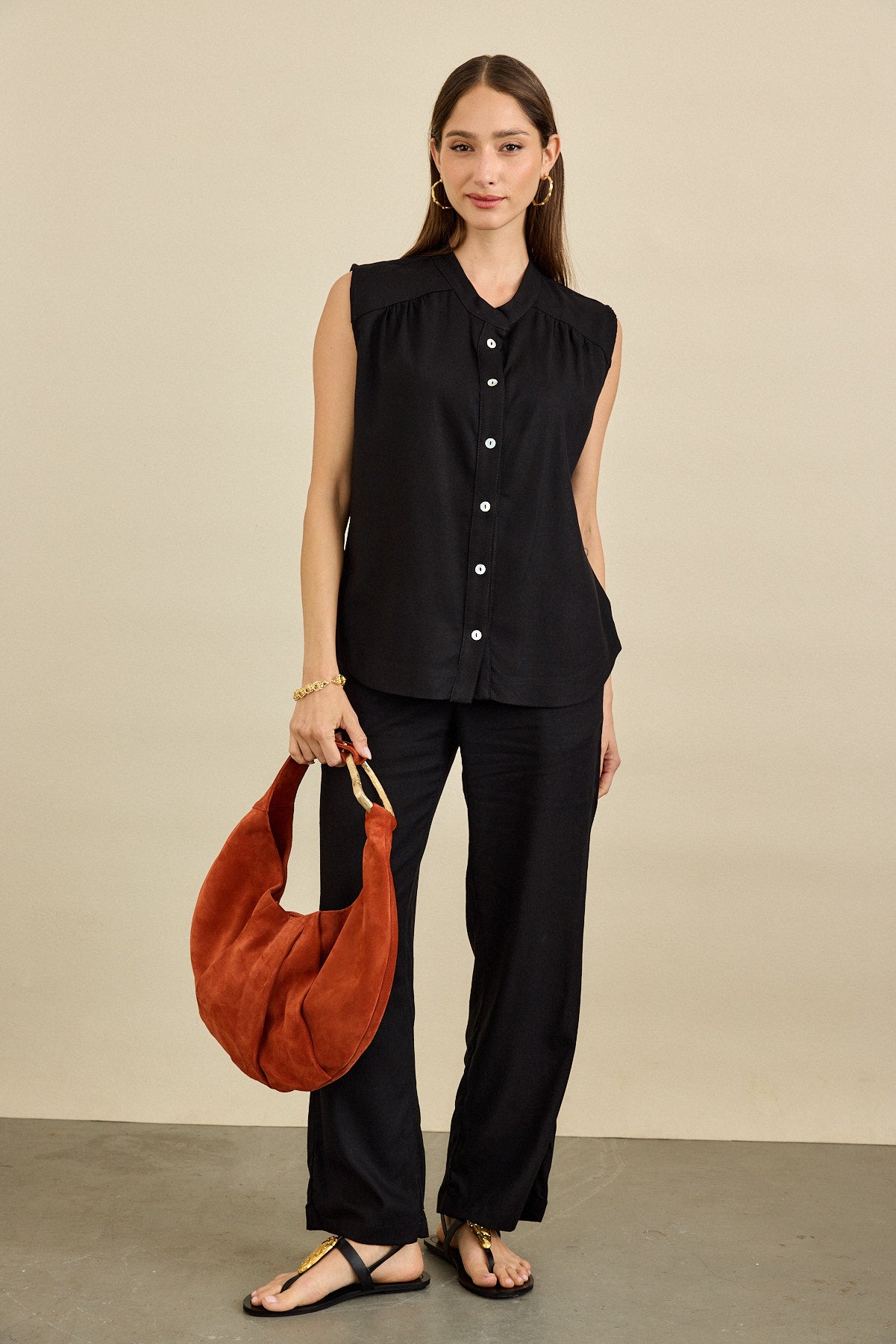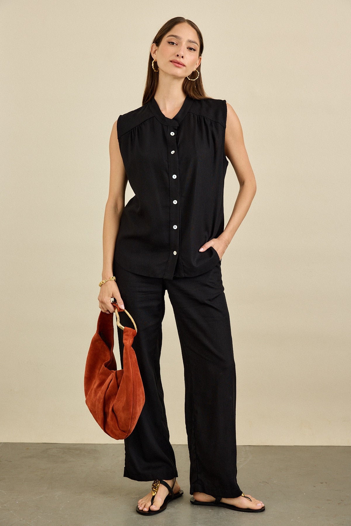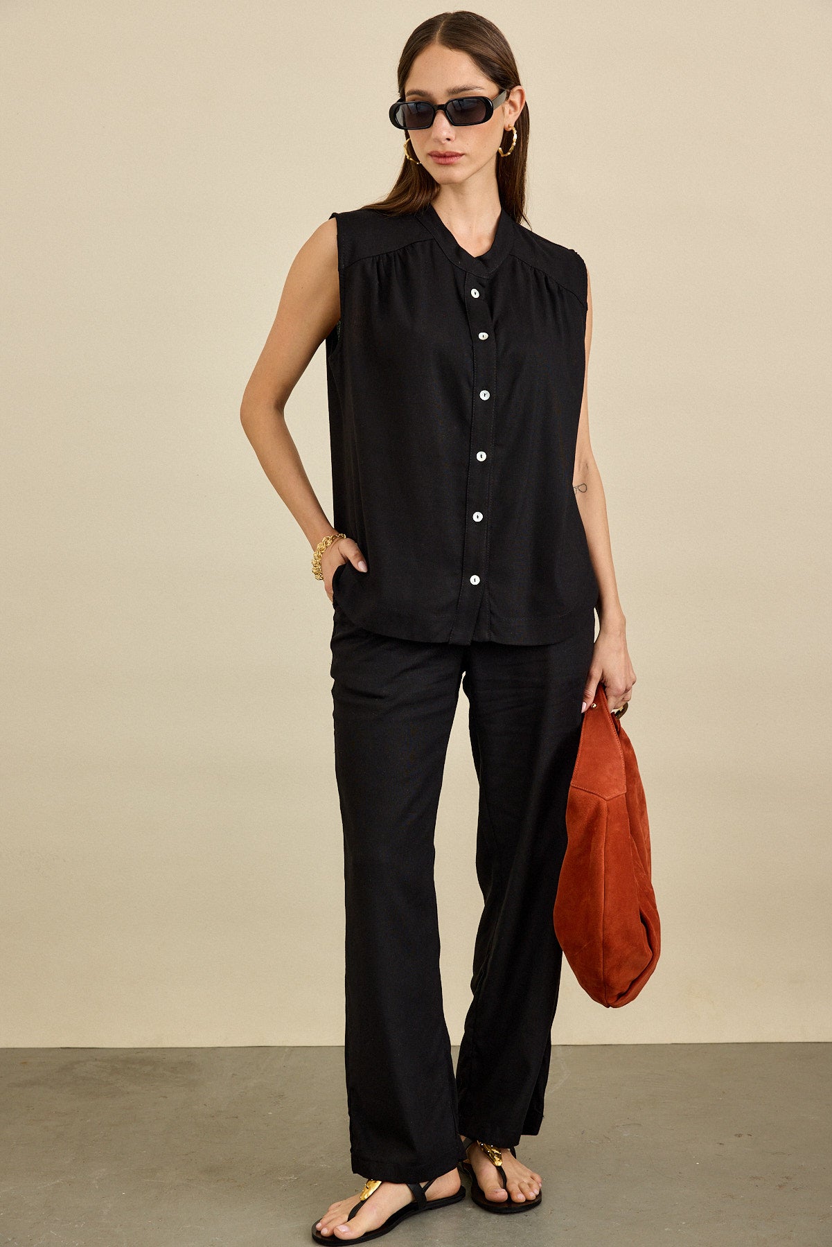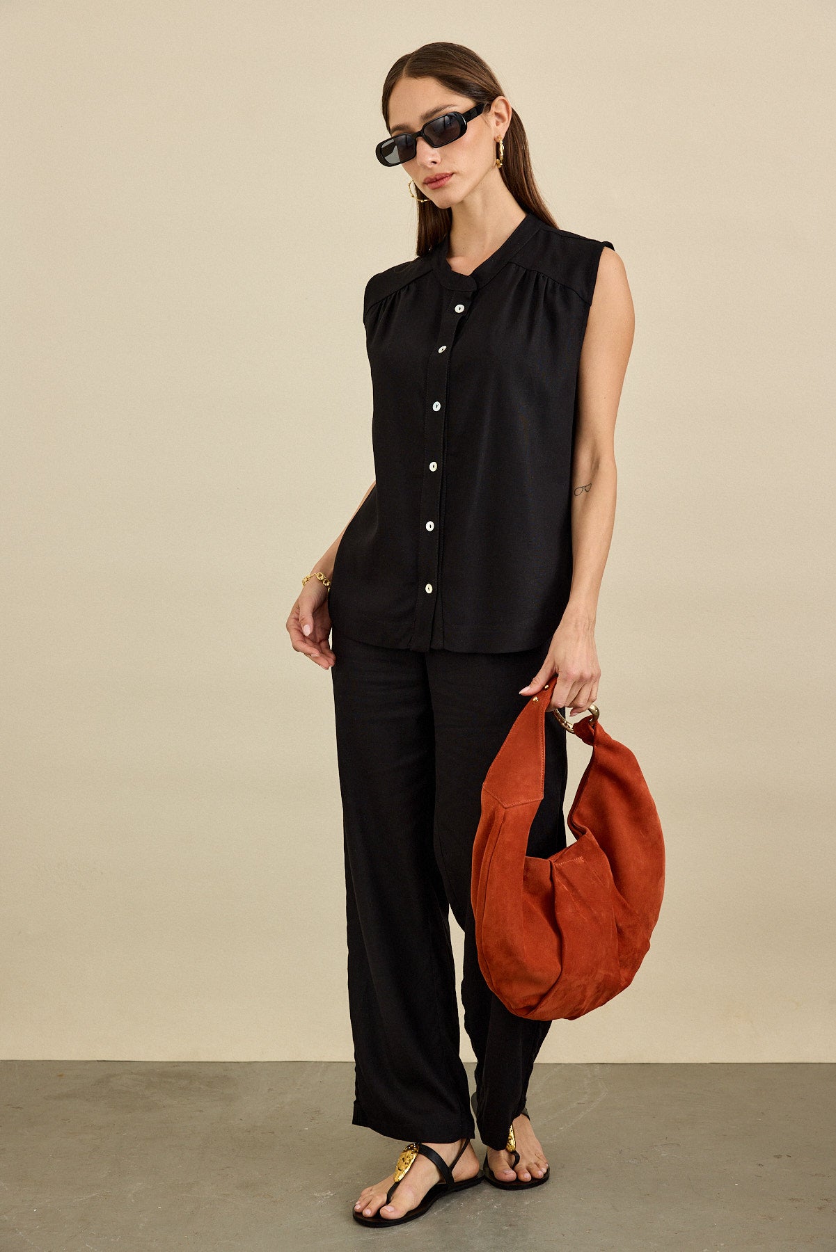 לחולצה צווארון סיני והיא ללא שרוולים.