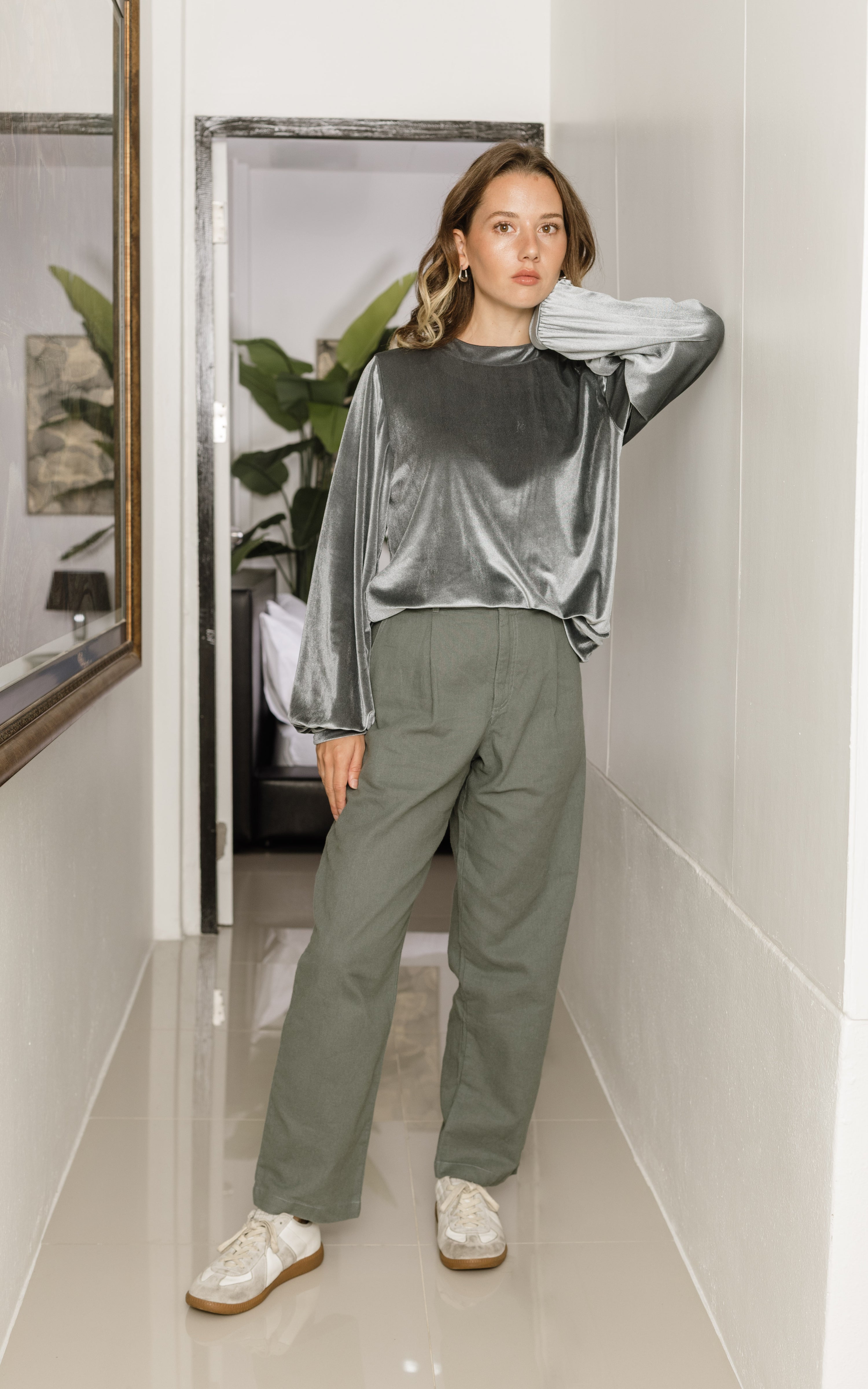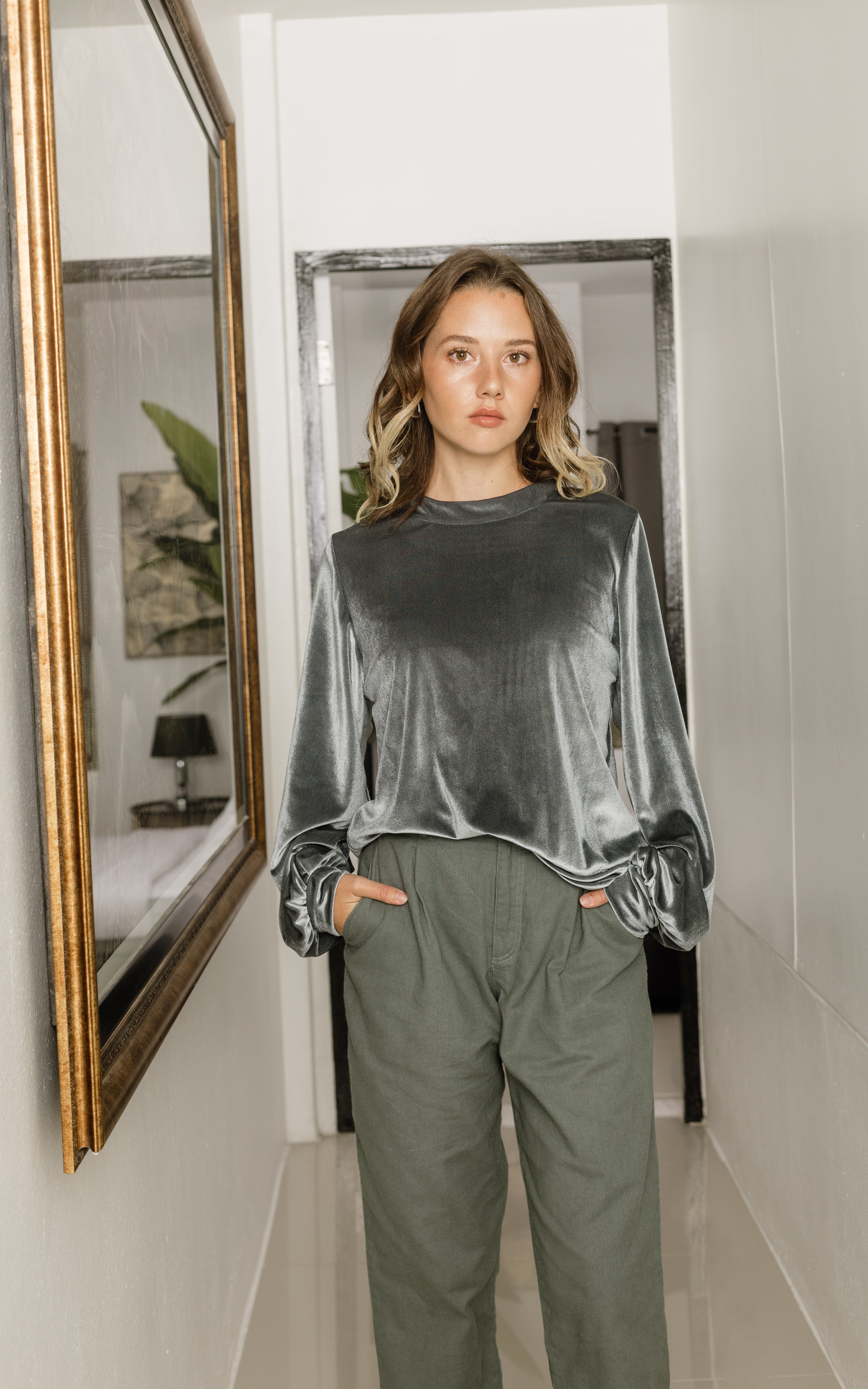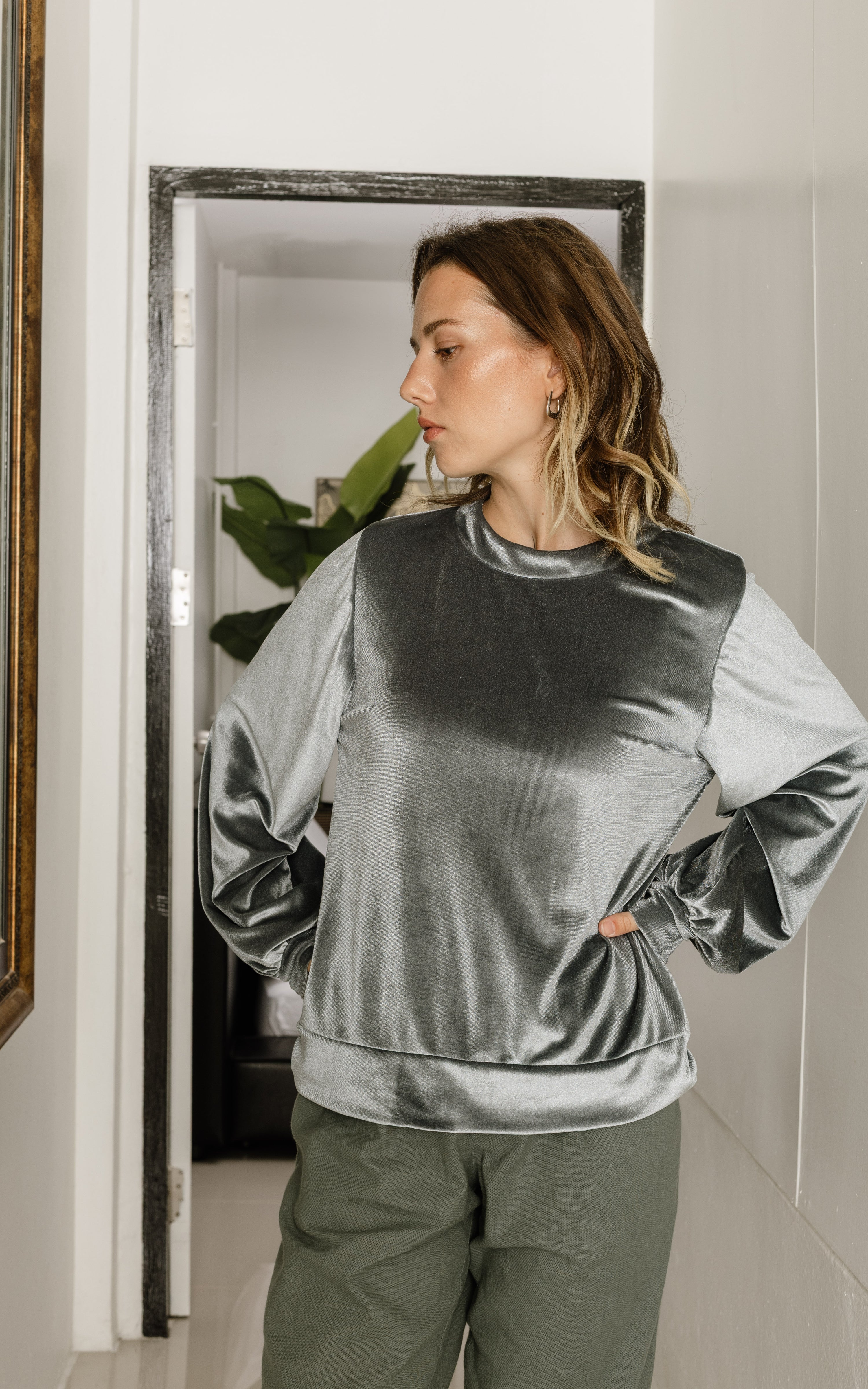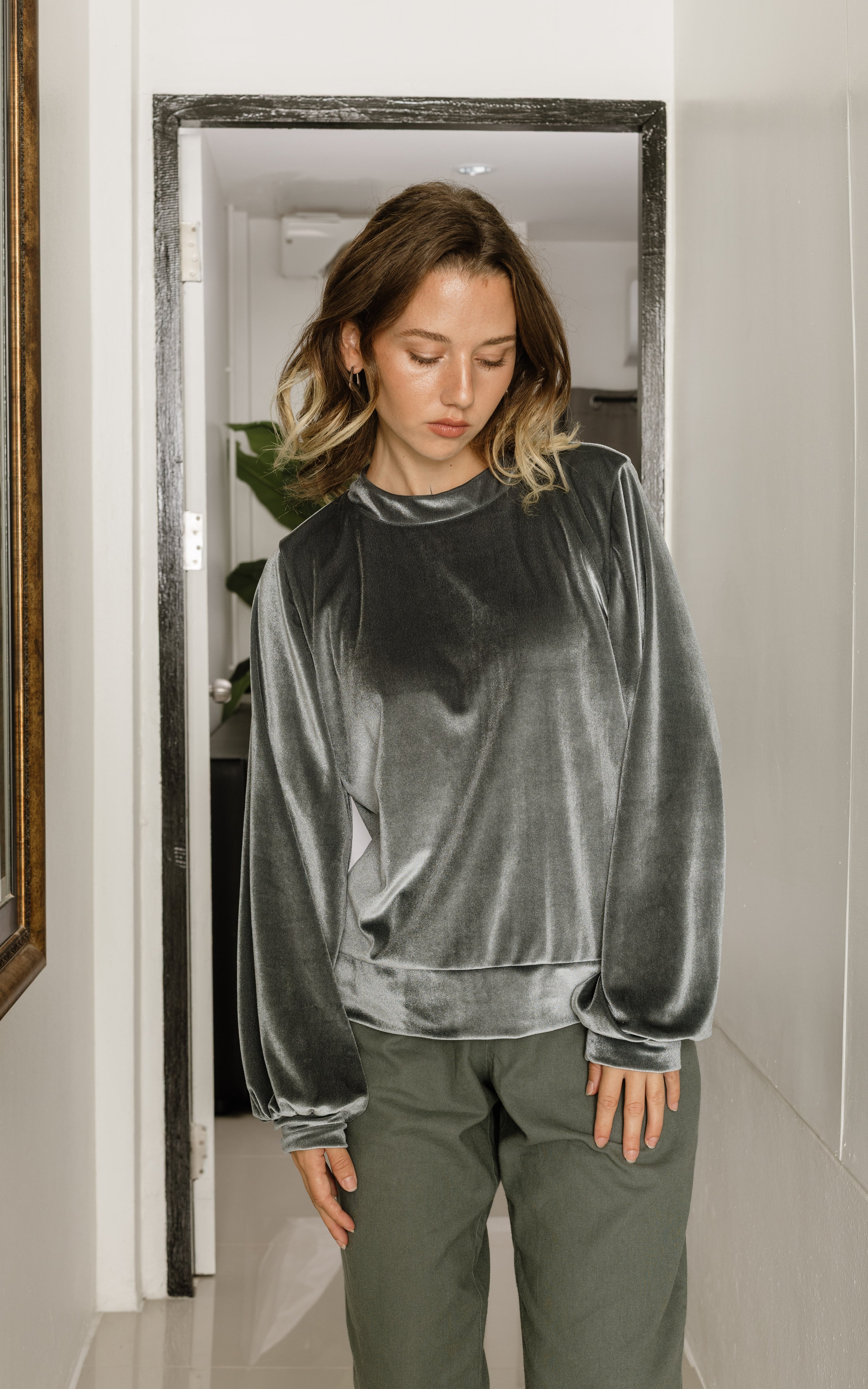 טופ קטיפה בגזרה משוחררת עם אלמנט של שרוול טפוח