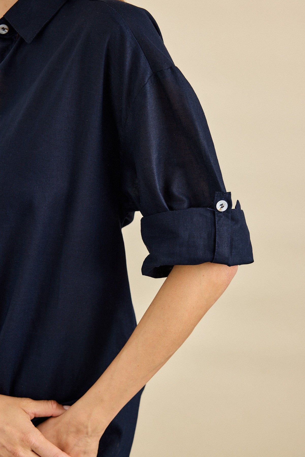 בשרוול כפתור ורצועה כדי לקפל ולקבע את השרוול