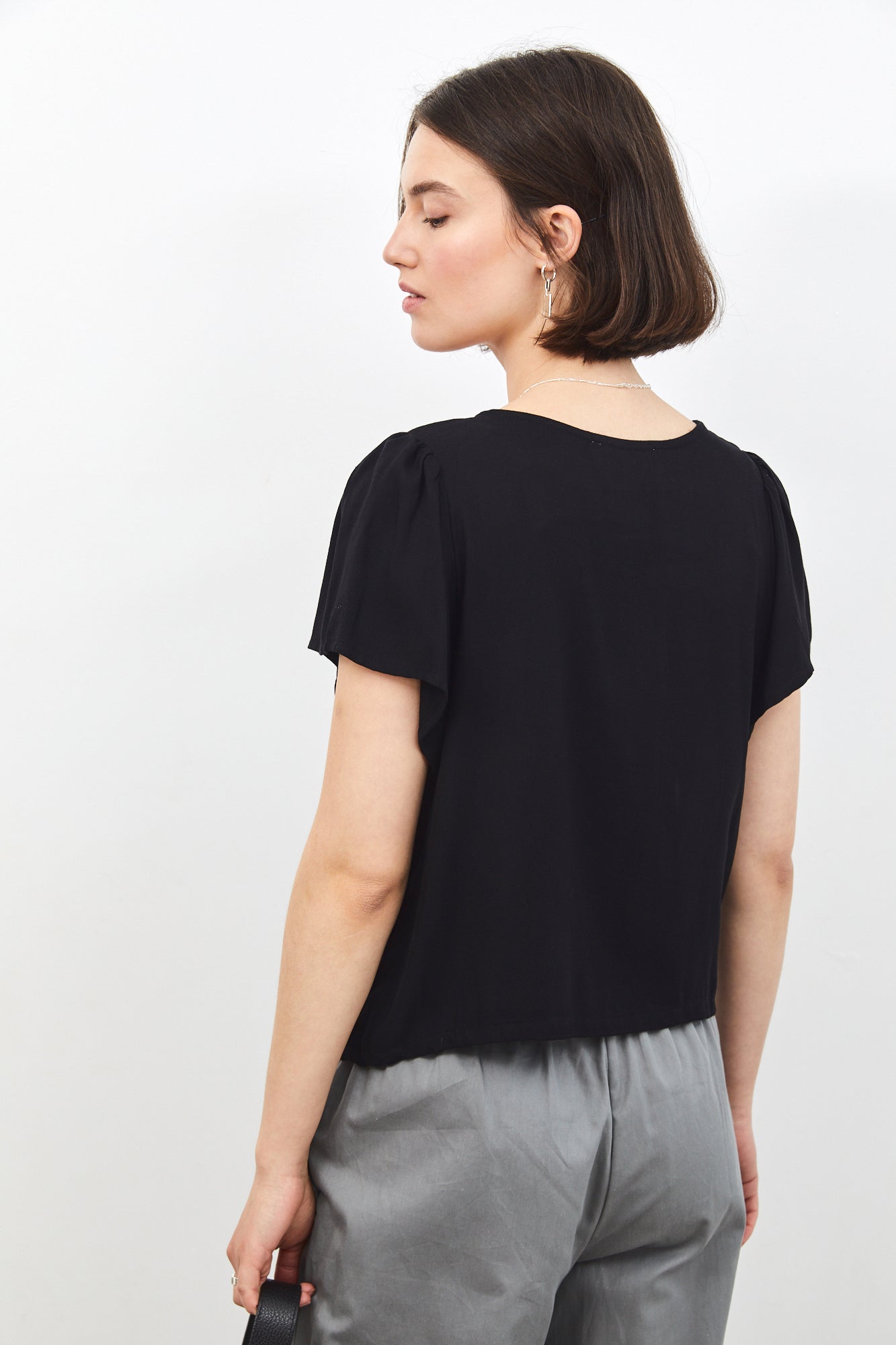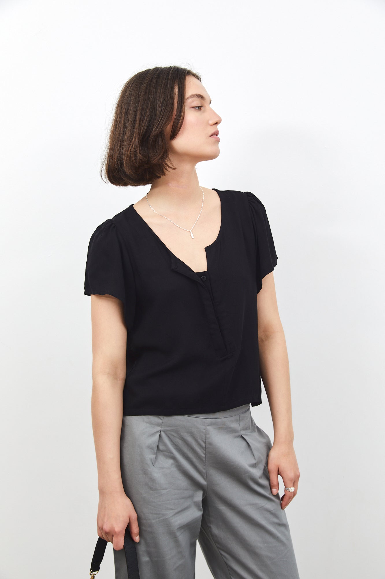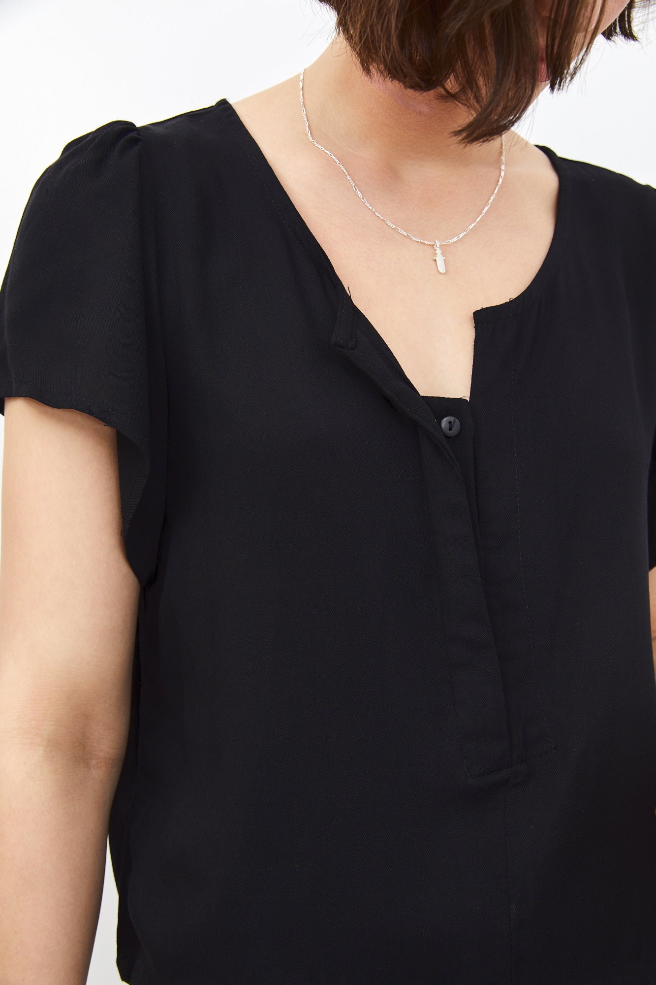 חולצה קלילה, בעלת מפתח צוואר עגול, , וכפתרה נסתרת. החולצה עשויה בד ויסקוזה רך