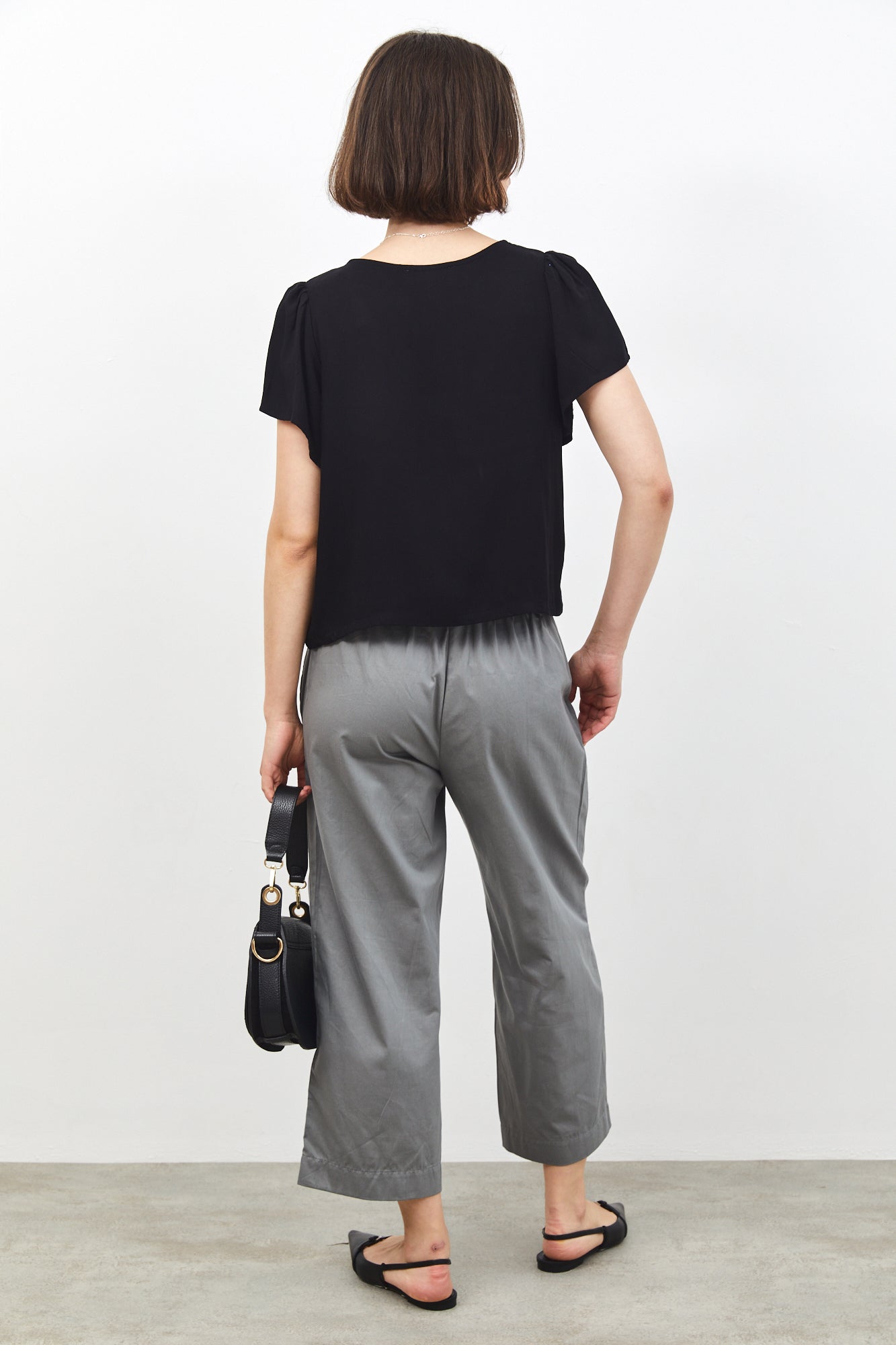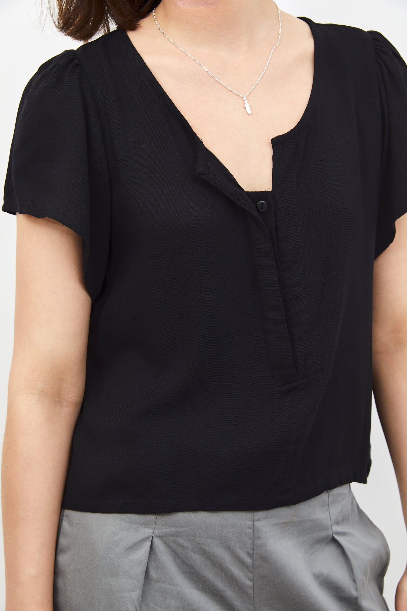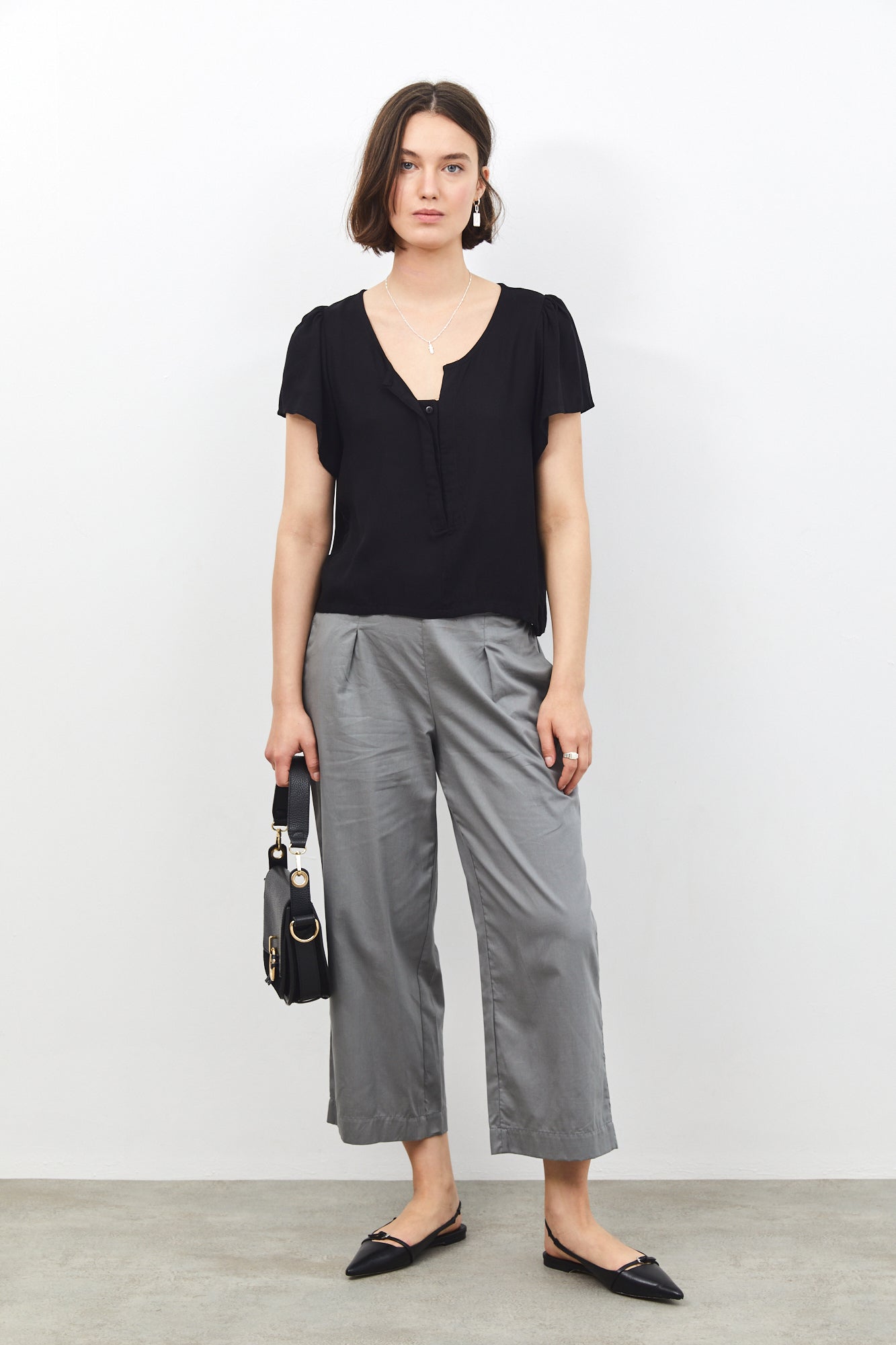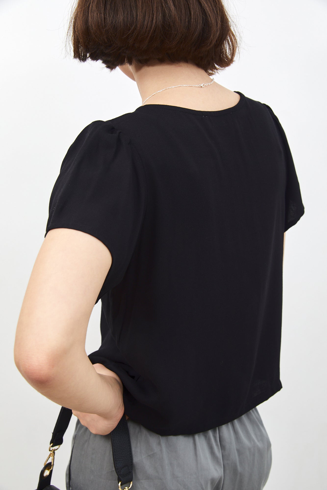 חולצה קלילה, בעלת מפתח צוואר עגול, , וכפתרה נסתרת. החולצה עשויה בד ויסקוזה רך