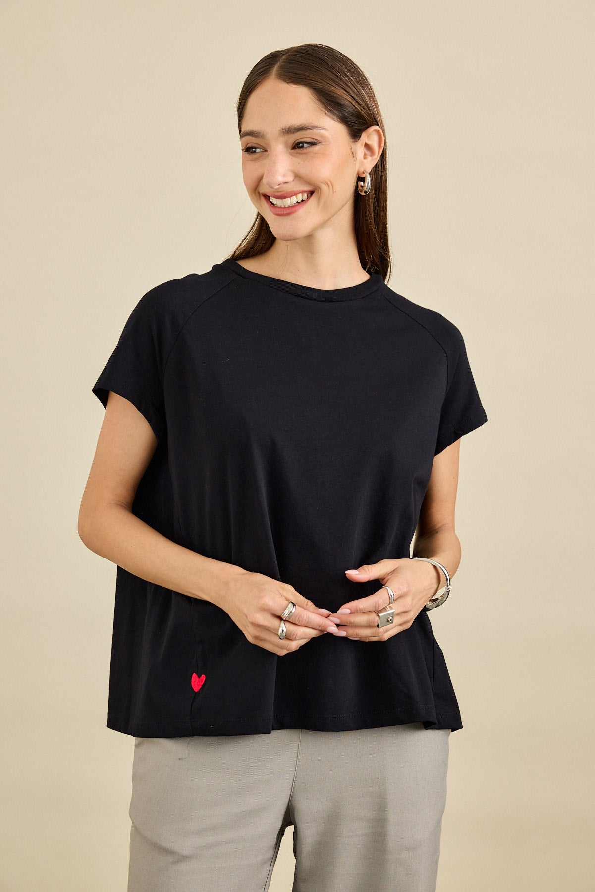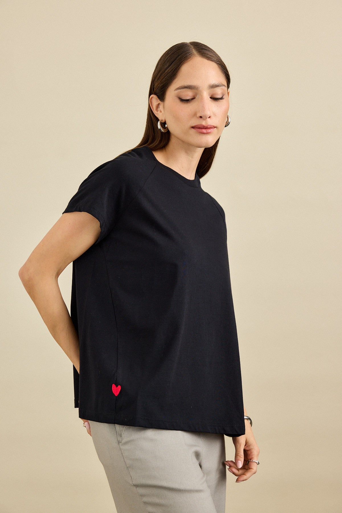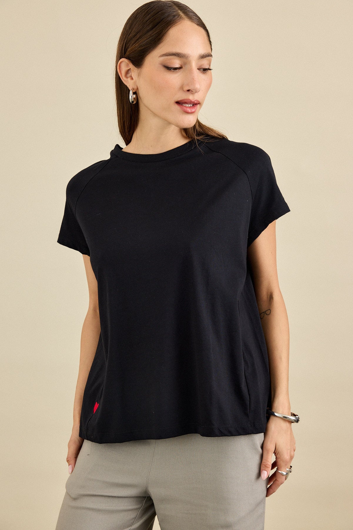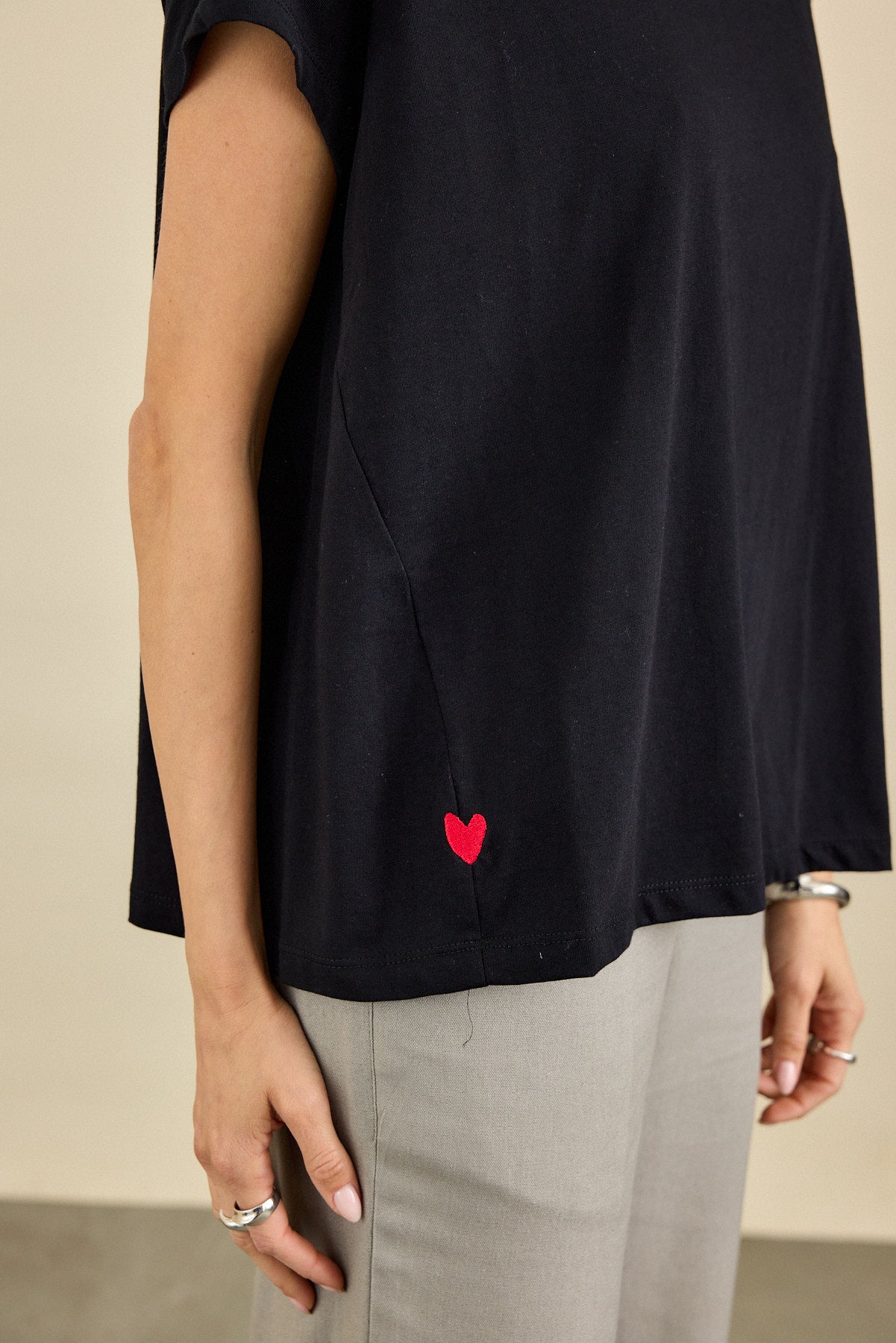 חולצת טי-שירט בגזרה רחוקה מהגוף עם מפתח הצוואר עגול . לחולצה שרוולי "רגלן", תפר צד מחמיא ובו רקמת לב