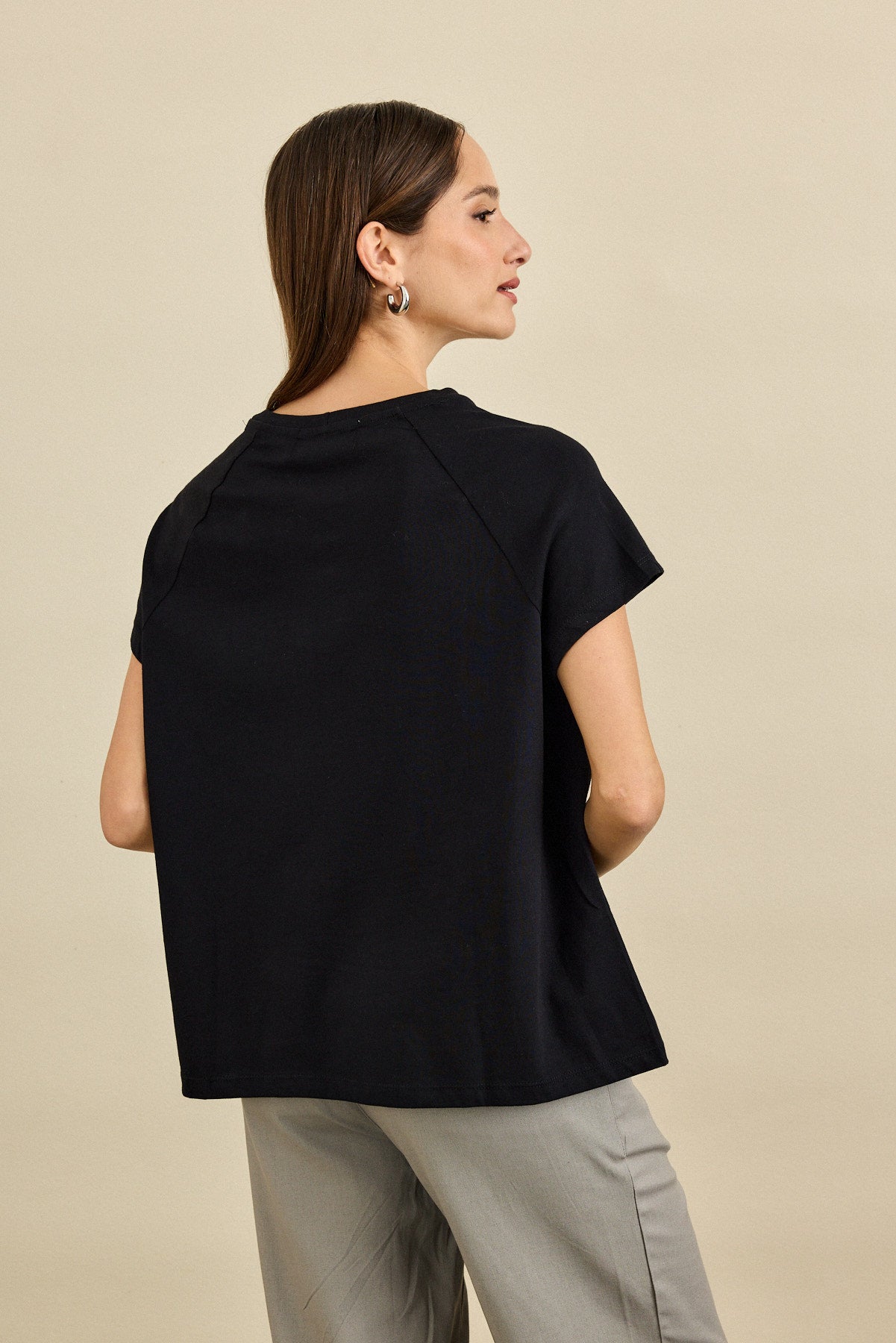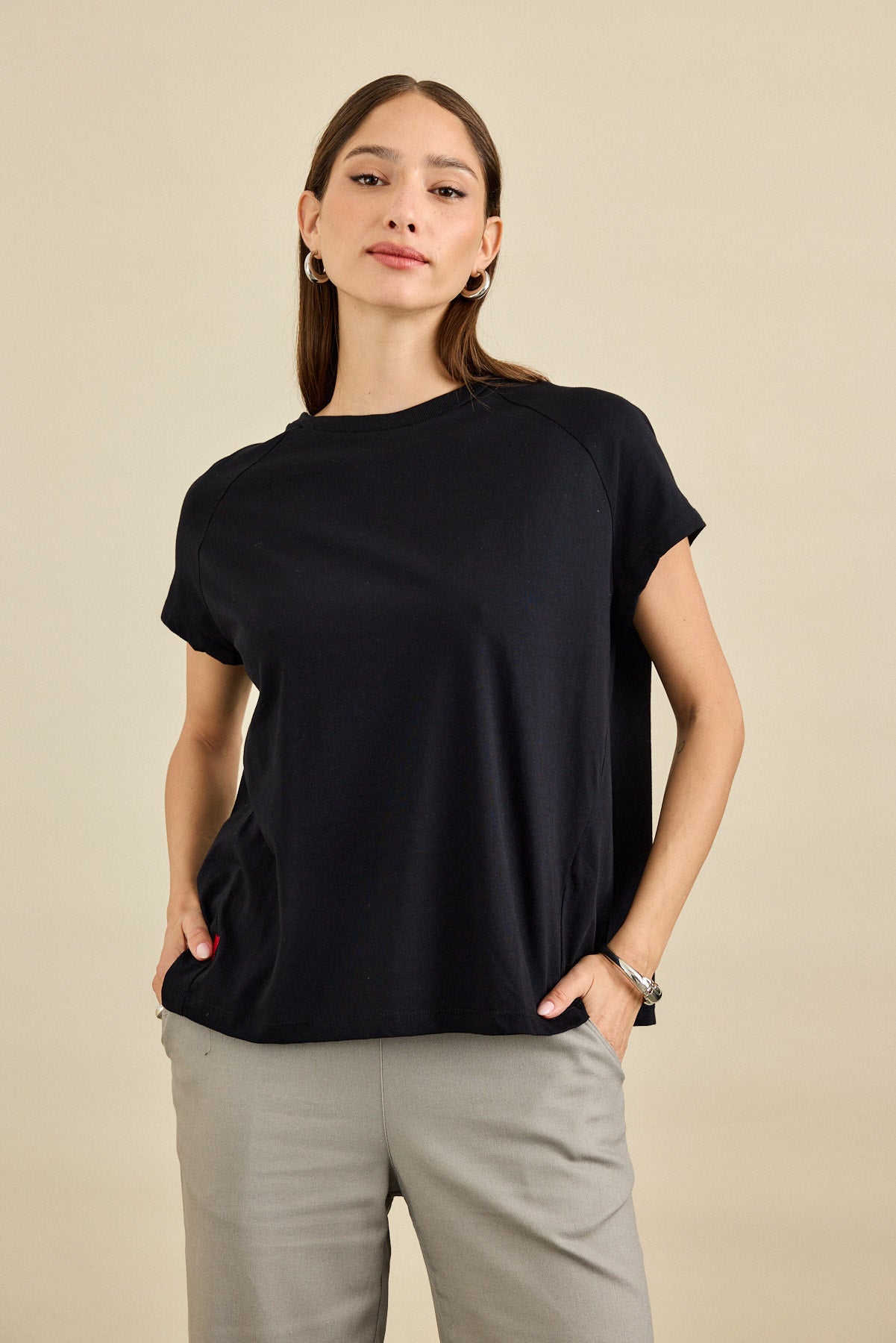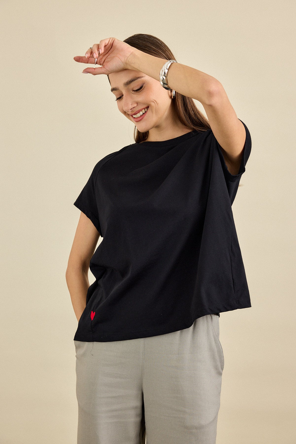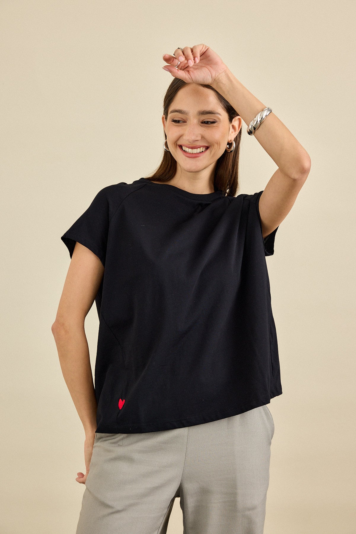 חולצת טי-שירט בגזרה רחוקה מהגוף עם מפתח הצוואר עגול . לחולצה שרוולי "רגלן", תפר צד מחמיא ובו רקמת לב
