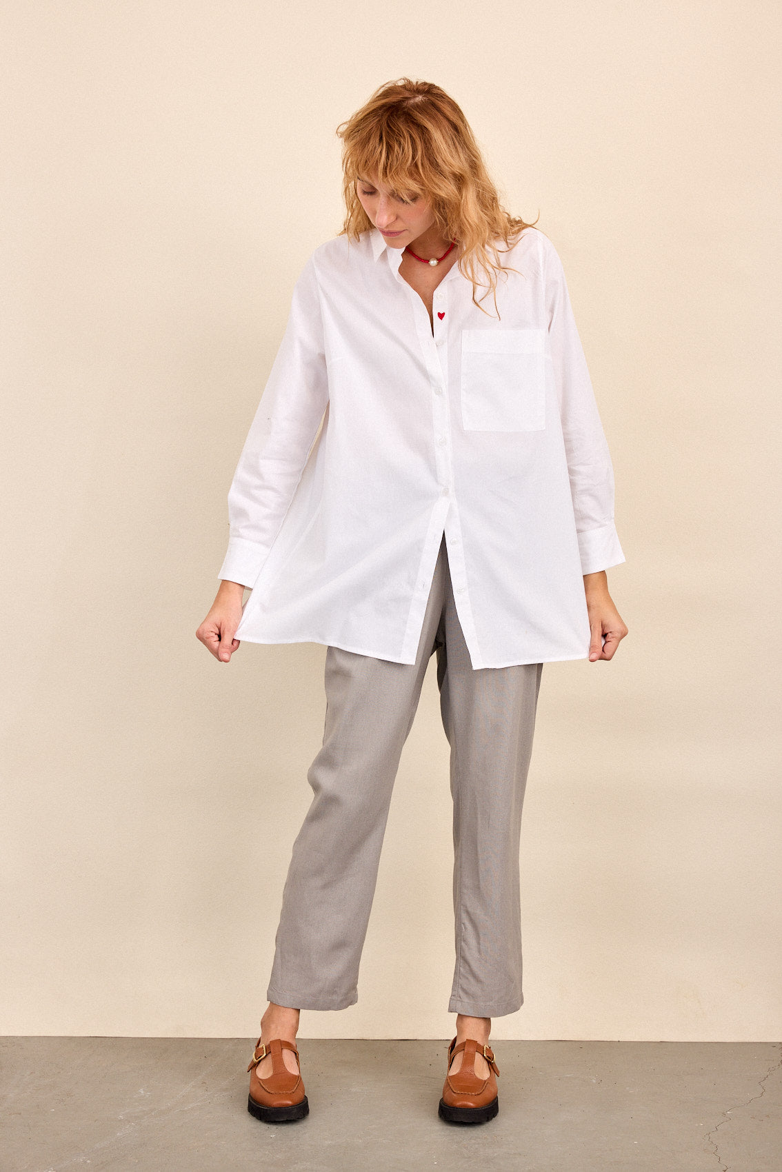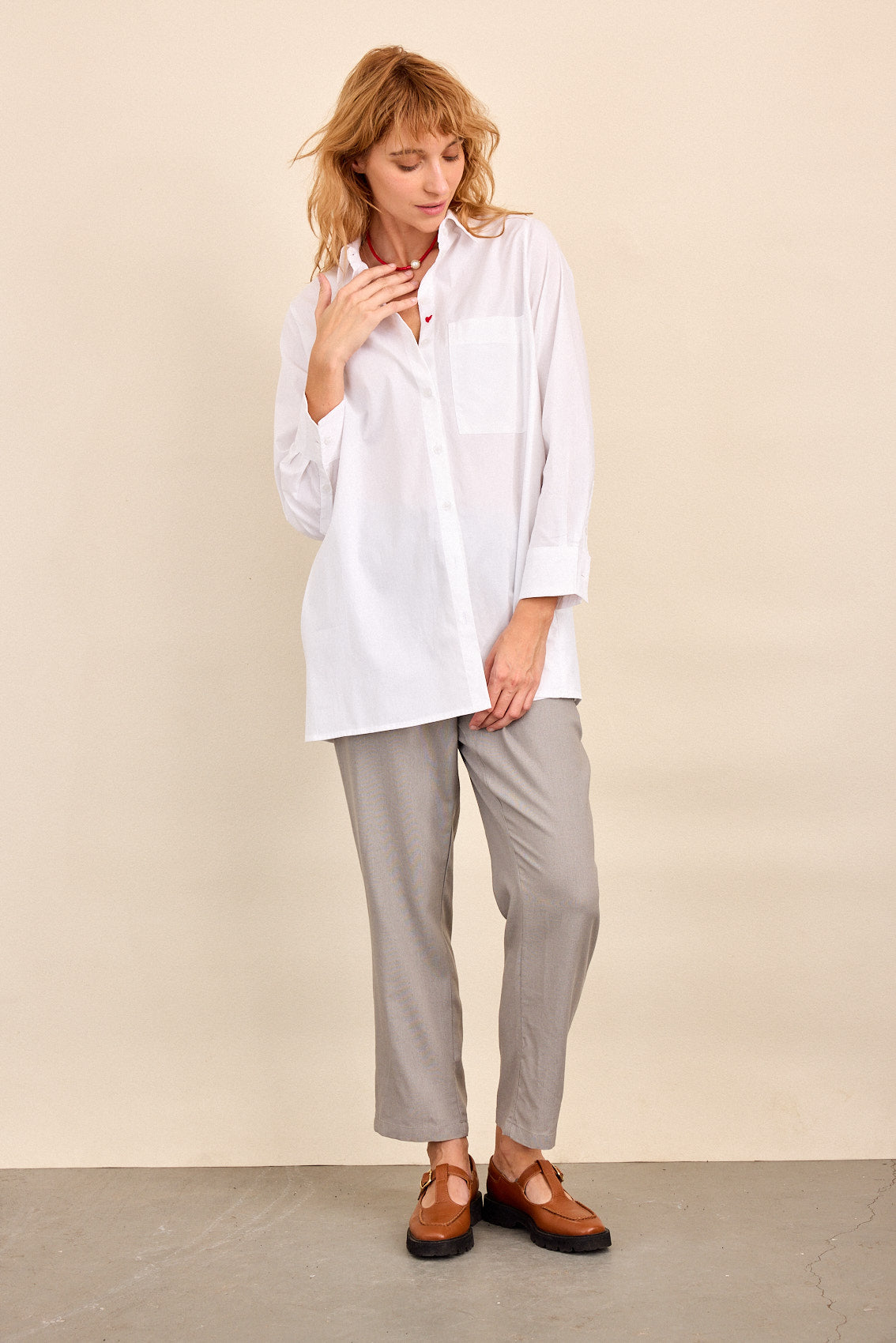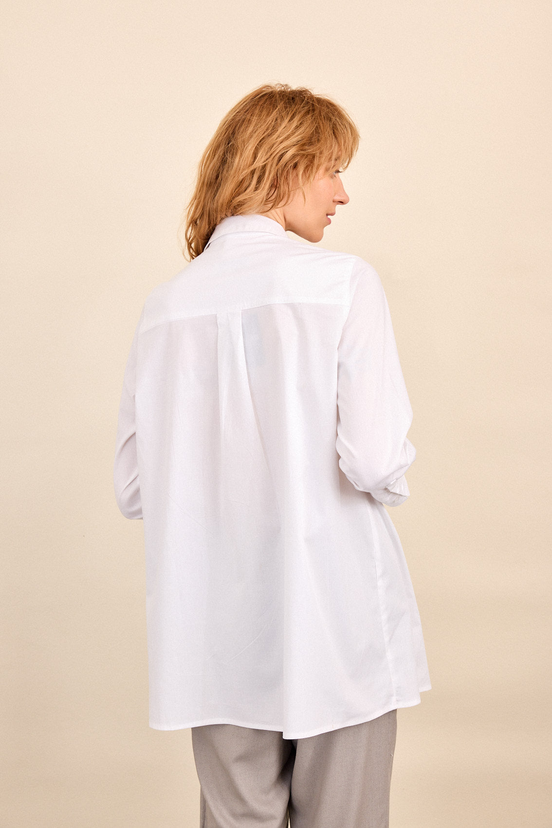 חולצה לבנה קלאסית, בגזרה נינוחה ומחמיאה .