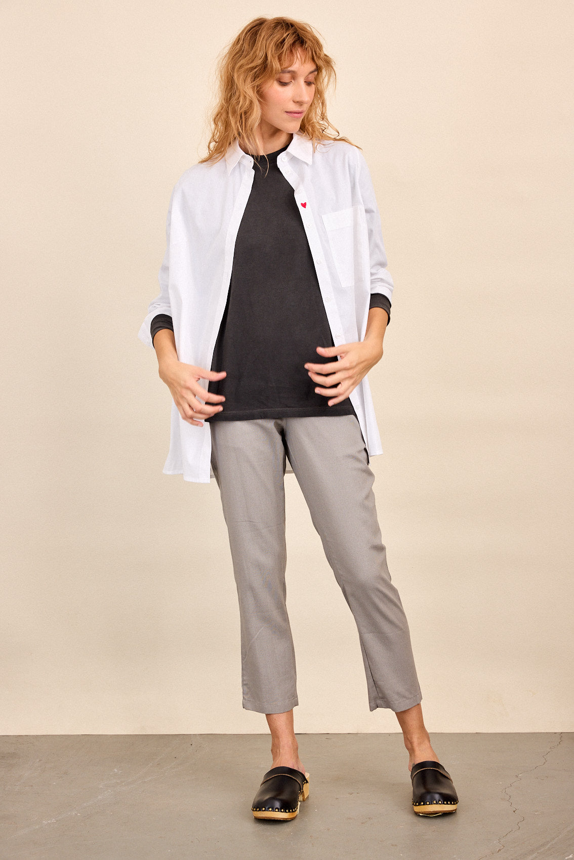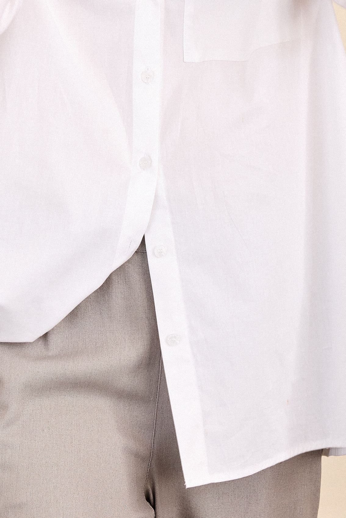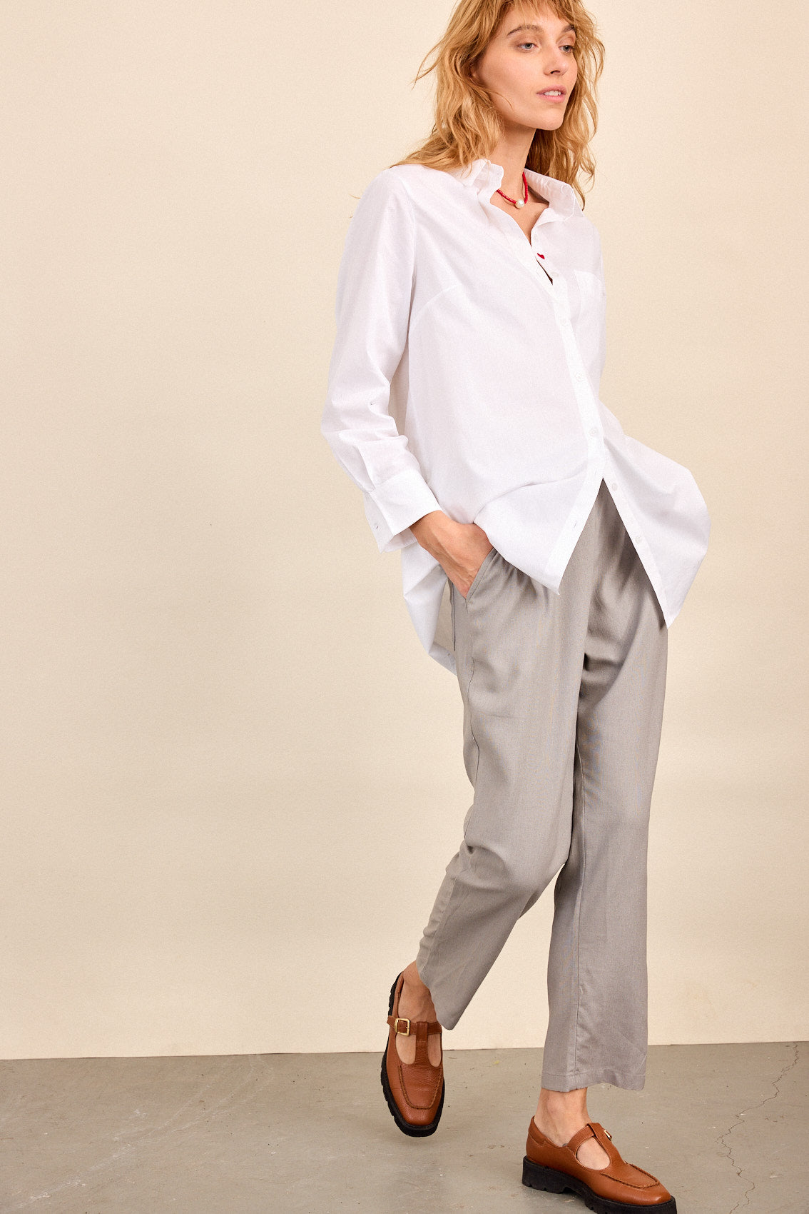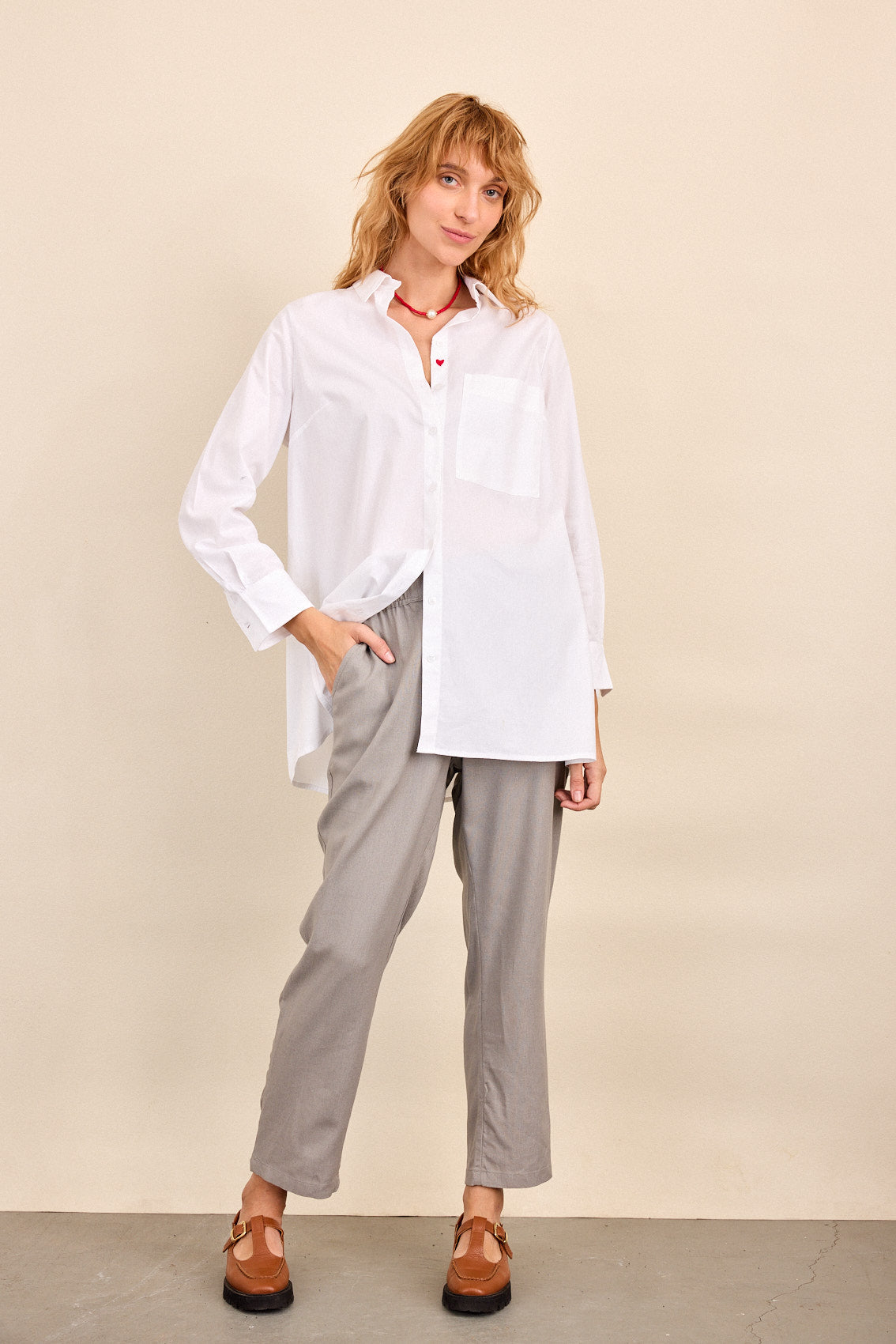 חולצה לבנה קלאסית, בגזרה נינוחה ומחמיאה .