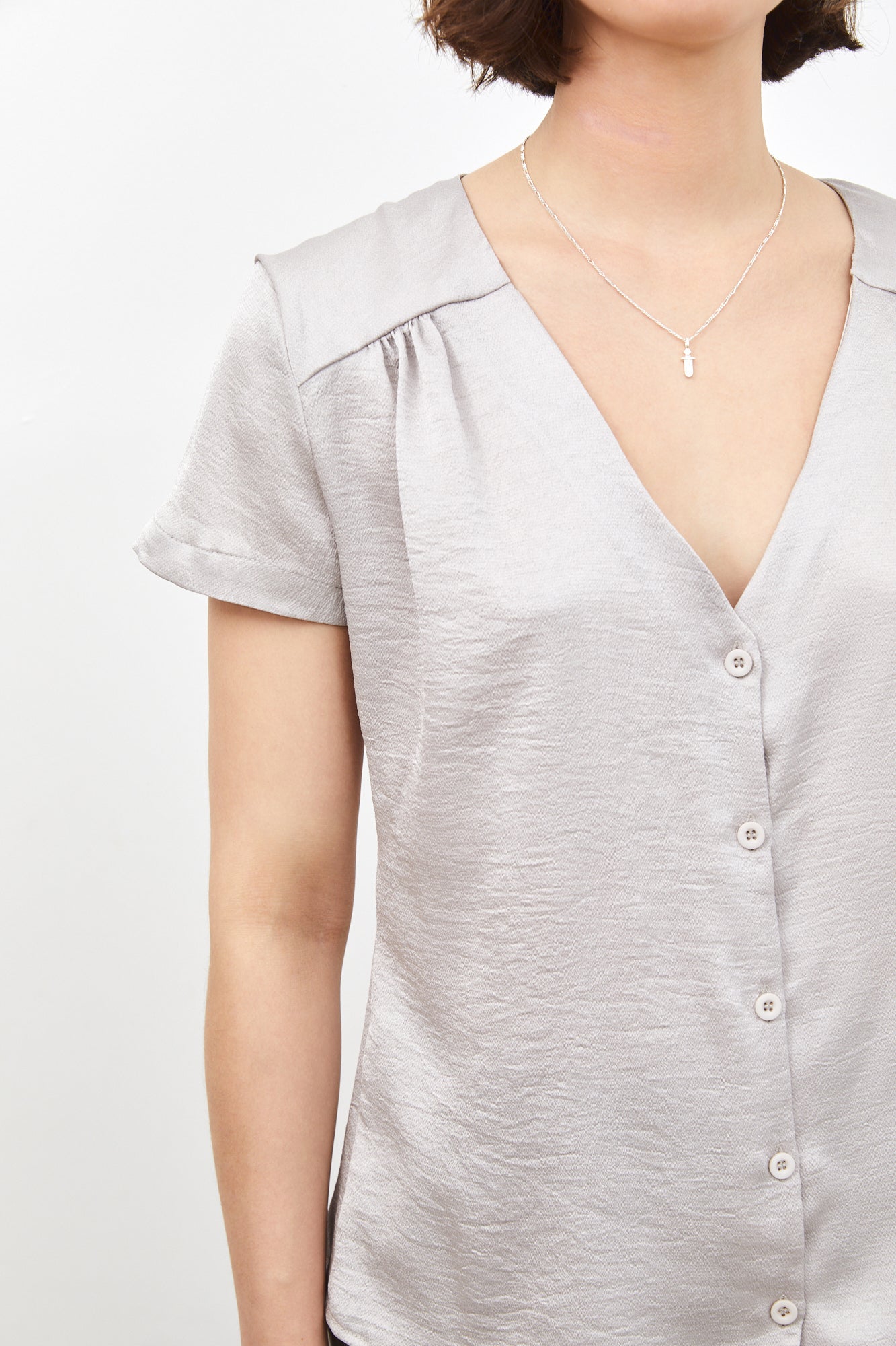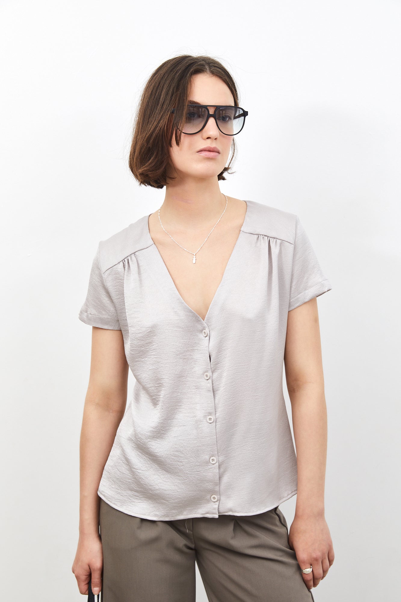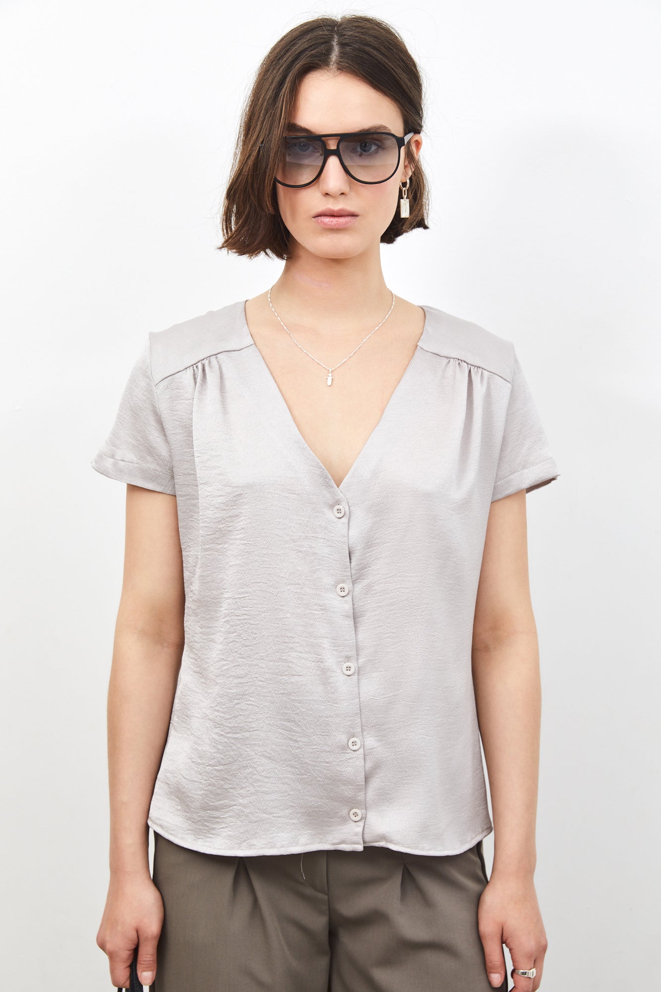 חולצה עם כפתרה ושרוול קצר, בעלת מפתח וי,  . עשויה בד סאטן מט בעל מראה אלגנטי.