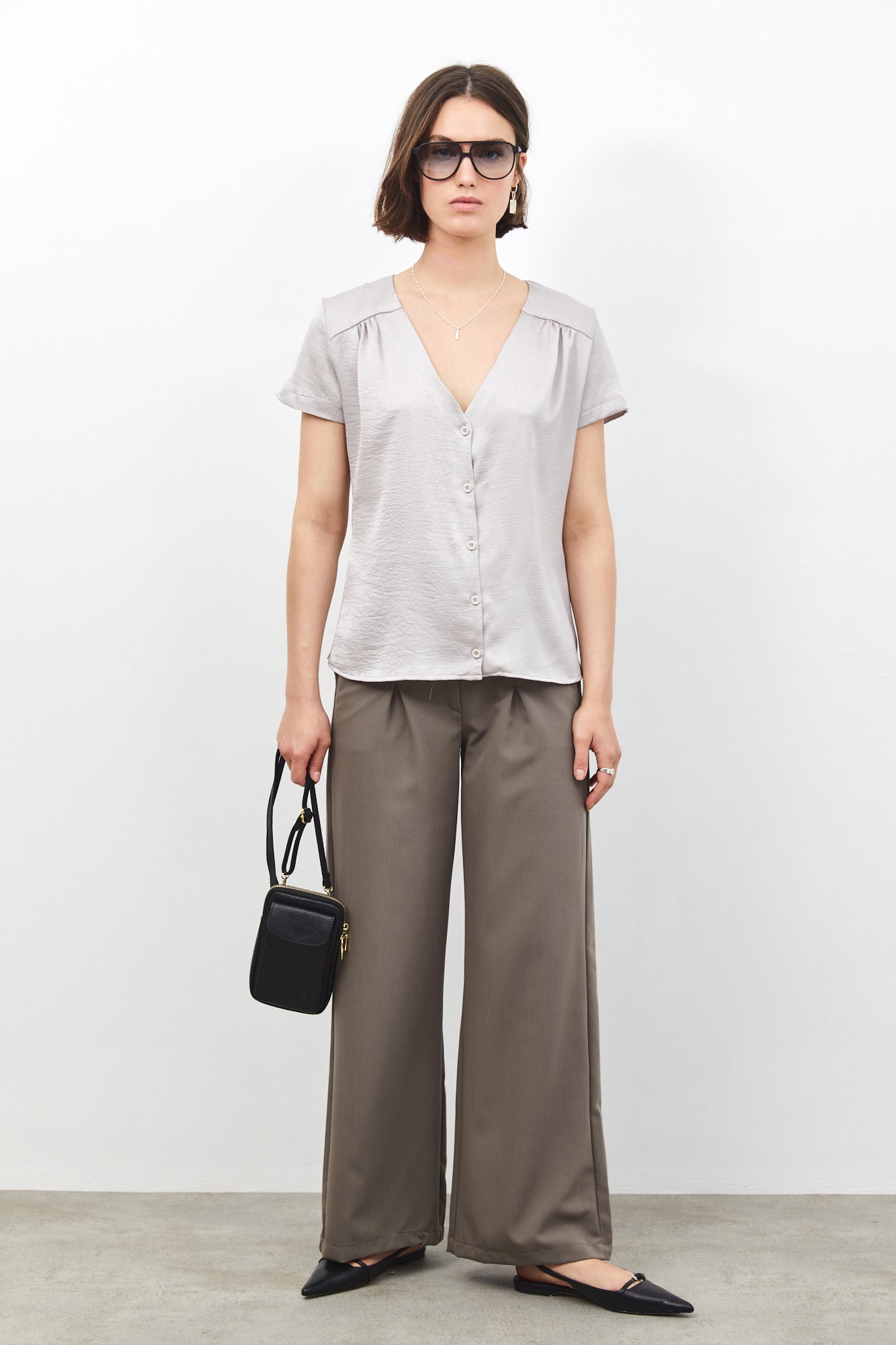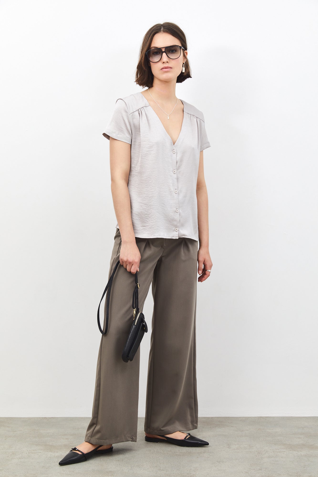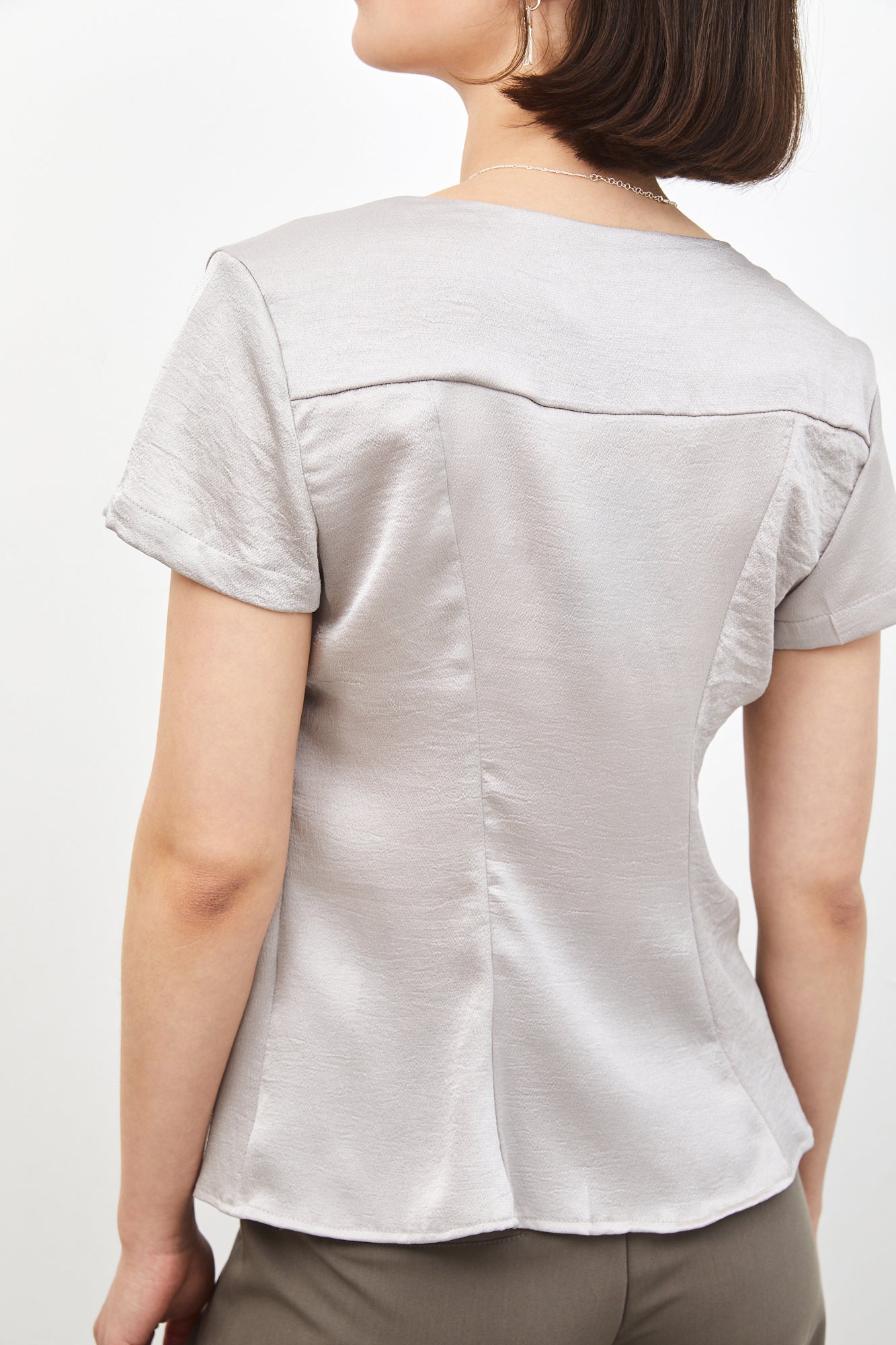חולצה עם כפתרה ושרוול קצר, בעלת מפתח וי,  . עשויה בד סאטן מט בעל מראה אלגנטי.
